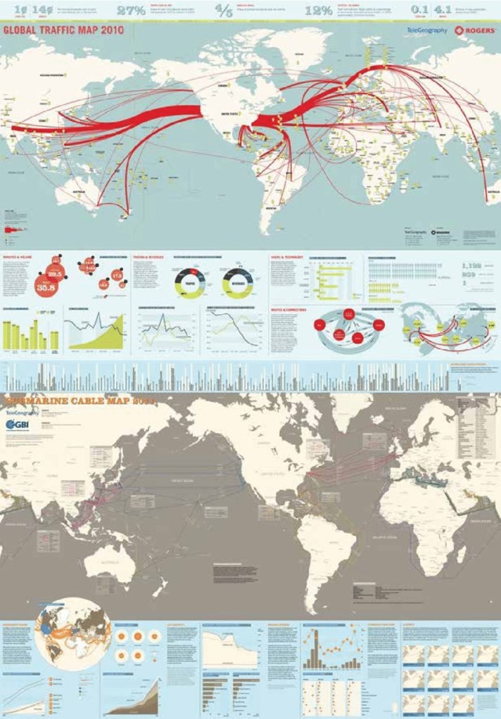 The global Traffic map of Telegeography shows the worldwide data distribution in the year 2010. The red strand, outcropping from North America is reaching every part of the world. In the ten years of our century this map illustrates the advantages of North America, Central Asia and Europe in technology, infrastructure and data exchange. How will the 2020’s look like? Will the center point of these maps shift?