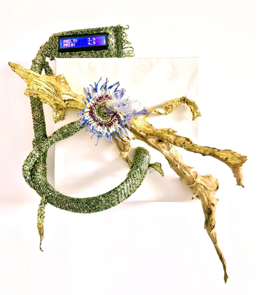 Canvas (20cm x 20cm) with mulberry paper wrapping, driftwood with gold leaf, glass beads, ESP8266 WIFI microcontroller, SDS011 fine dust sensor, AM2302 Temp and RH sensor, breadboard, wire, cable sleeves