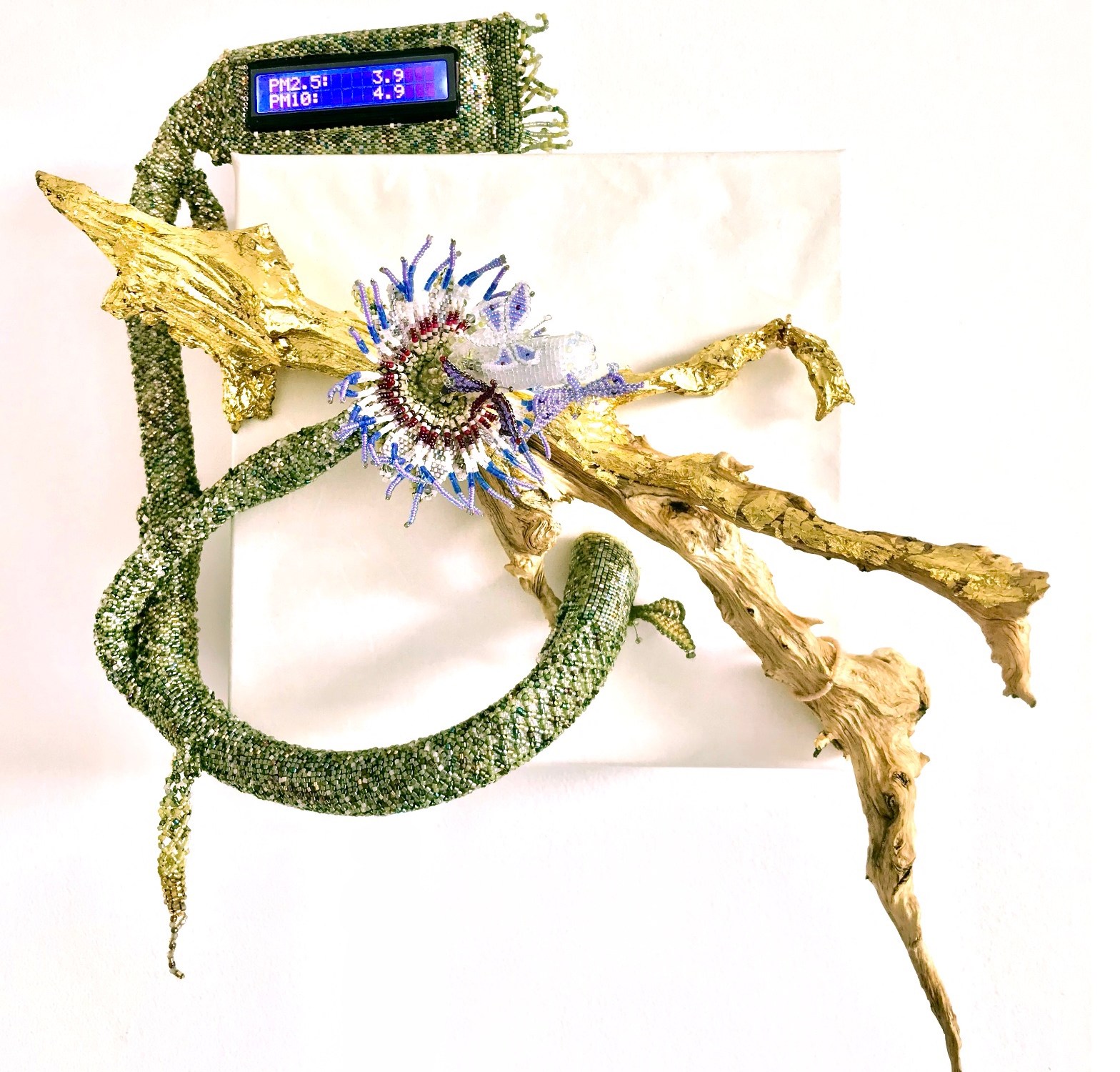 Canvas (20cm x 20cm) with mulberry paper wrapping, driftwood with gold leaf, glass beads, ESP8266 WIFI microcontroller, SDS011 fine dust sensor, AM2302 Temp and RH sensor, breadboard, wire, cable sleeves