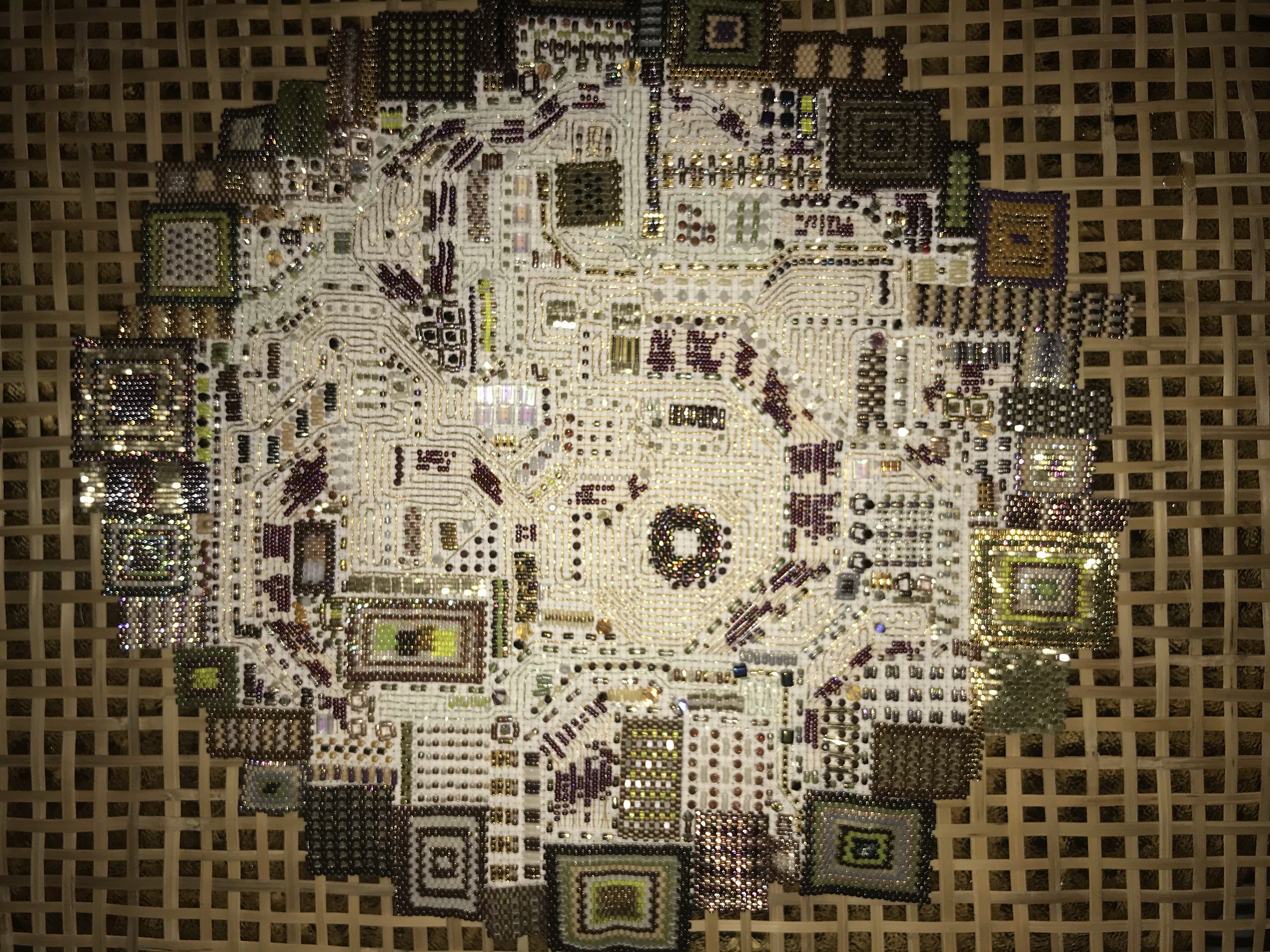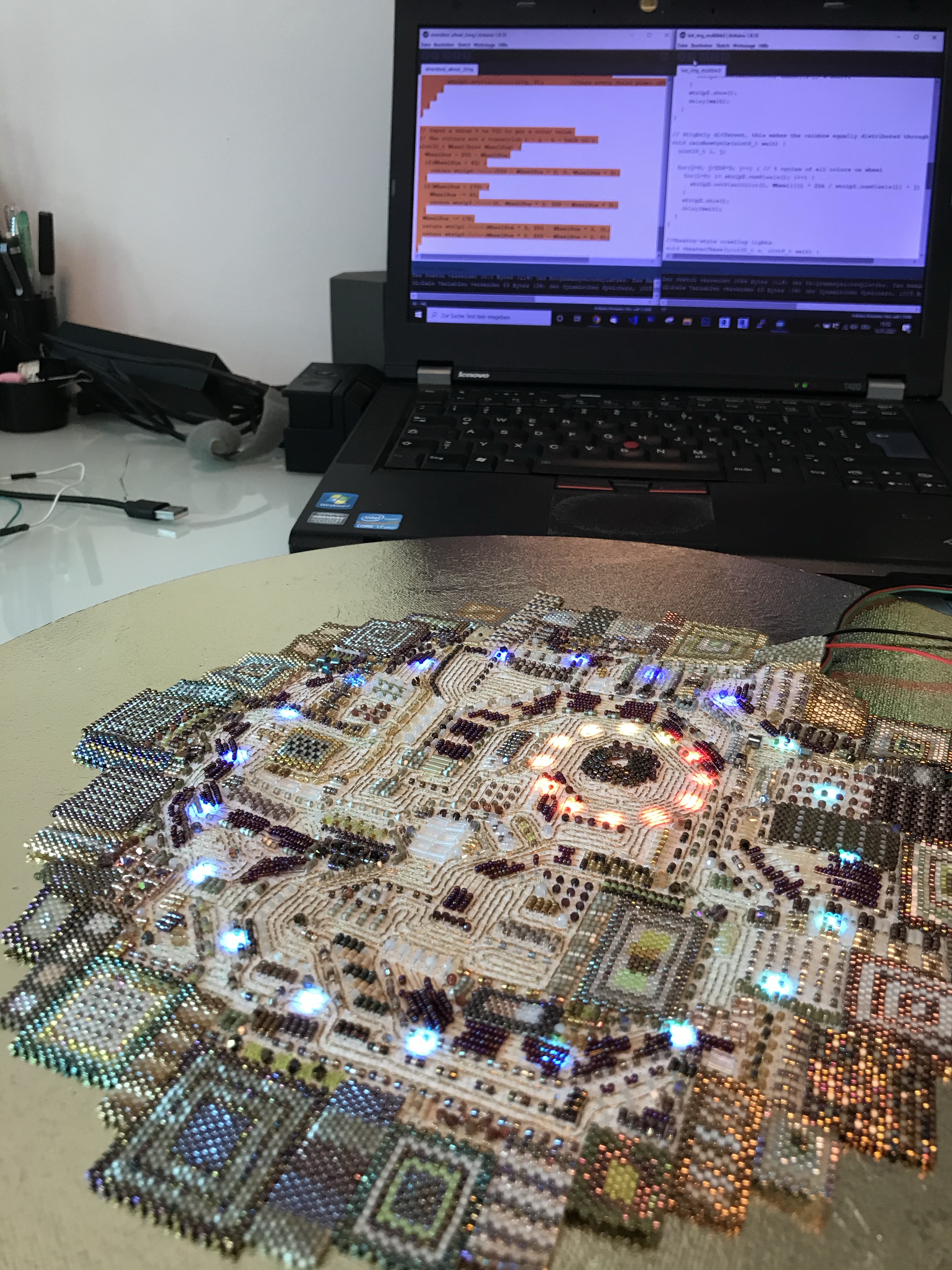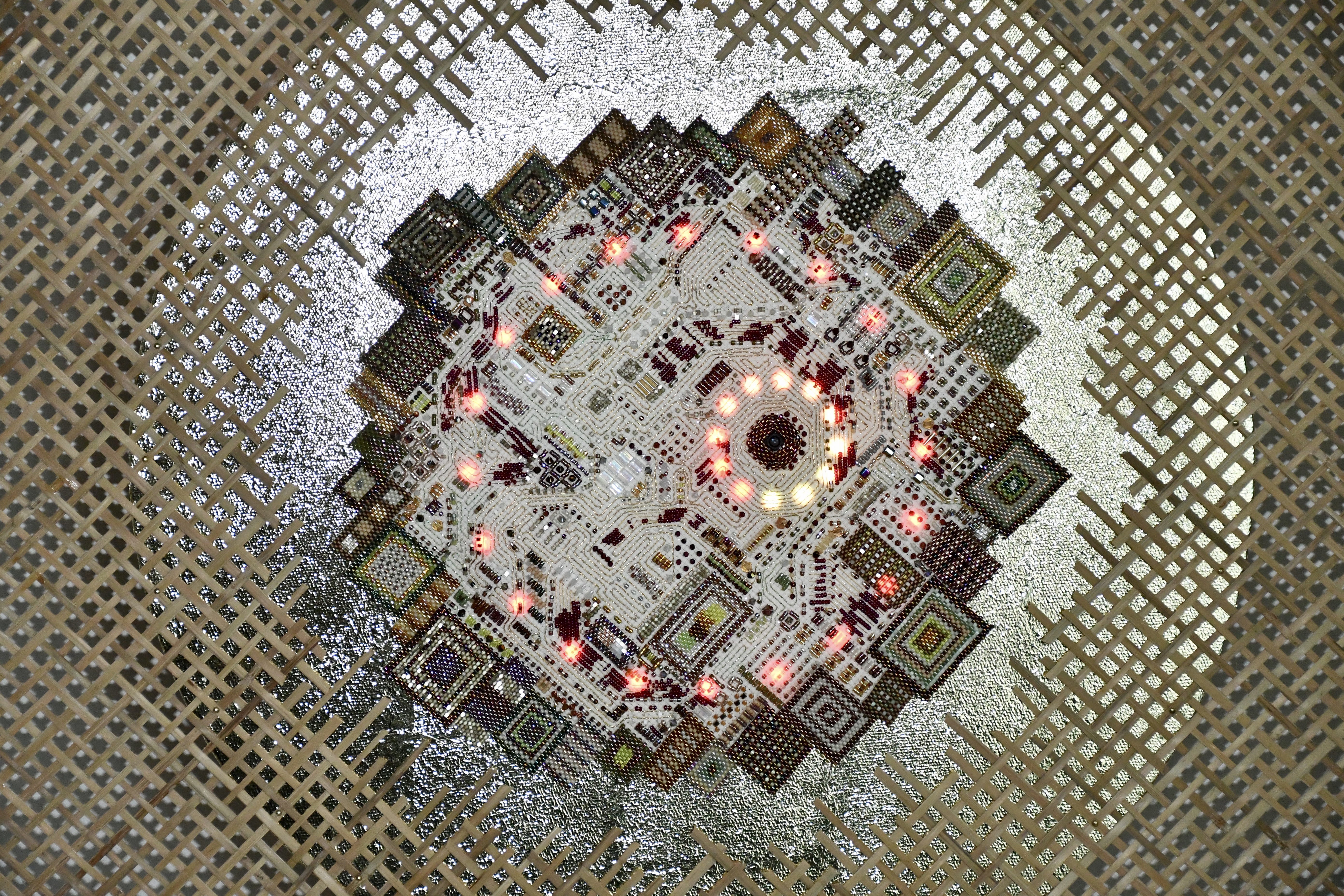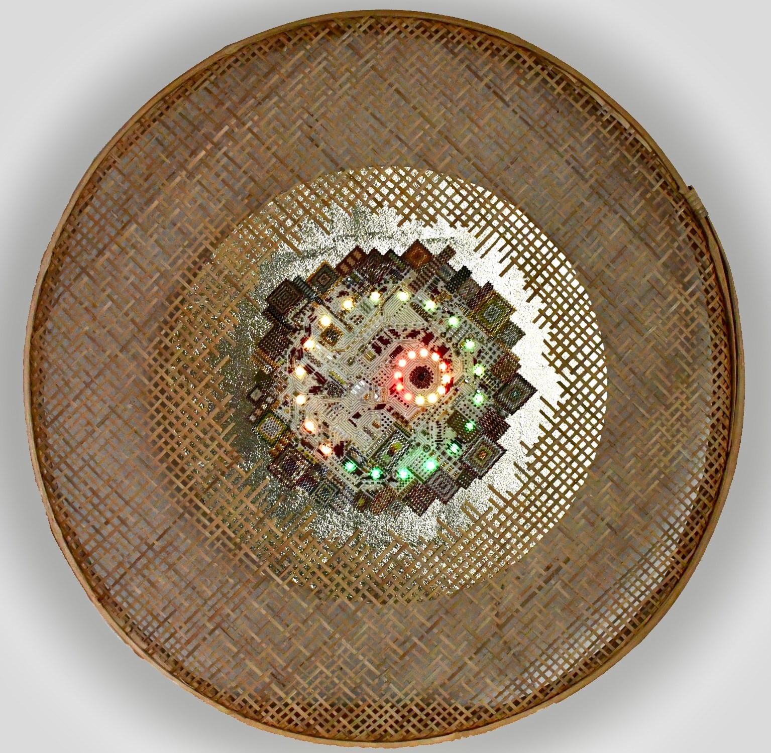 This artwork is a combination of common materials used in South East Asian art. The rattan fish tray is open-worked with a gilded canvas, a piece of textile, embroidered with shiny seed beads, crystals and a gold thread is hiding the colorful LED rings. The light show is controlled by an Arduino UNO.