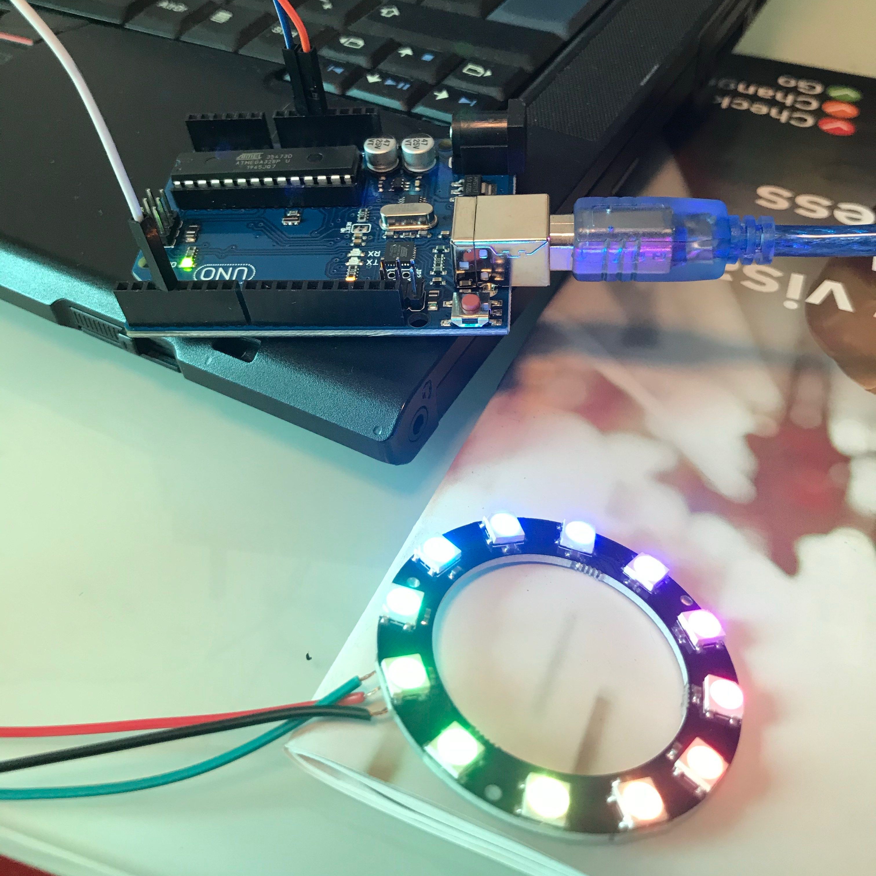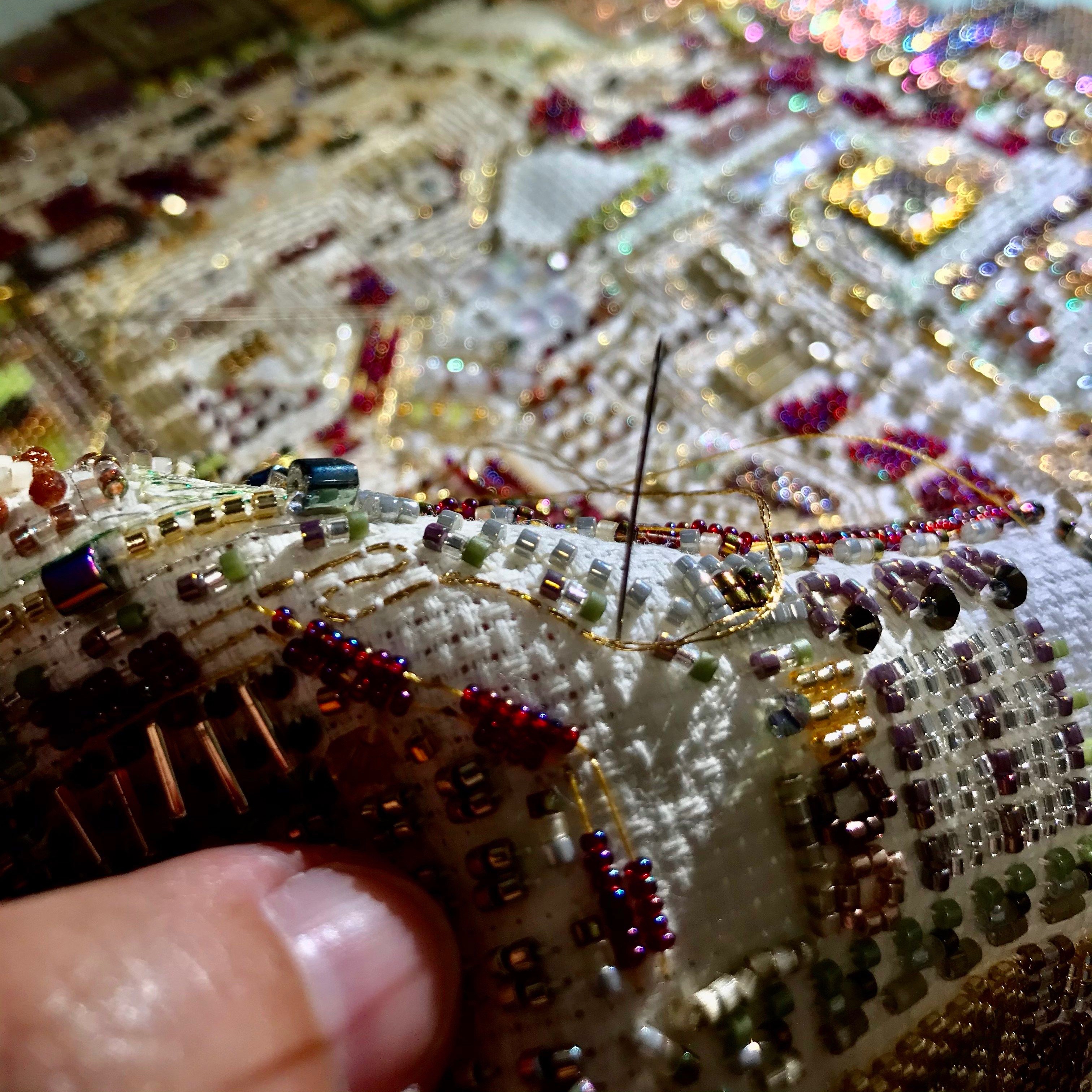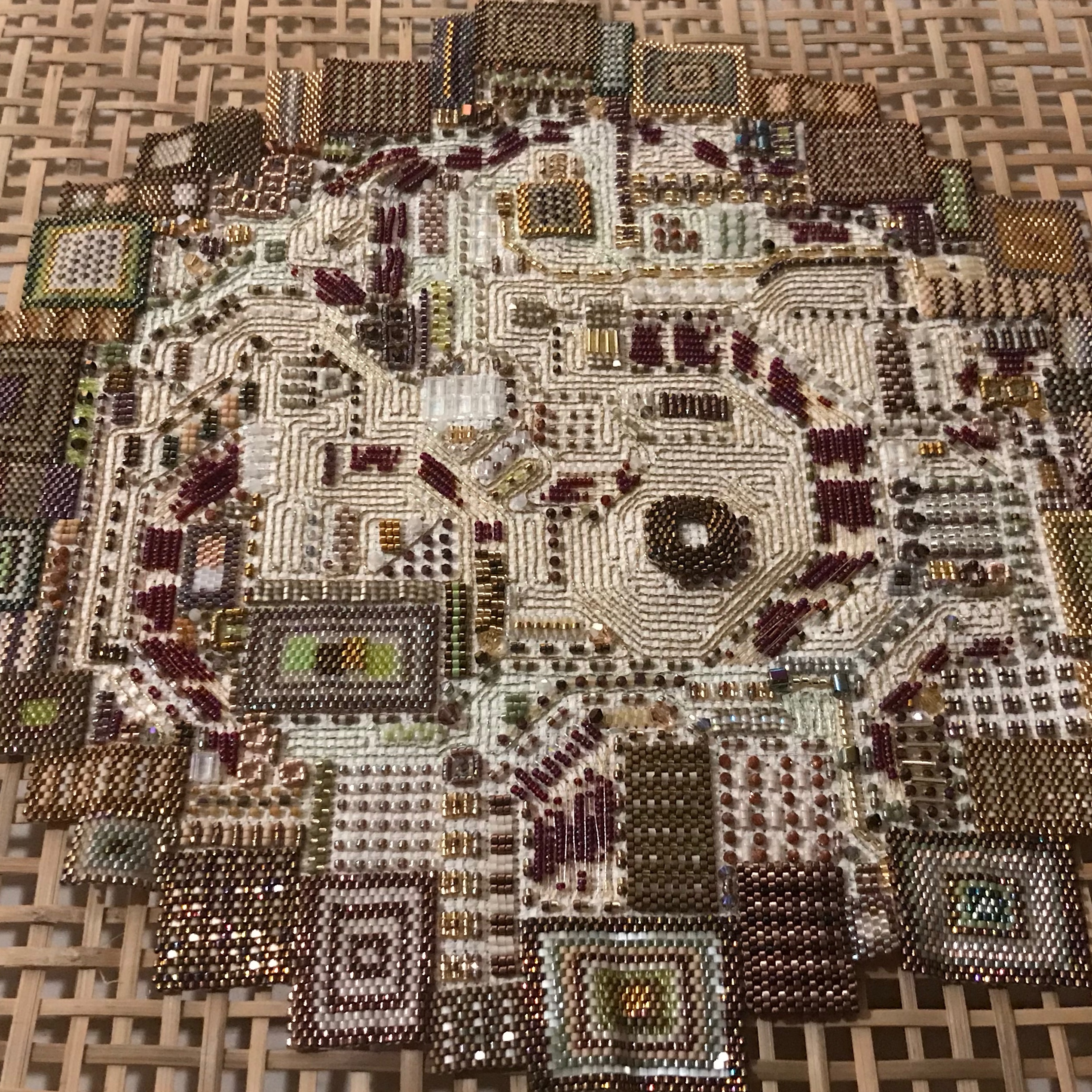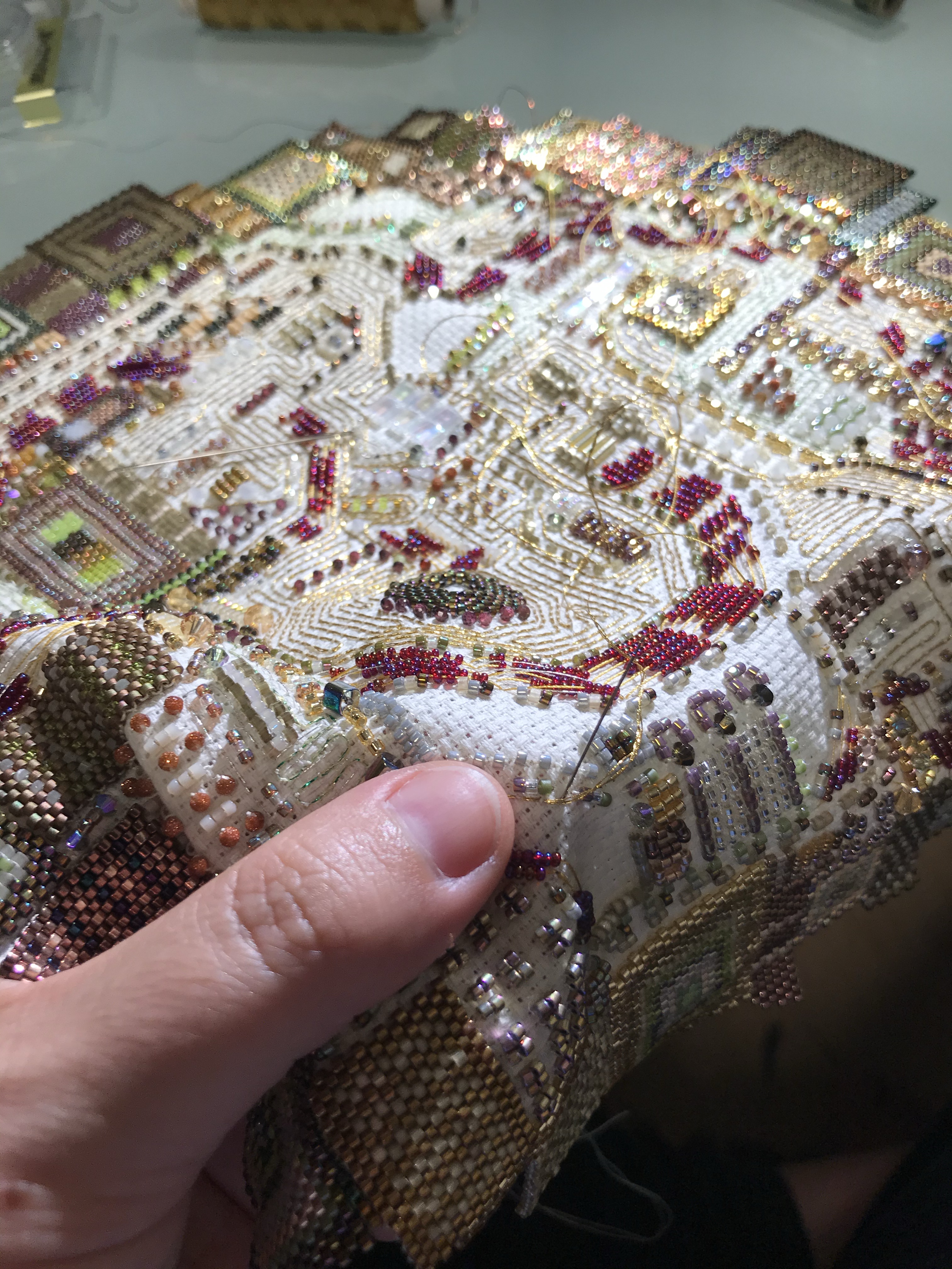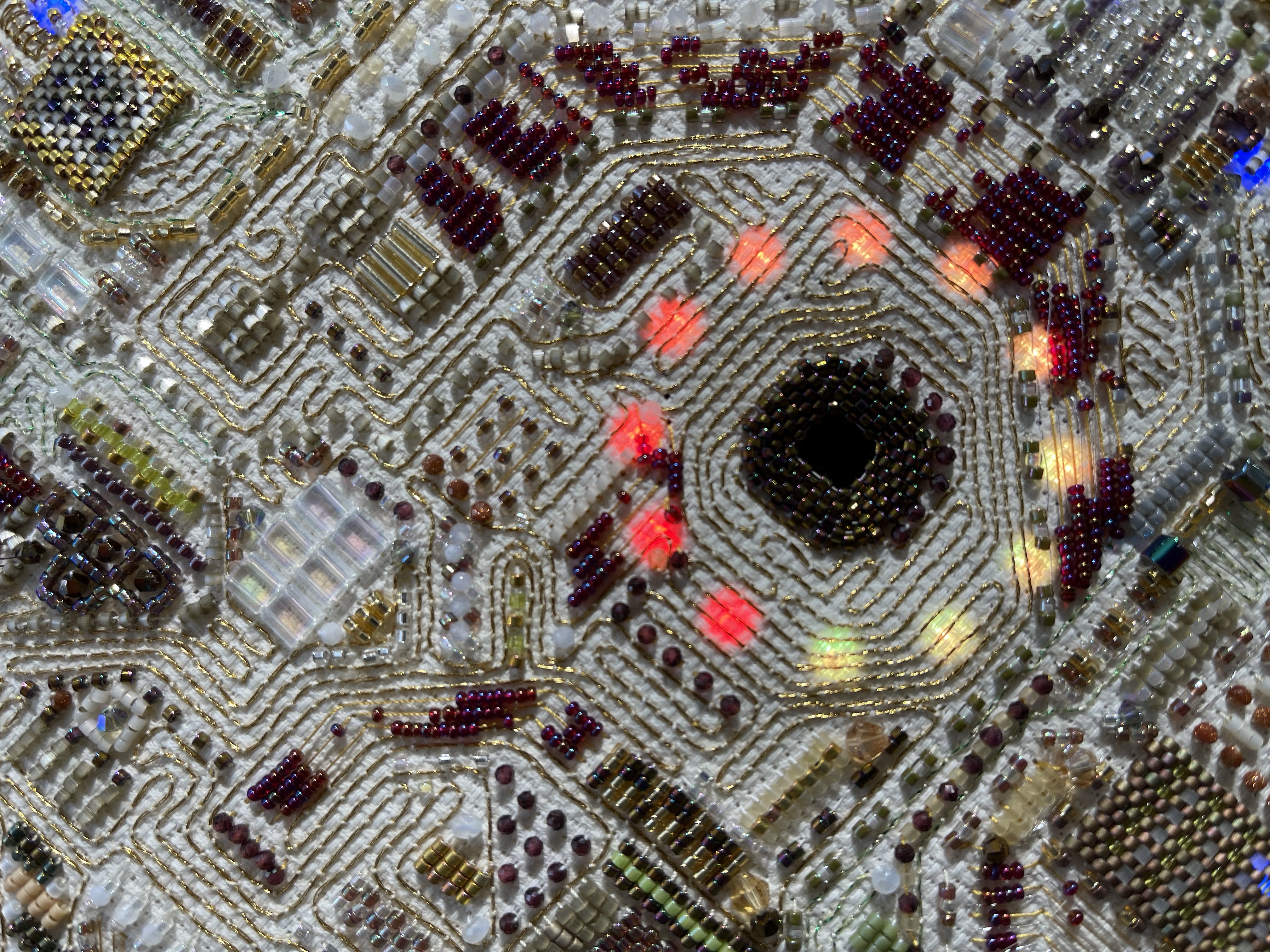 This artwork is a combination of common materials used in South East Asian art. The rattan fish tray is open-worked with a gilded canvas, a piece of textile, embroidered with shiny seed beads, crystals and a gold thread is hiding the colorful LED rings. The light show is controlled by an Arduino UNO.