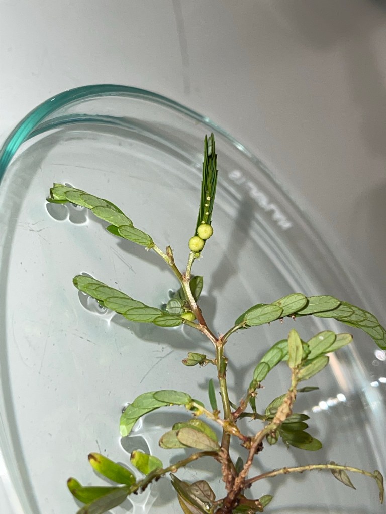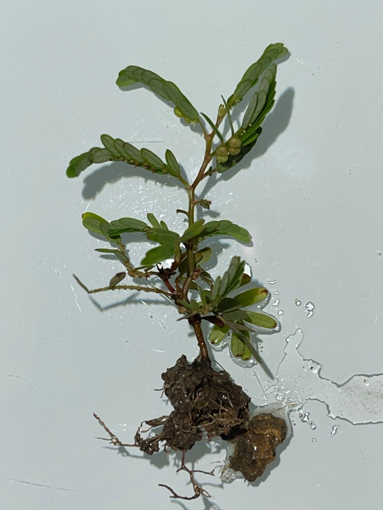 The weed I was taking from the little grass batch in front of the plaque gots my special attention. The plant is very common in Singapore. Almost on every natural field, pathway or groove this creeping plant finds it’s way to grow. When its flowering it rejoice us with little pink pompoms, if you touch or step on it, it closes it’s leaves and reopens them later. Such a joy for young children to play with. In Singapore it’s commonly called “touch-me-not” or “shame-plant”. The botanical name is Mimosa pudica.