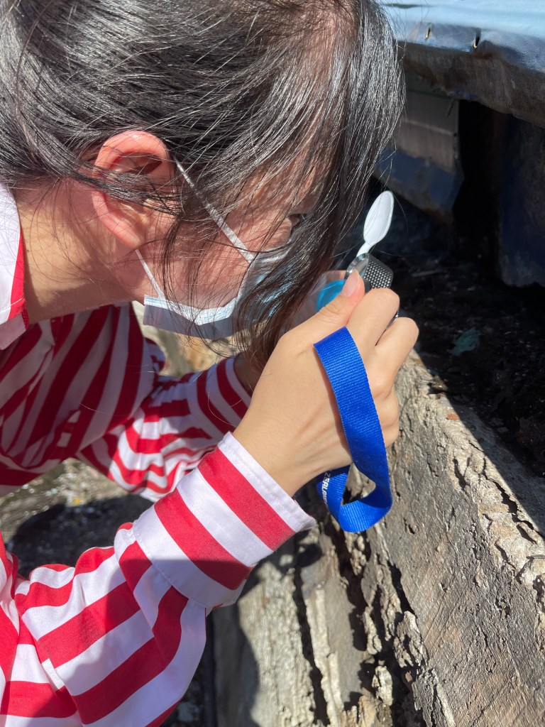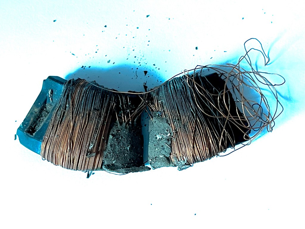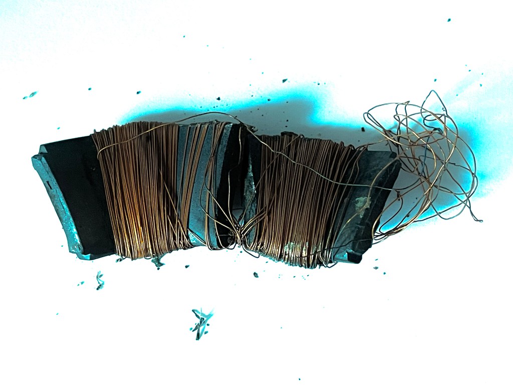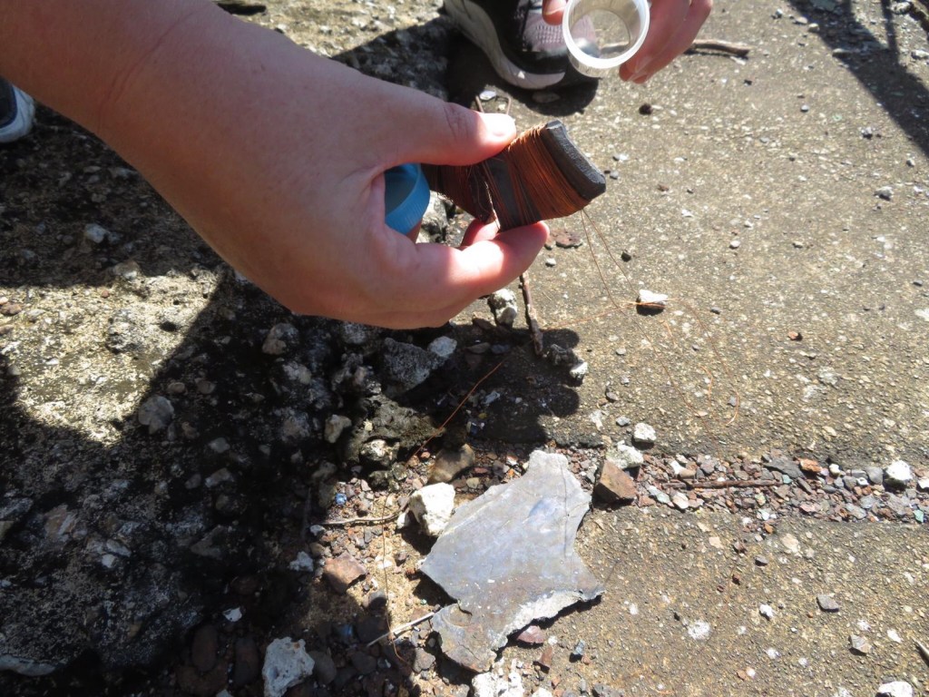 On the way back I found a copper wire that was dazzling on the ground. It was coiled up on a black item which was broken into half. This was the sample I took.