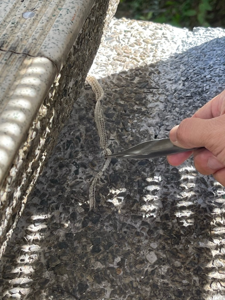 I gave Ryan my sample kid and asked him to watch out for samples. He immediately recalled that he saw a snake skin on one of the stairs, that nobody else of us recognized.