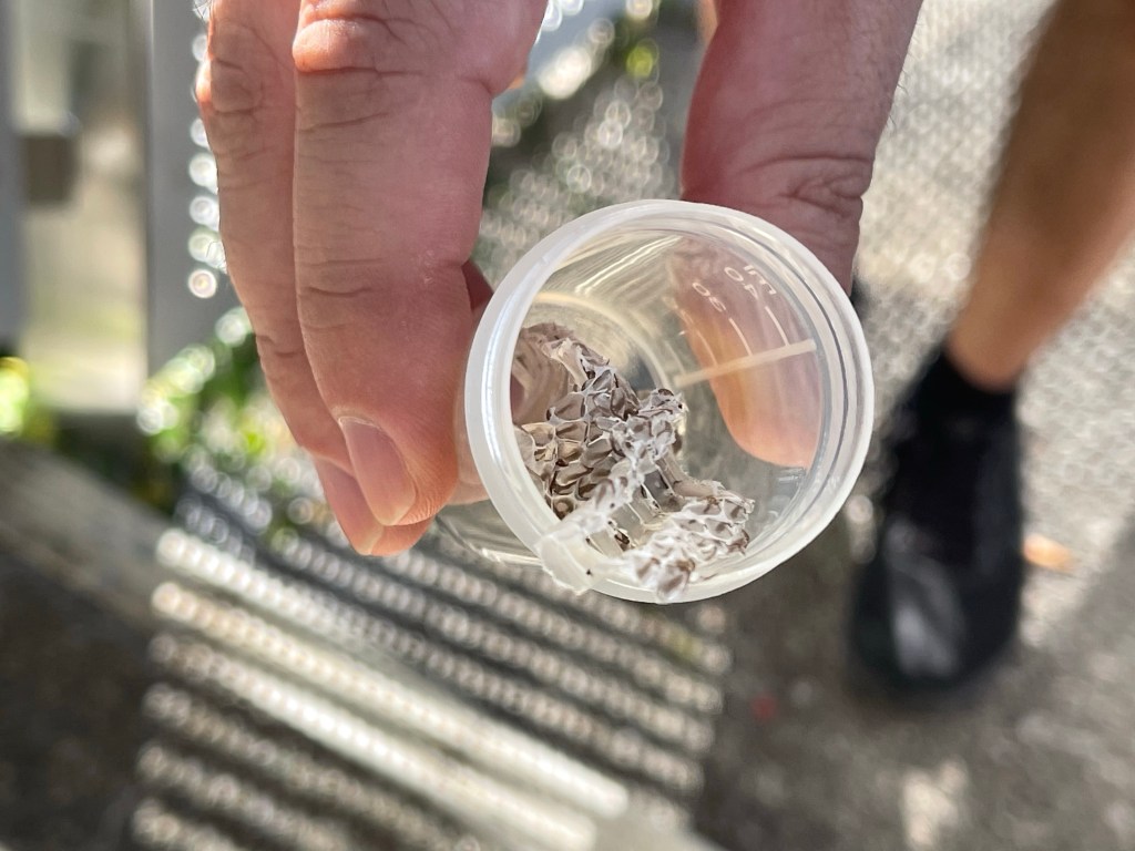 With tweezers Ryan and Sven tried to pull off the snake skin from a corner between two stairs. Carefully they put the almost transparent snake skin into a sample container.