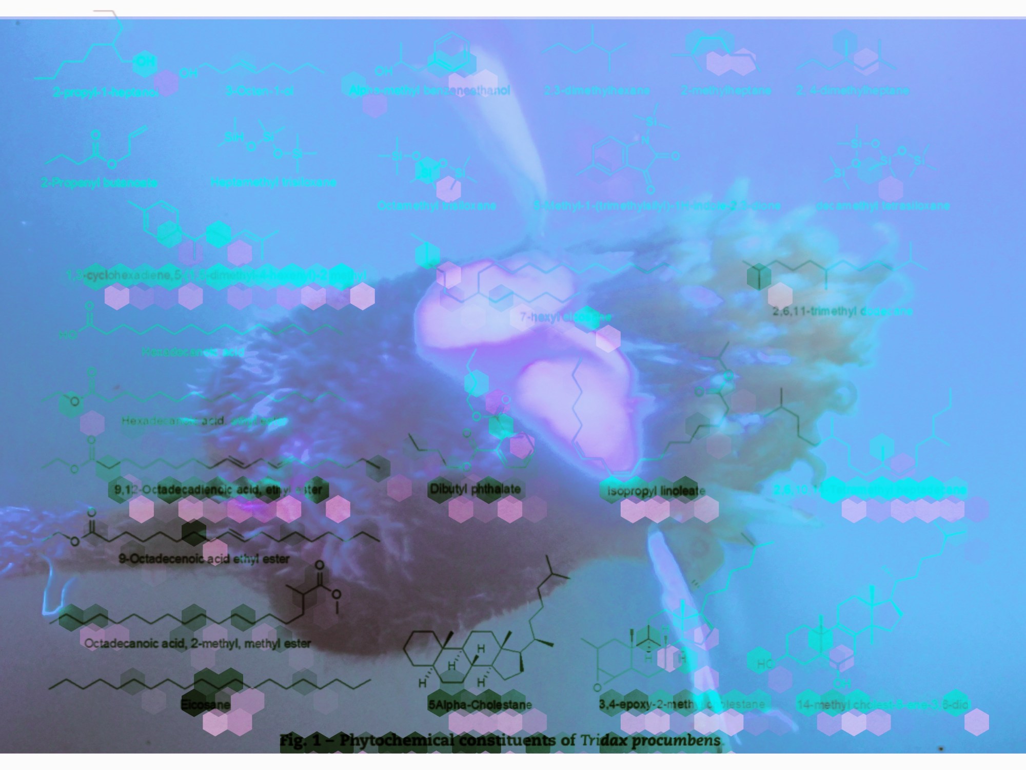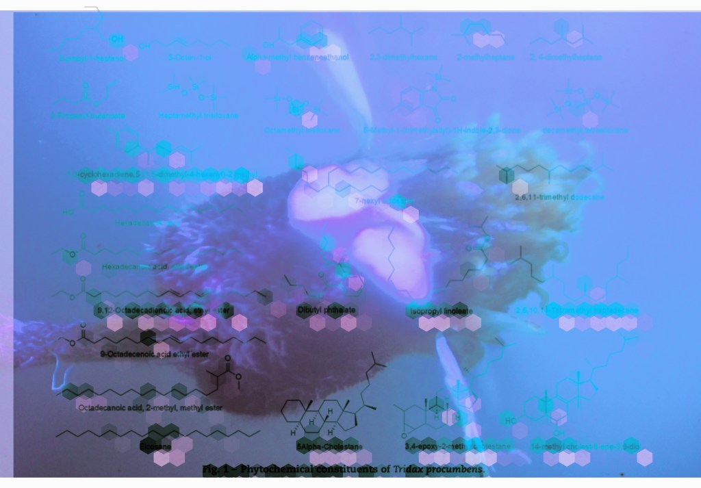 For the artworks I combined the impressions of that day. I used pictures of the Tridax procumbens flower and combined it with the structural formulas of the GCMS analysis of the bio active ingredients from the Policegoudra et.al 2014 paper and fused the flowers with pictures of the refinery and the container company.