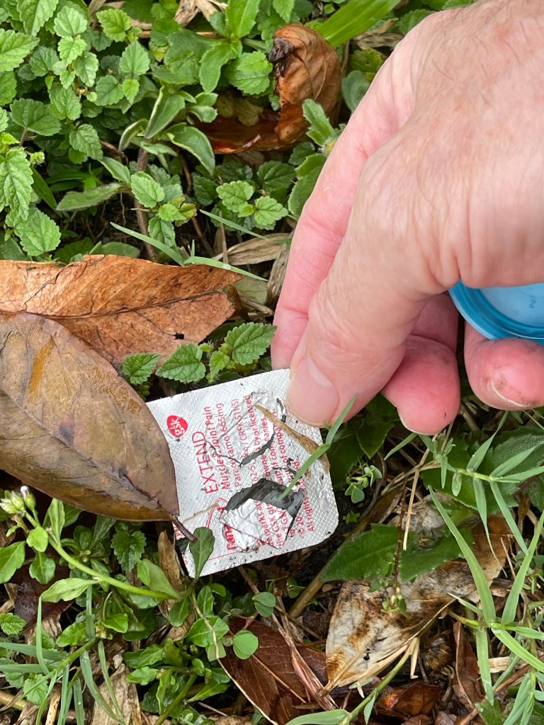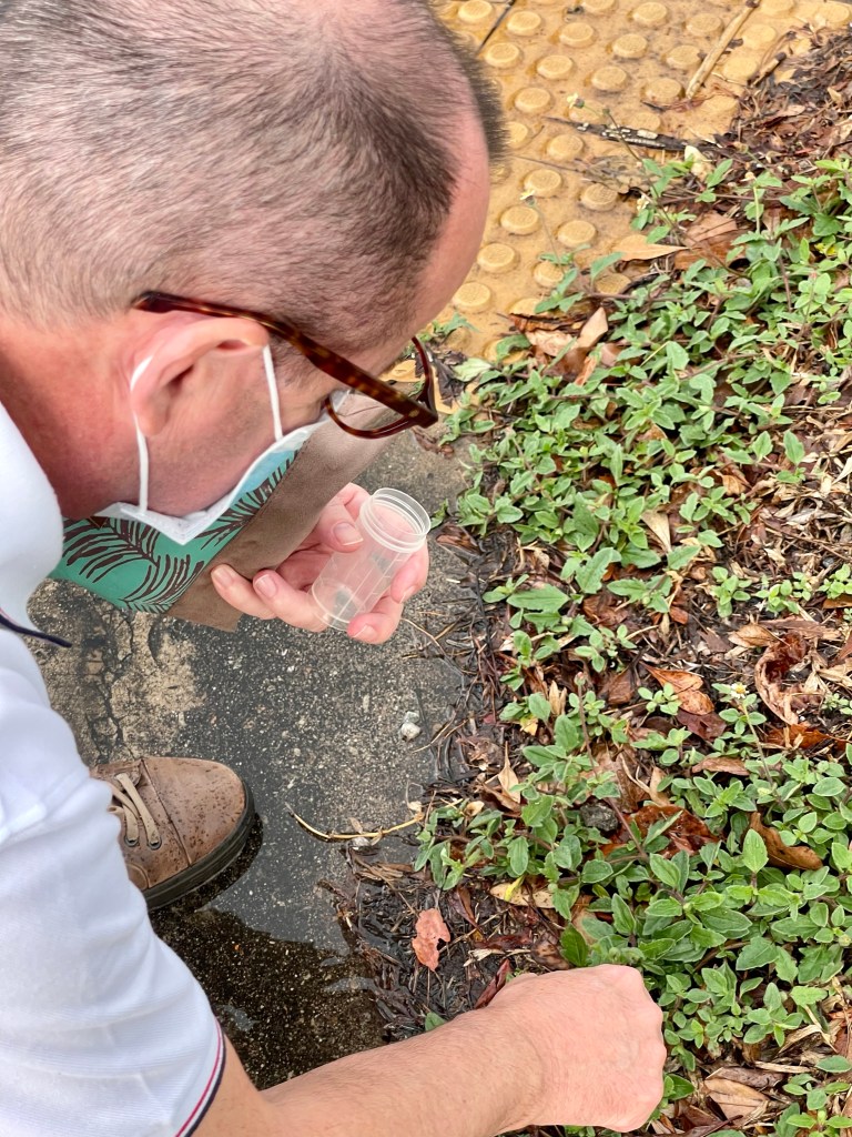 Pierre’s attention fell immediately to some tridax daisy that were growing in the grass patch. He sampled some of them with the words, “they belong here”. Afterwards he sampled some rubber, iron junk and a pharmaceutical package from a joint pain drug. By stuffing them into a sample container he said: “These things don’t belong here!”.