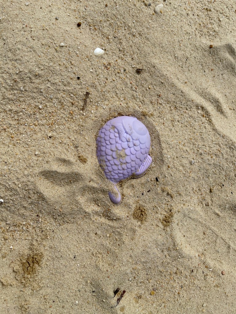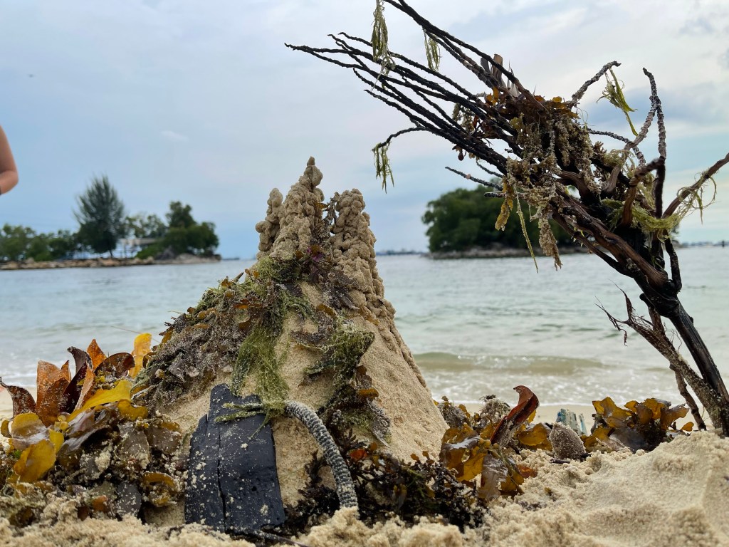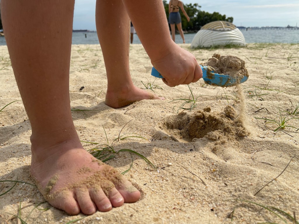 We entered the beach and scanned the QR code with the Trace Together app. We could smell the salty air through our face masks. I haven’t seen Jane since our last coordinates #25_SPIRIT and #81_KEEP CALM AND LOVE PENGUINS. We stepped out of our shoes and walked barefooted in the sand down to the water. Only a few other people were on this usual always overcrowded artificial beach. We walked and talked, suddenly we had to stop on a blue fence. I asked the nearby lifeguard whether the other part of the beach is closed and he told us that we would need to walk back all the way and enter from the street into the other segment. When we reached that entrance we scanned the next QR Code and walked down to the site where a small bridge connects the outer island. This would have been the closest point to our coordinate. Another lifeguard pointed with a sharp whistle out, that the small bridge is closed and we couldn’t enter the island. Exhausted from the heat and sun, pandemic restrictions, work and HBL we were sitting in the sand, watching the ships moving by at our far coordinate. We checked out the beach. Anna found a purple fish sand mold, Jane was collecting snow-white shells. I collected a sample of the yellow fine sand.