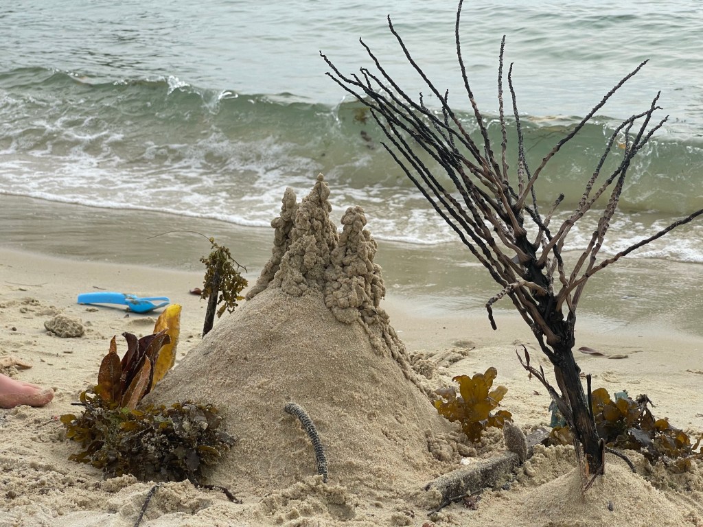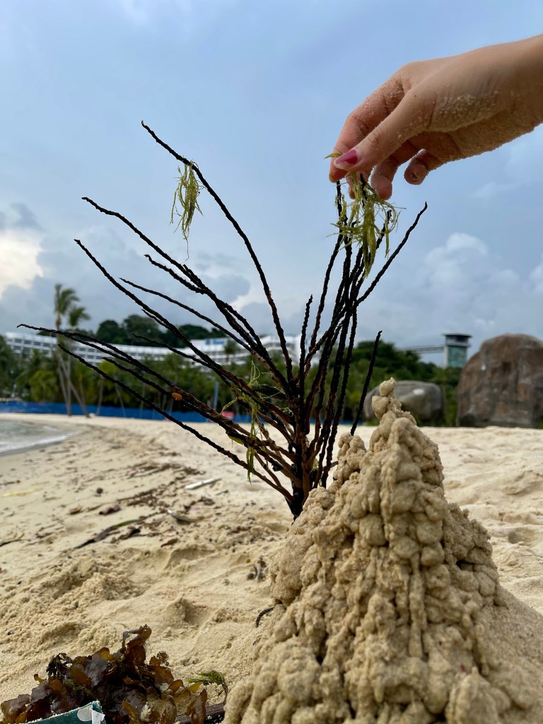 We started to build a sandcastle and found lots of algae, sticks and seeds to decorate. At the end it was totally overloaded and looked like a mountain surrounded by a green valley with an enchanted forest. We called it 许愿山 (Xu Yuan Shan), the wishing mountain. So we made a wish. The girls weren’t eager to tell me them] wish that day, maybe because they knew I would share it with you in the blog. For me, of all you could wish in this extraordinary times, the empty party island Sentosa made me realize that we are lacking one essential thing through this pandemic. That’s why I wished for a extra portion of Happiness.