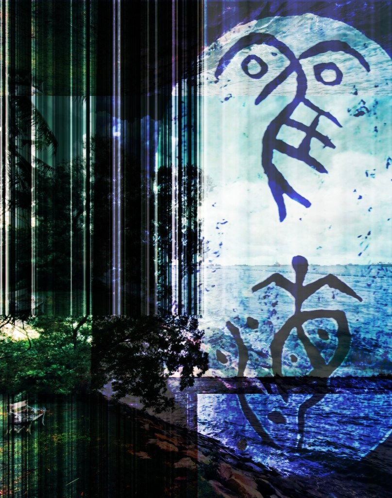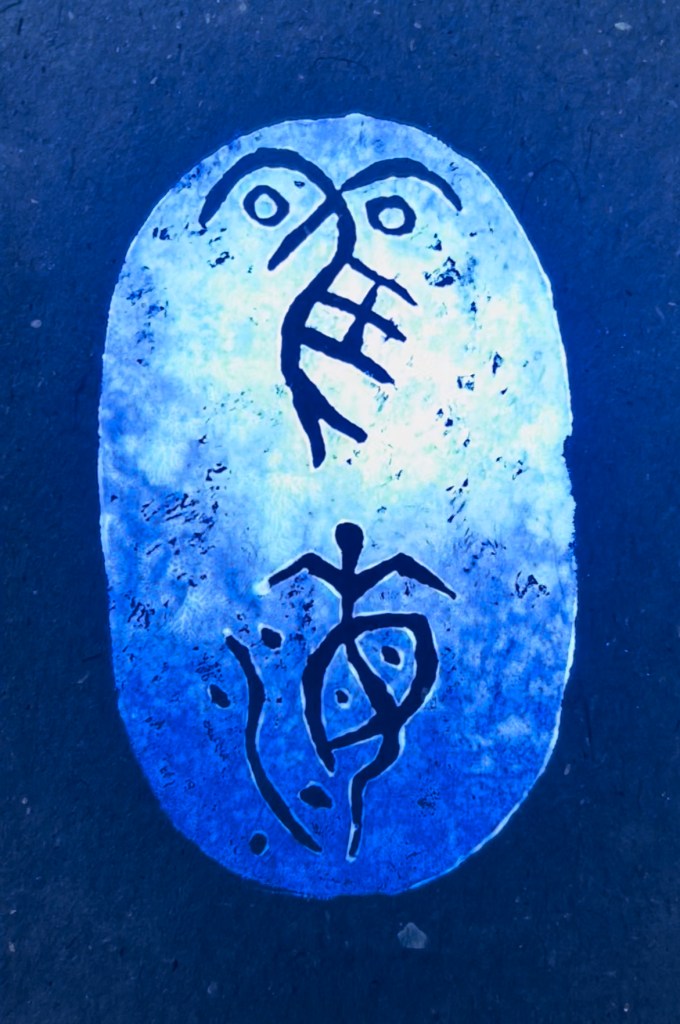 I carved the the characters into linoleum and printed them on dark blue shell paper with white UV- fluorescent acrylic color.