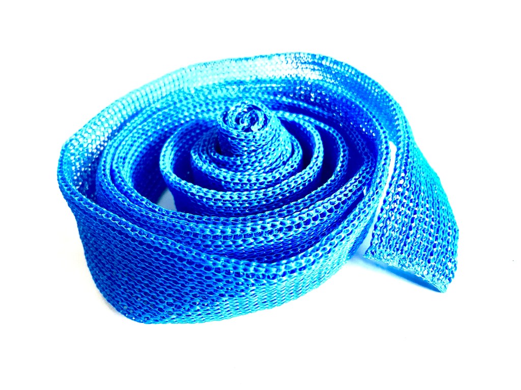 The blue mesh is made of a polymer linear thread, crochet woven into a hose or sleeve.