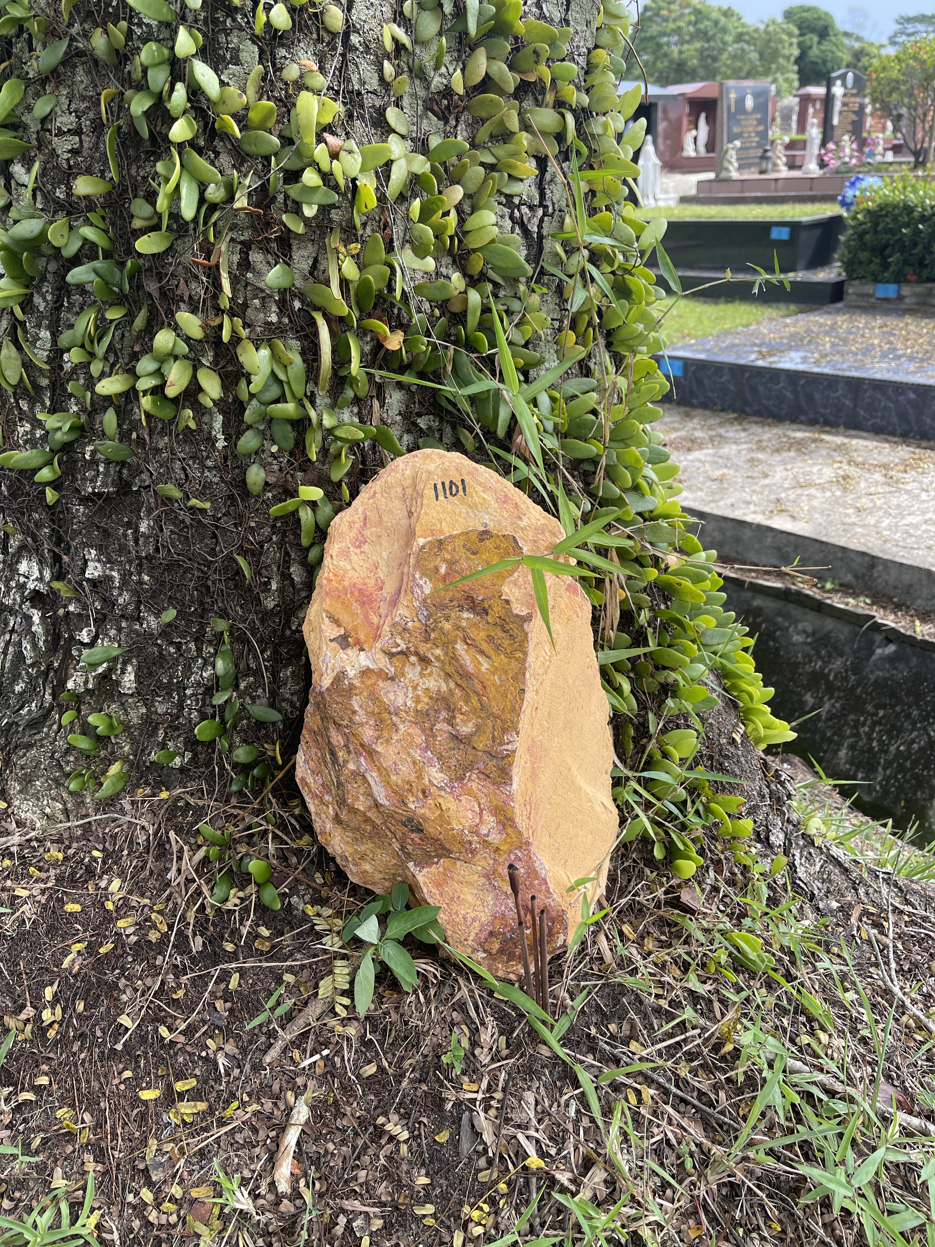 After the sampling we waked along the Old Chang Kee road and discovered lots of interesting things. There was a textile fragment on the roadside but it wasn’t made of fiber and we also saw a mock-tree, which I learned is to train your hiding skills.