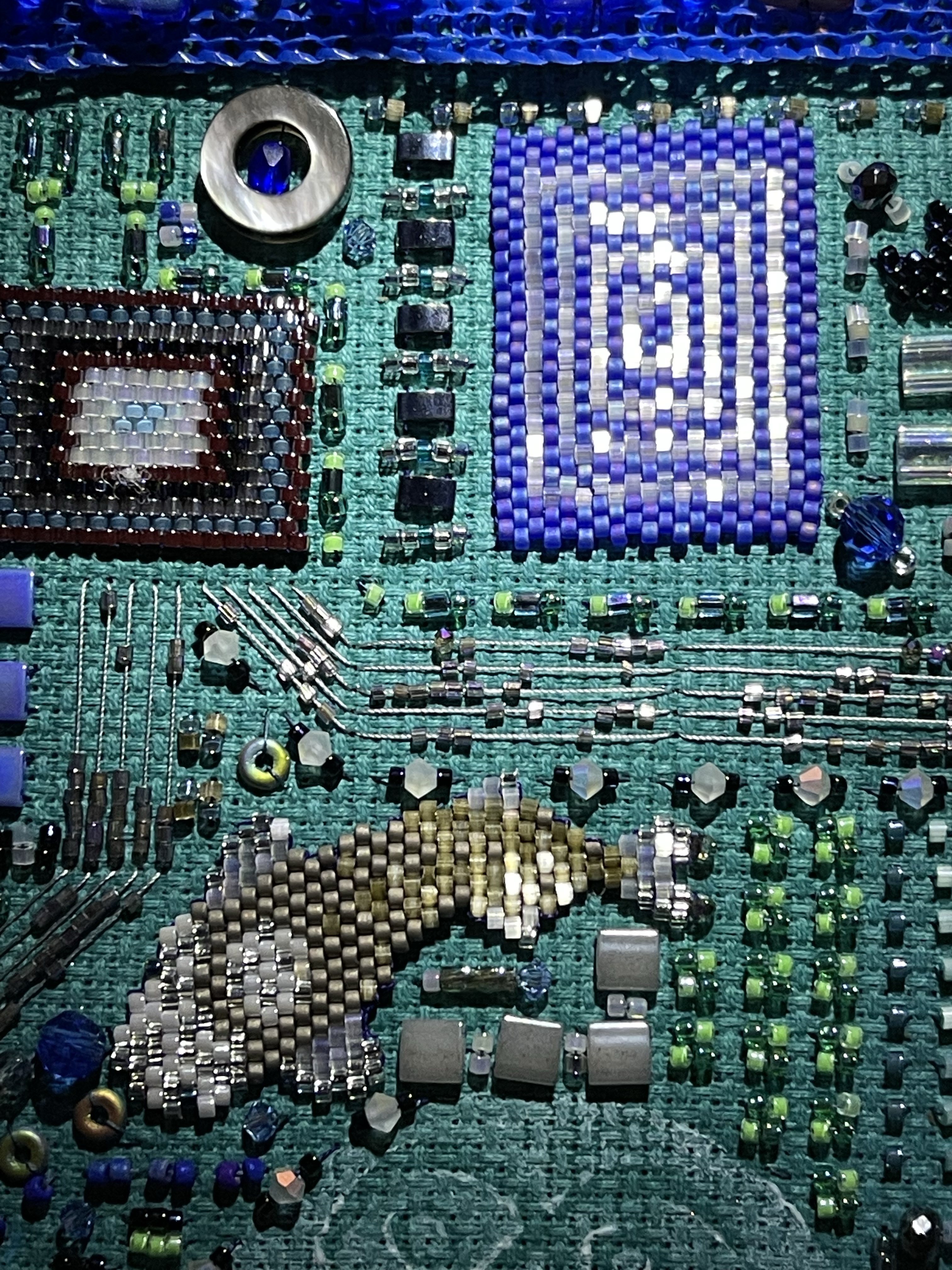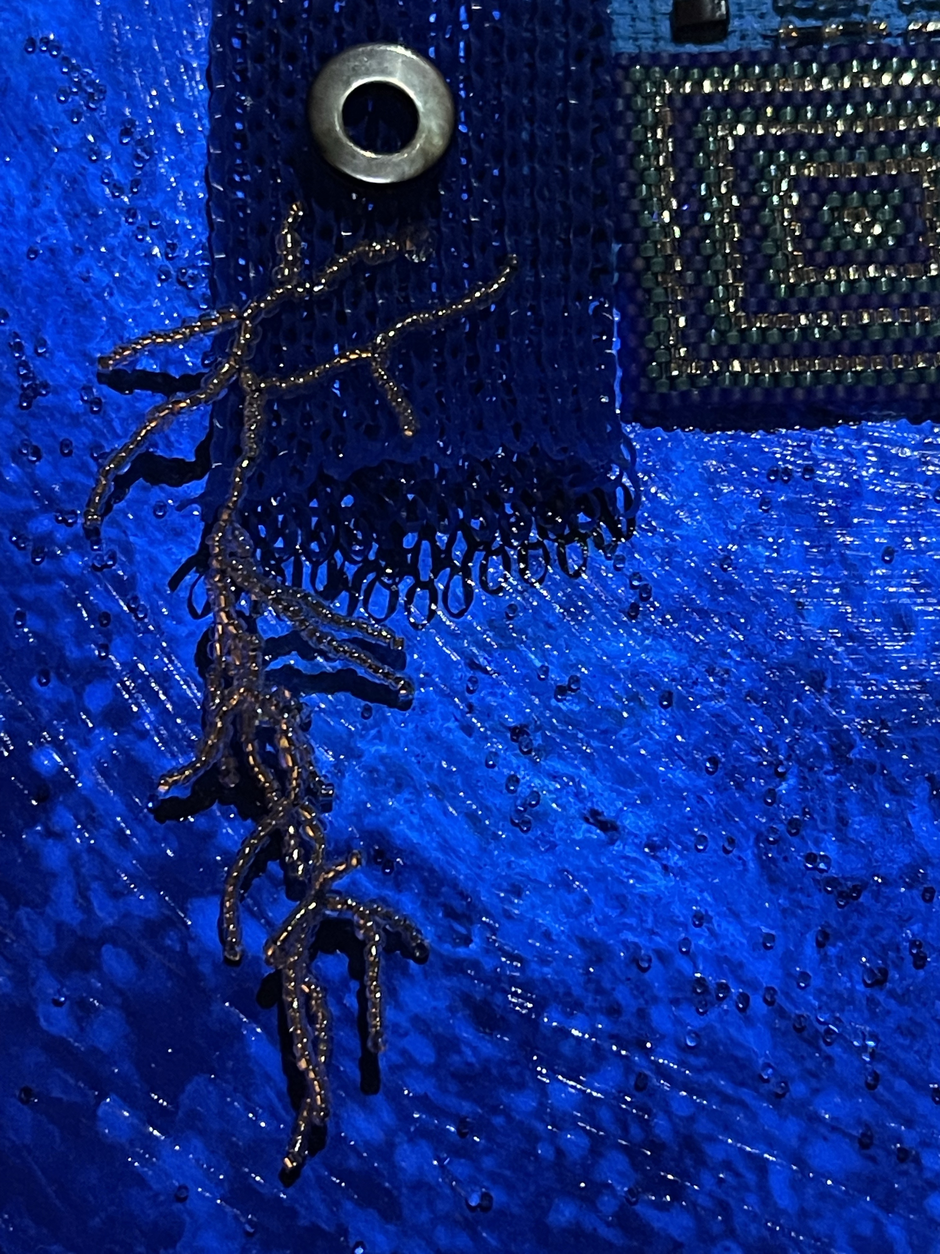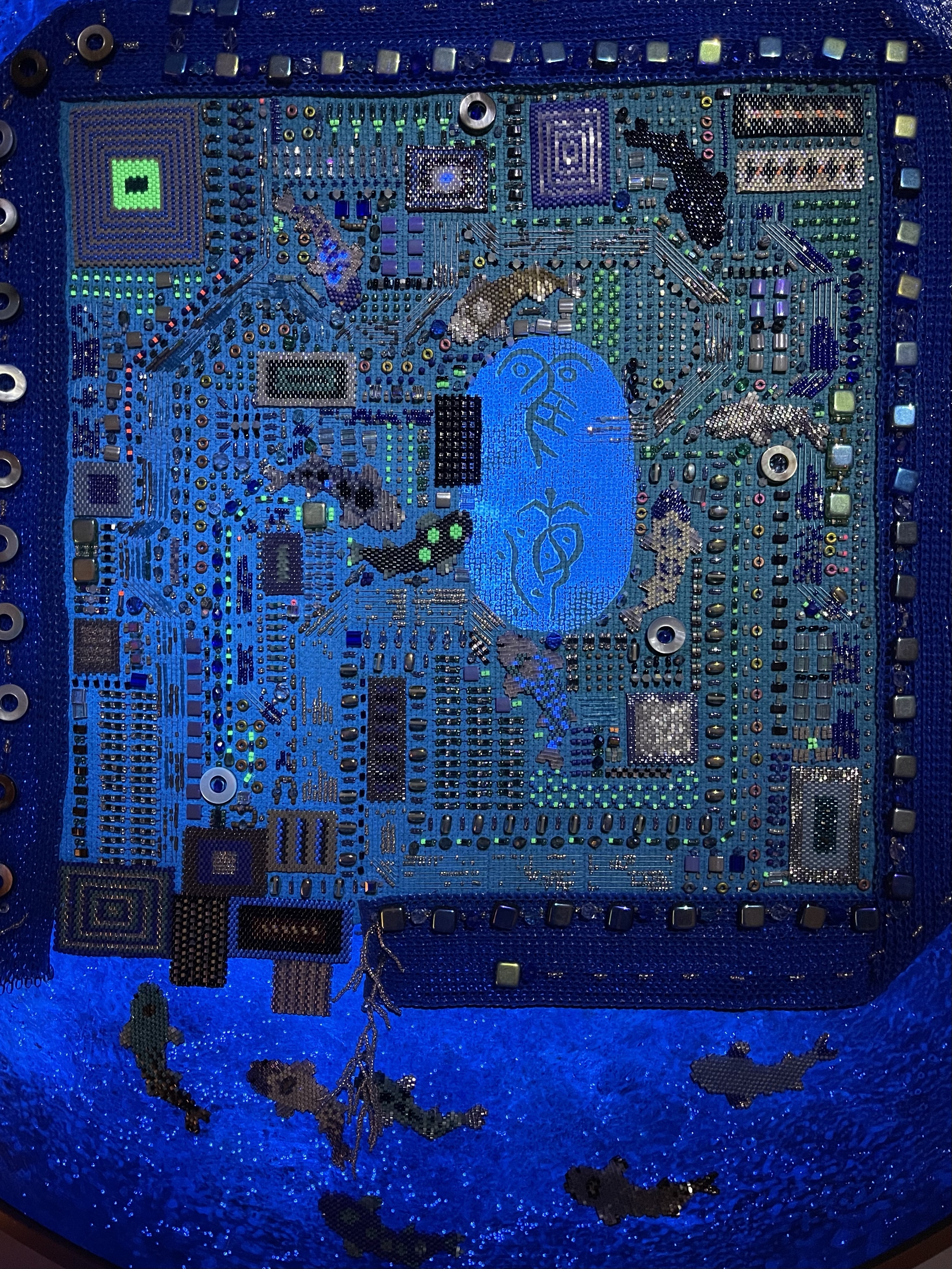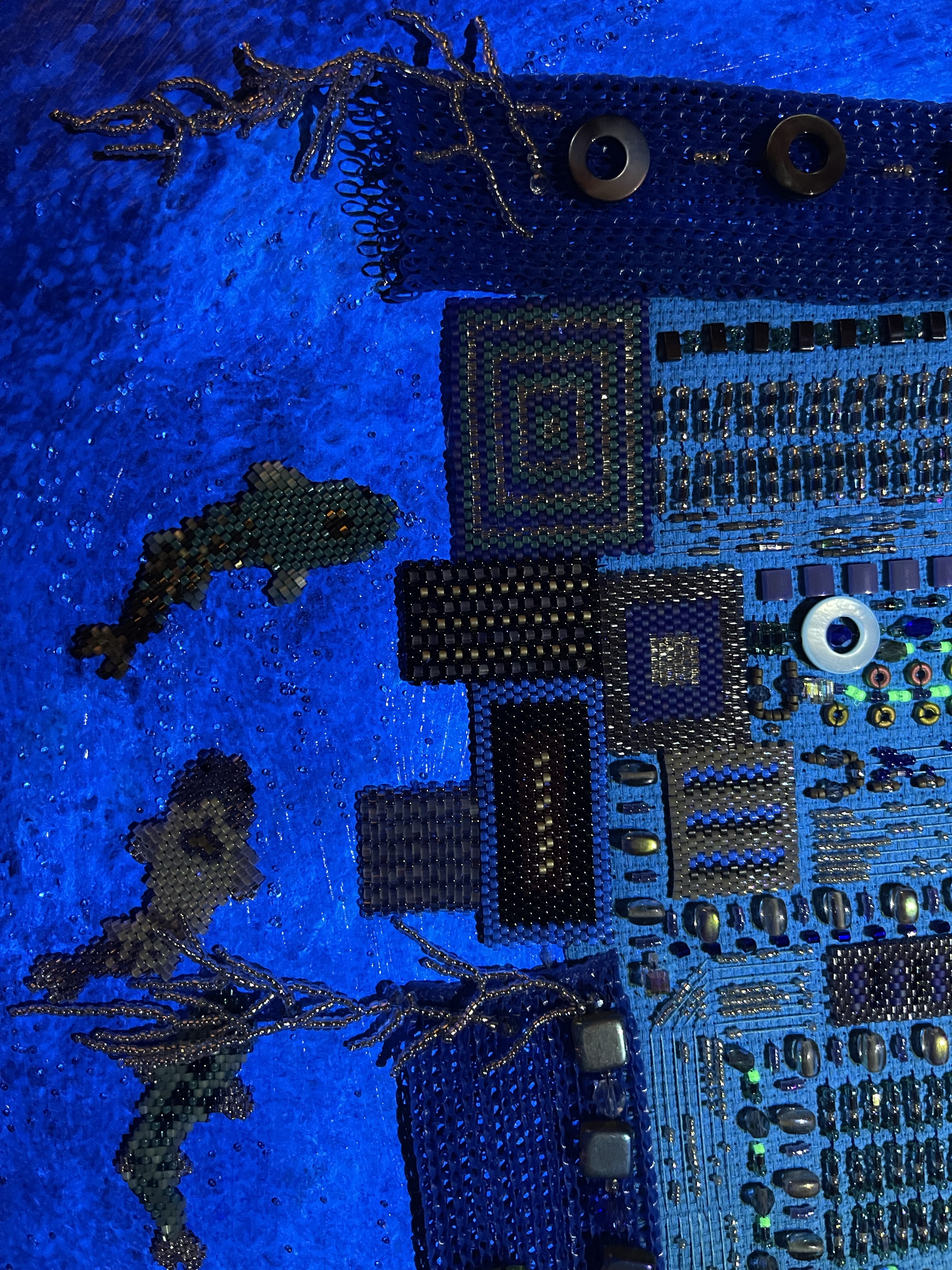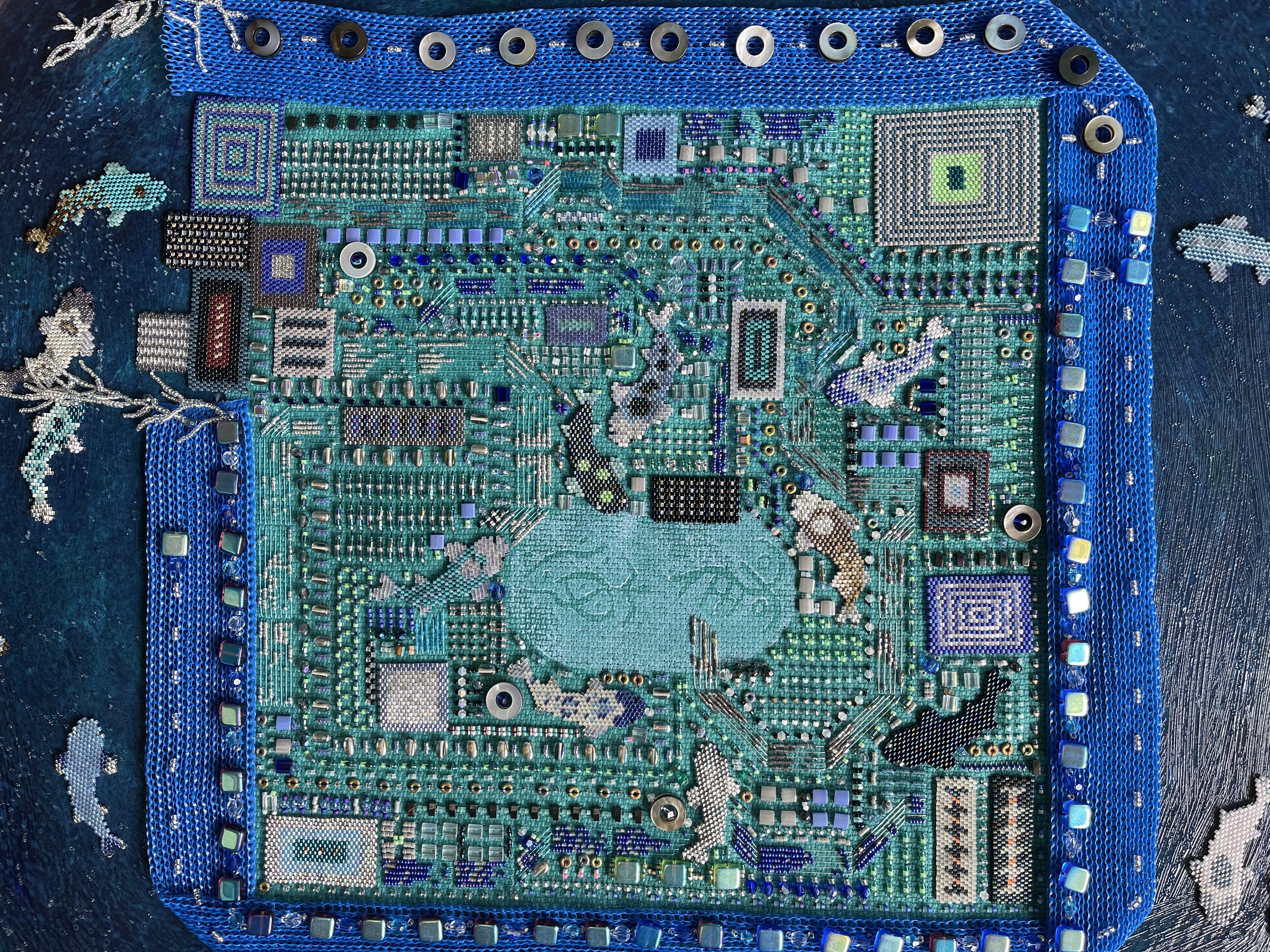 23 fish are swimming in an ocean. 8 auspicious fish are swimming inside of the square with a border of blue mesh. In the mesh is a hole filled with beaded microchips. Outside are 15 fish swimming in circles. Some are attracted to the chips. Some are not.