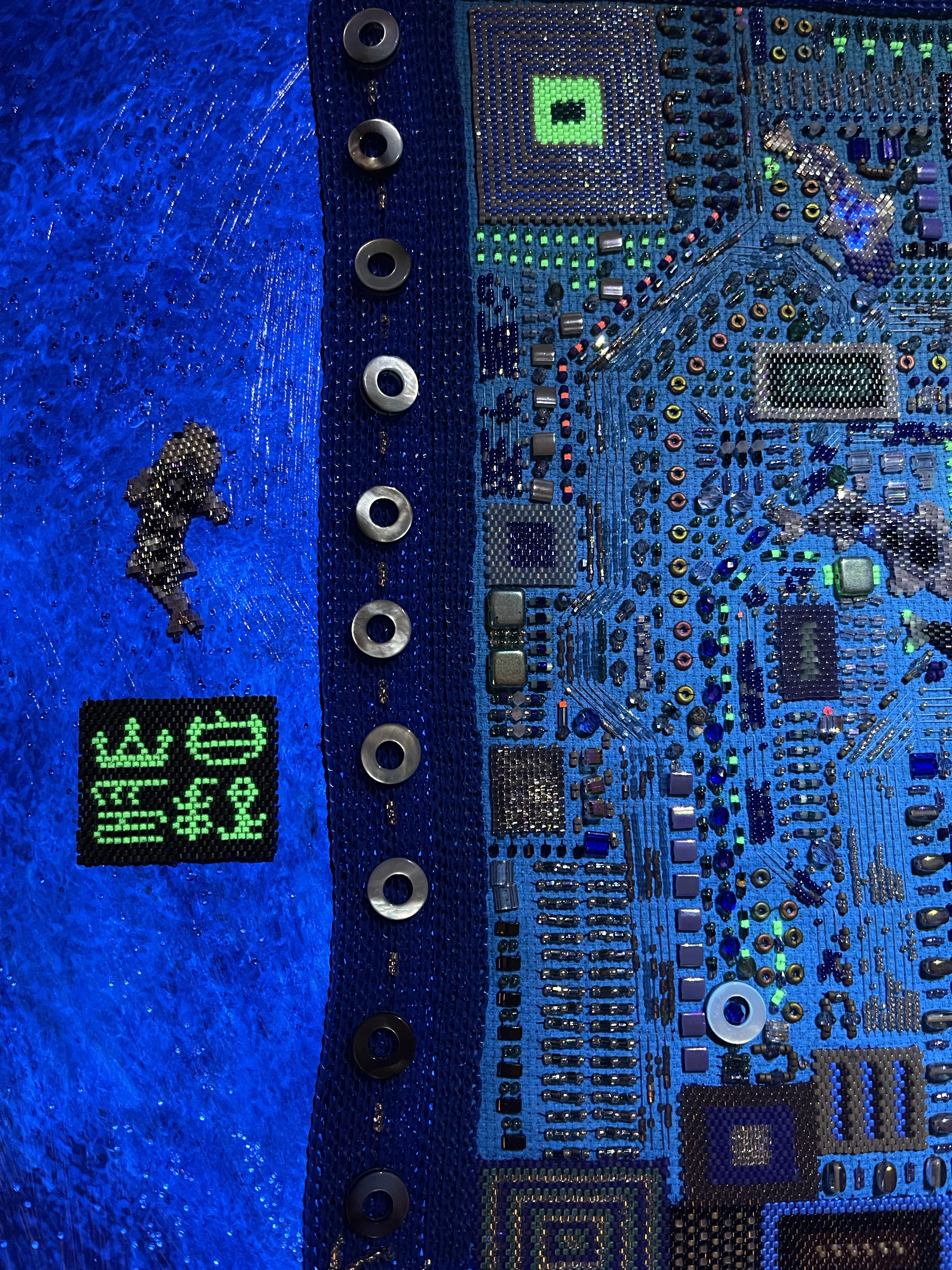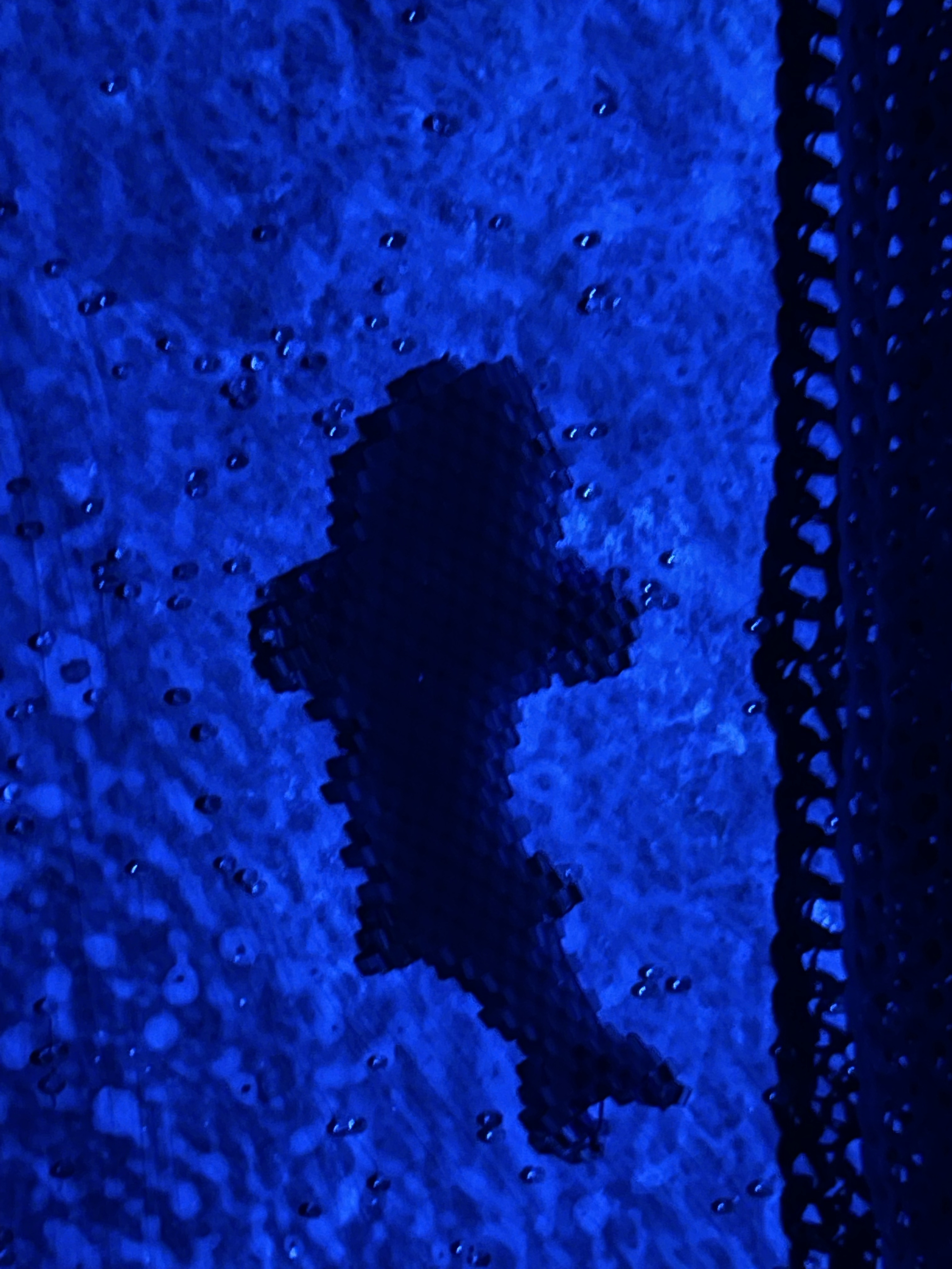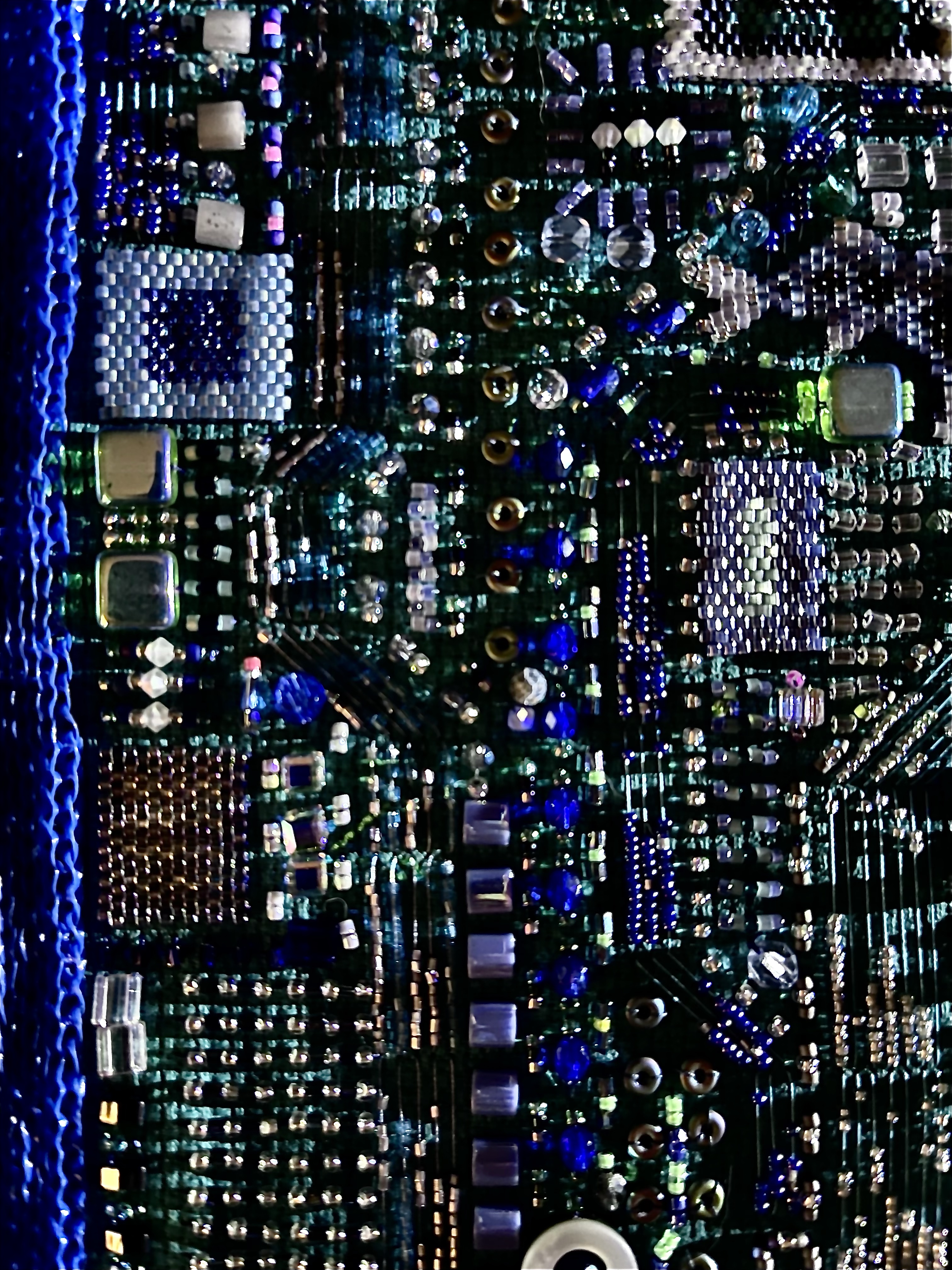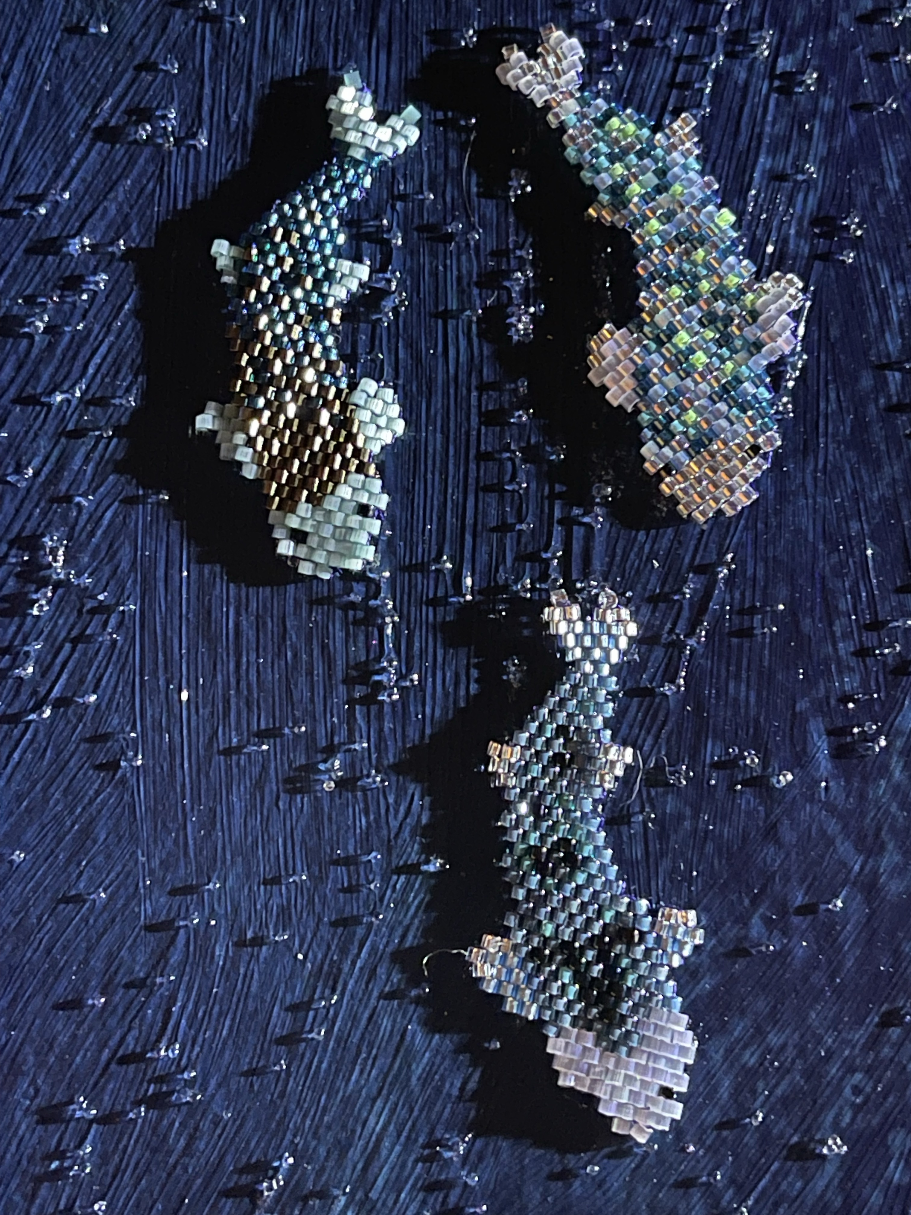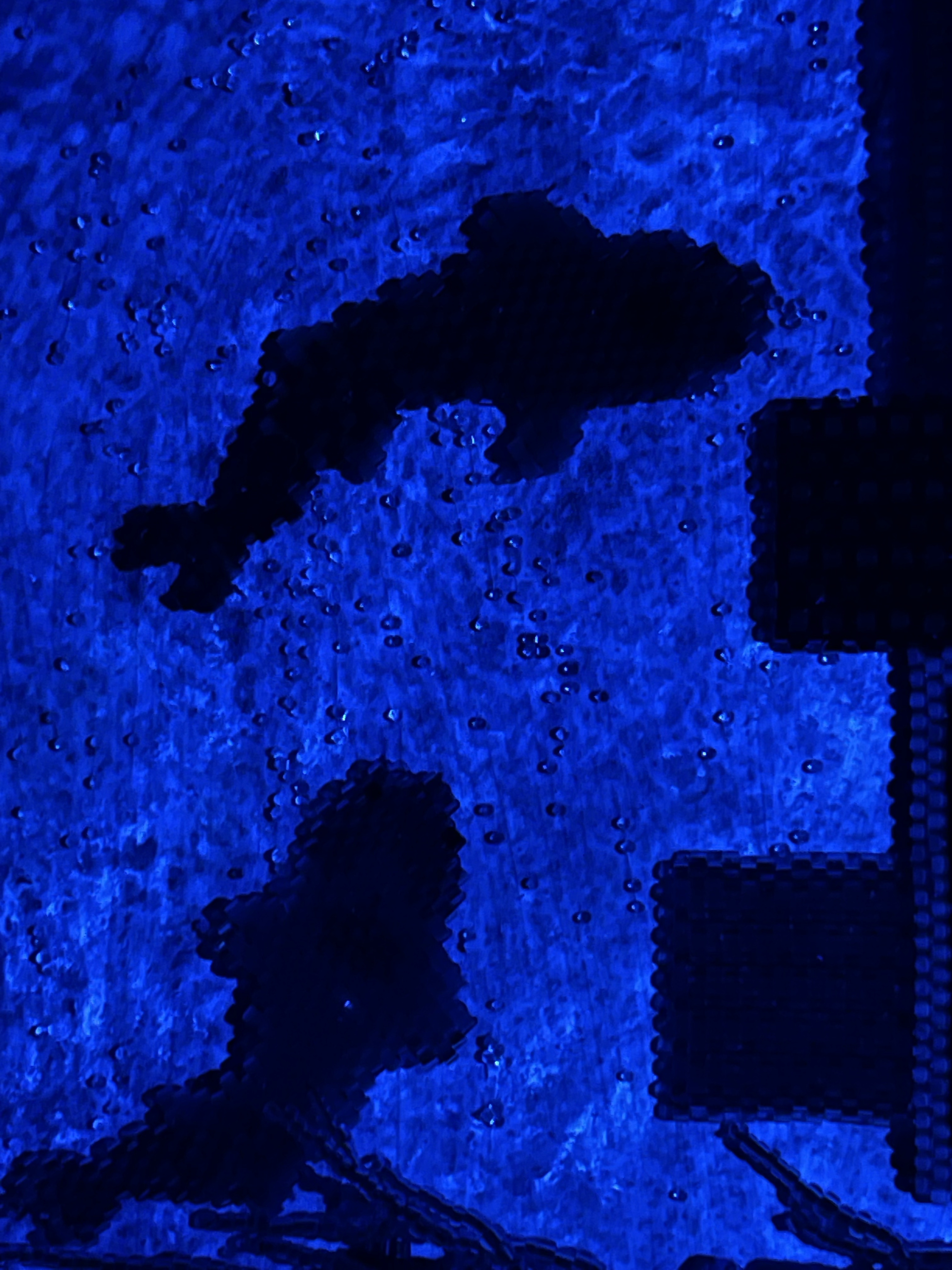 23 fish are swimming in an ocean. 8 auspicious fish are swimming inside of the square with a border of blue mesh. In the mesh is a hole filled with beaded microchips. Outside are 15 fish swimming in circles. Some are attracted to the chips. Some are not.