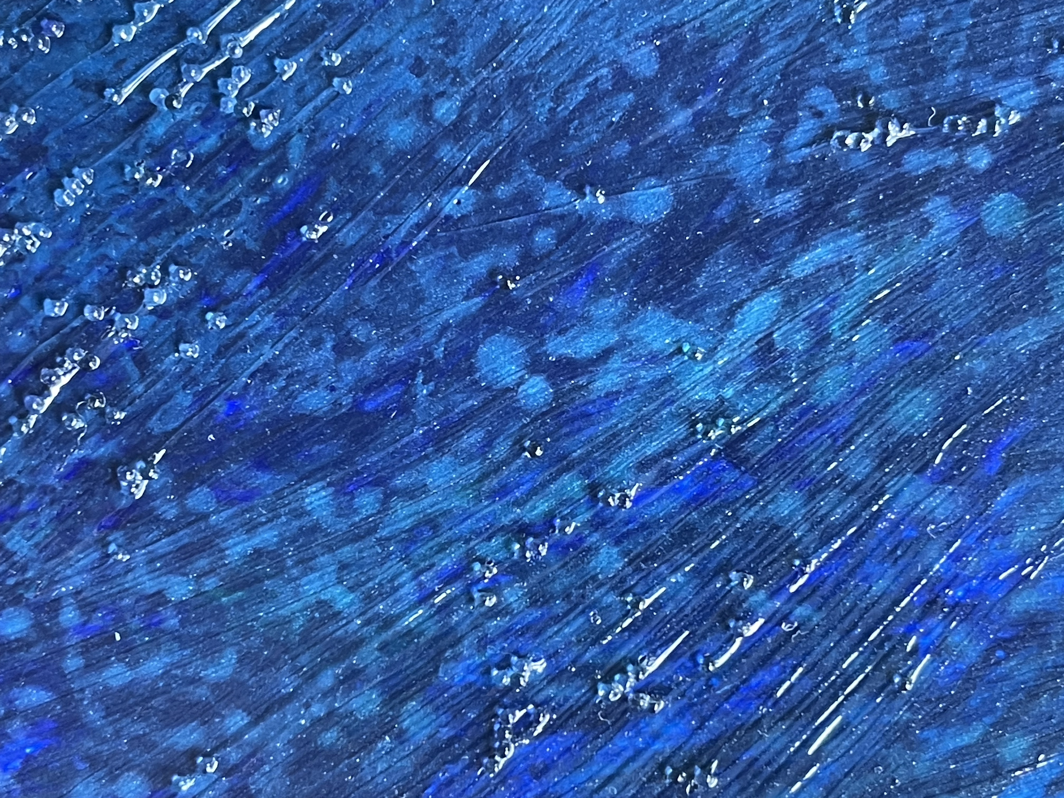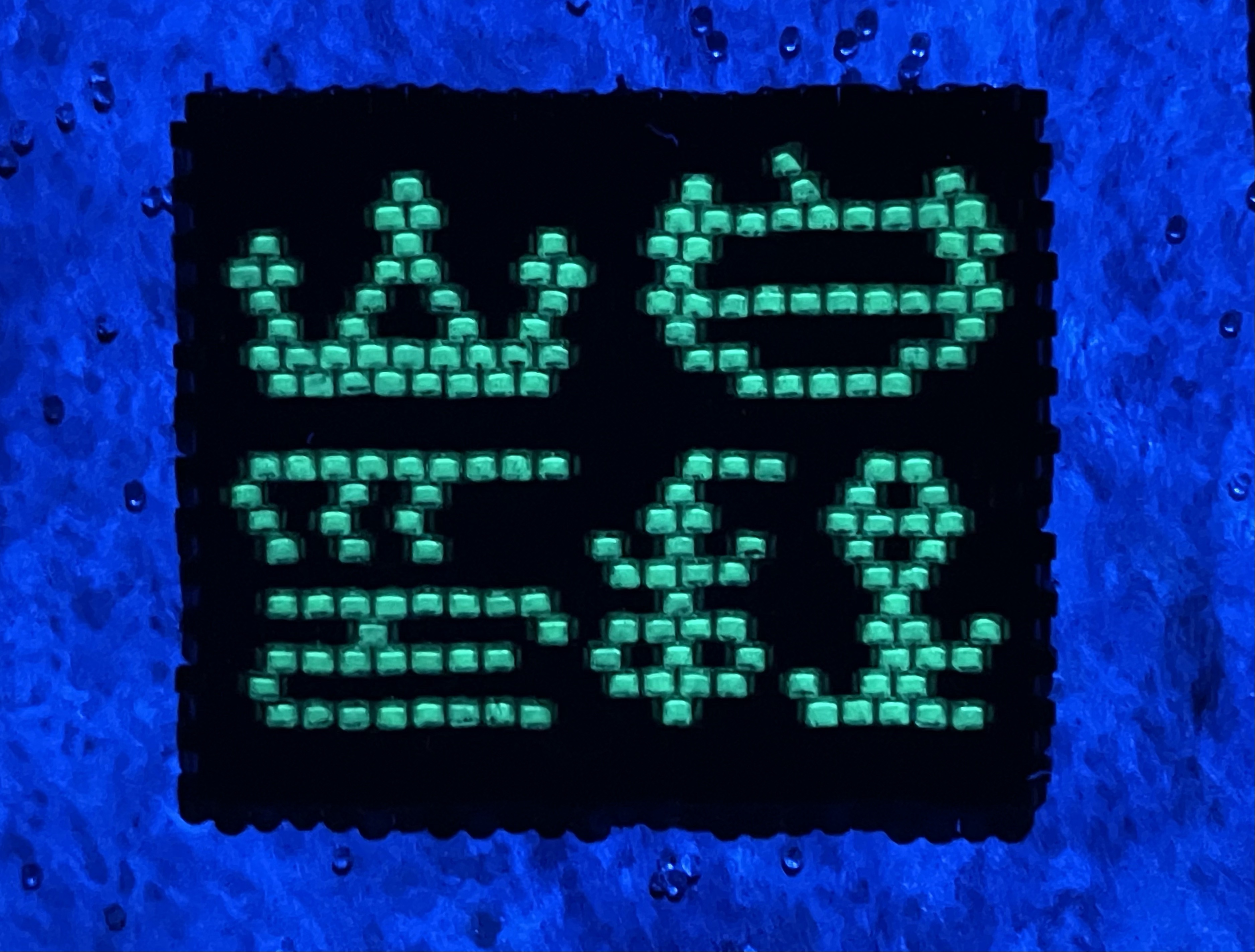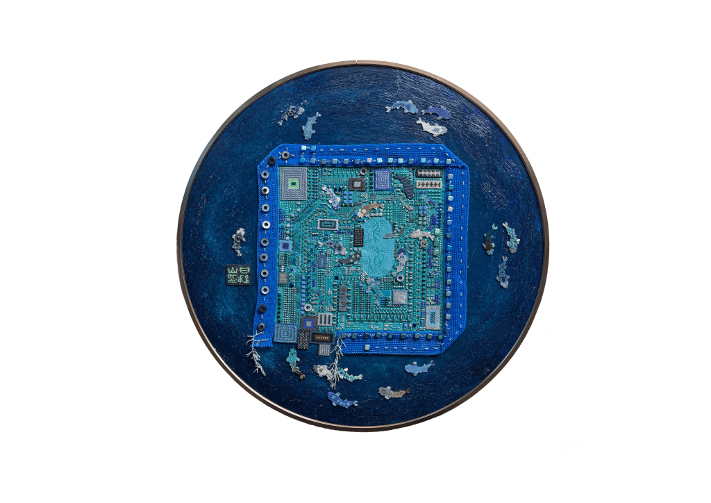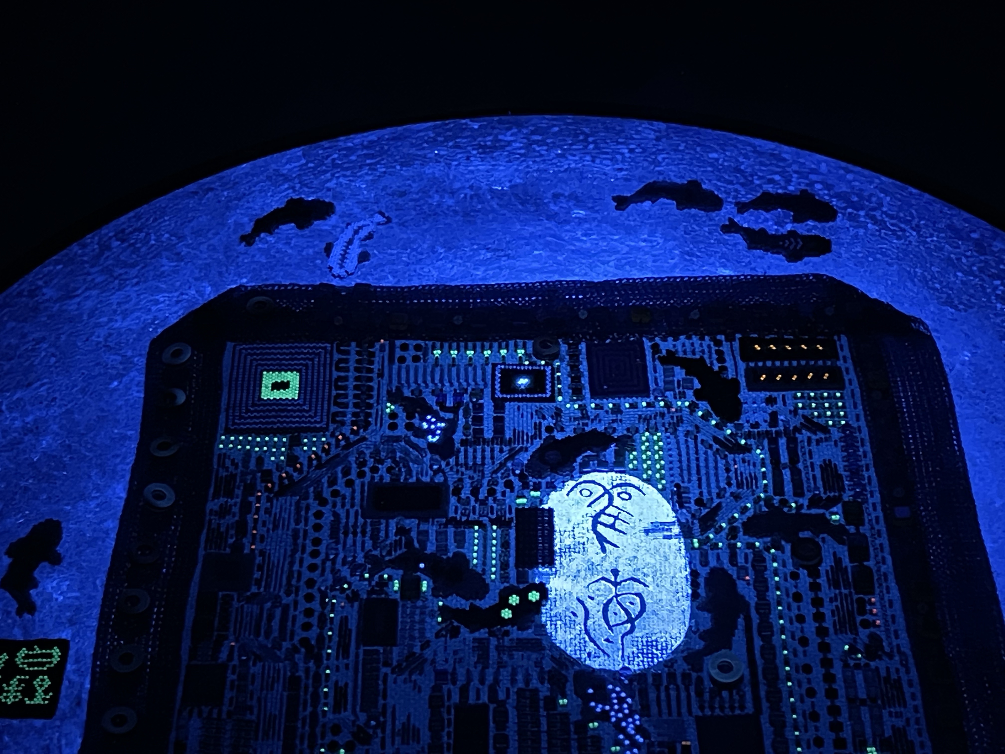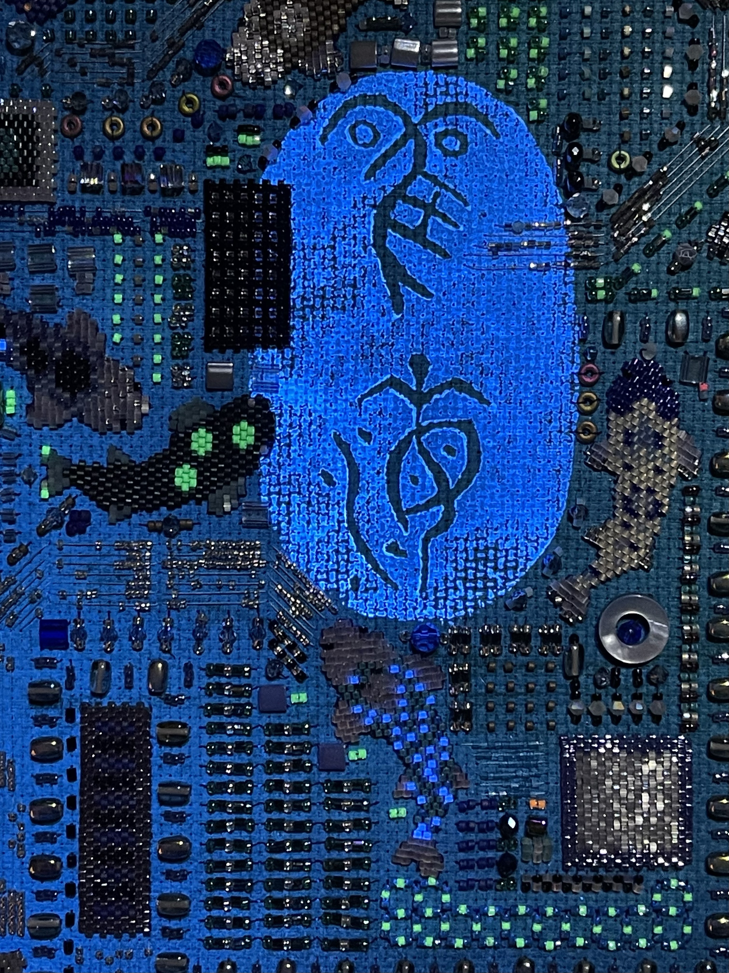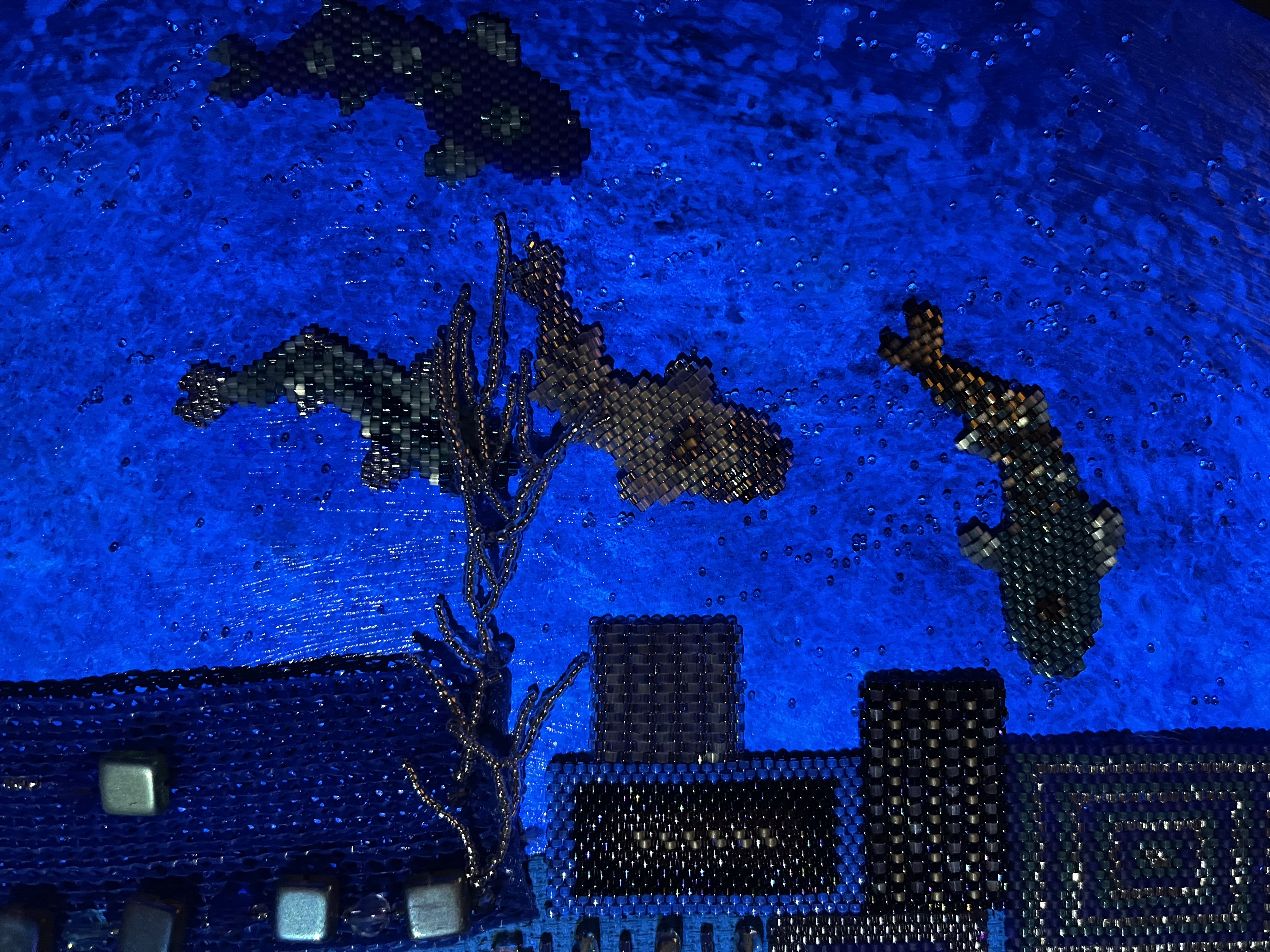 23 fish are swimming in an ocean. 8 auspicious fish are swimming inside of the square with a border of blue mesh. In the mesh is a hole filled with beaded microchips. Outside are 15 fish swimming in circles. Some are attracted to the chips. Some are not.