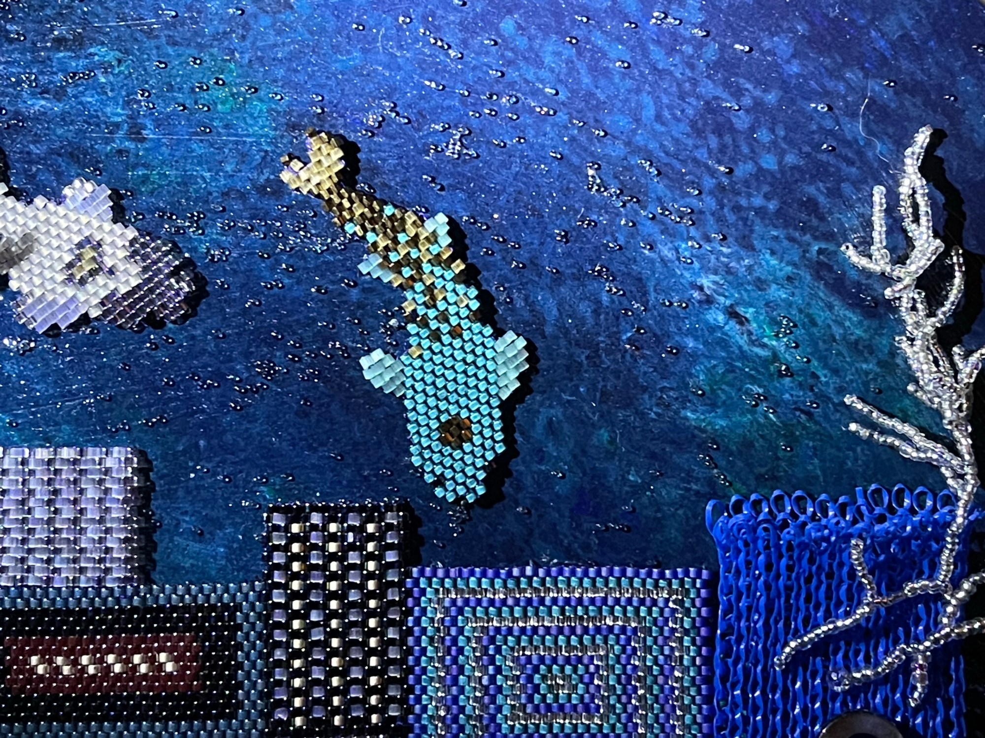 23 fish are swimming in an ocean. 8 auspicious fish are swimming inside of the square with a border of blue mesh. In the mesh is a hole filled with beaded microchips. Outside are 15 fish swimming in circles. Some are attracted to the chips. Some are not.