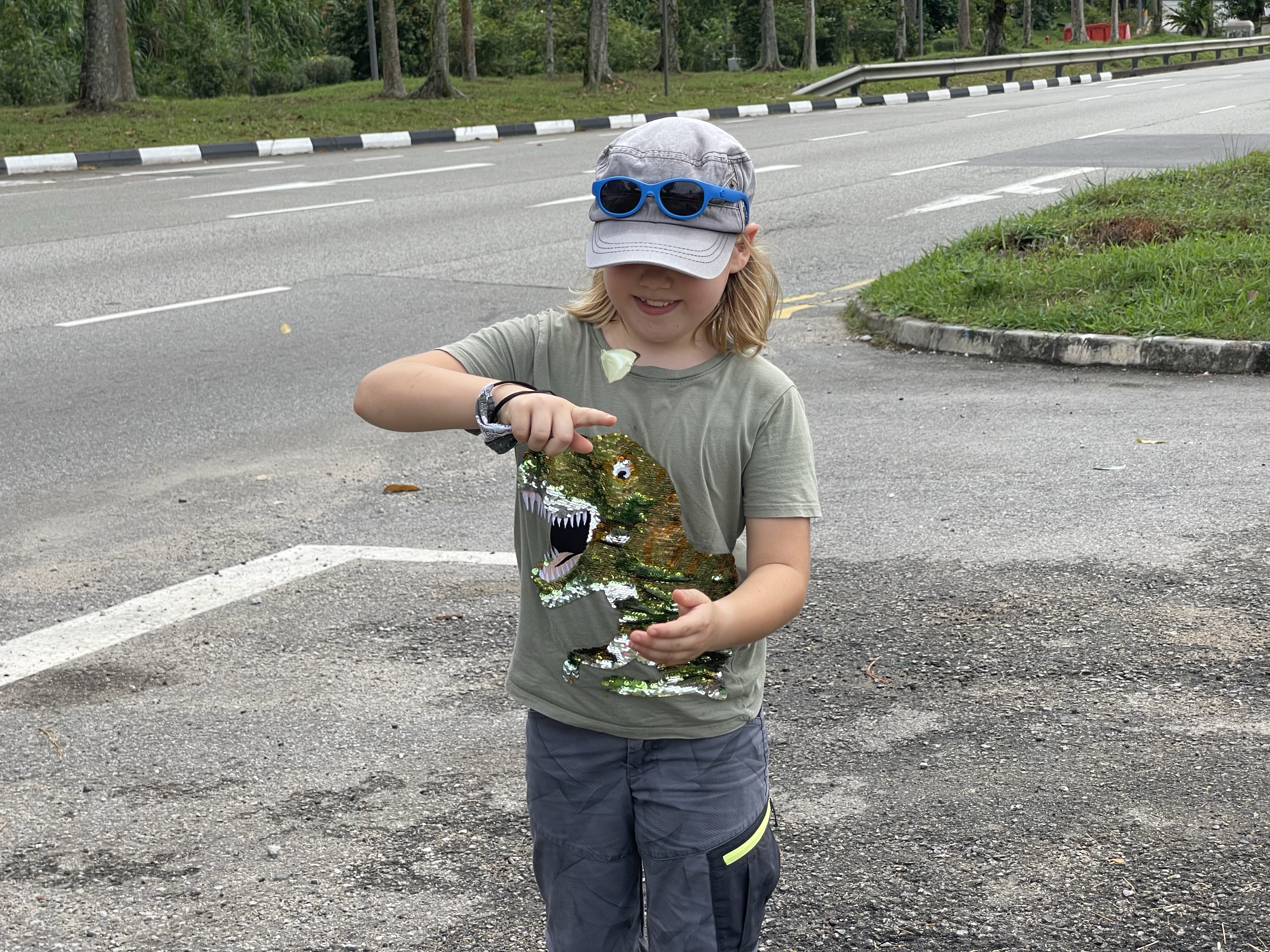 “It was a warm morning and the sun was out. We were walking along the street in Mandai, trying to find the location of coordinate #15. We went along the BKE to try to find a crossing to the Mandai Quary. Beside us was a large, grey building with barbed wire surrounding it. There was a sign on the fence, which said that we may not allowed to enter. It was a military area. Later on, we were walking along Mandai Road, hoping we could find Mandai Quary, which was the nearest and nicest place to the coordinate. The road next to us was empty, and a bit further in front of us was a camp from the military area blocking the way. There was a dead end. We had tried from every corner but sadly cannot get to the Mandai Quary. A few minutes later when we were going to the bus stop, we saw a beautiful green-blueish butterfly. I was trying to get the butterfly on my fingertip, which I did after a while. There were other butterflies flying around, too. We have seen some yellow and brown butterflies when we were walking along the BKE and Mandai road.”