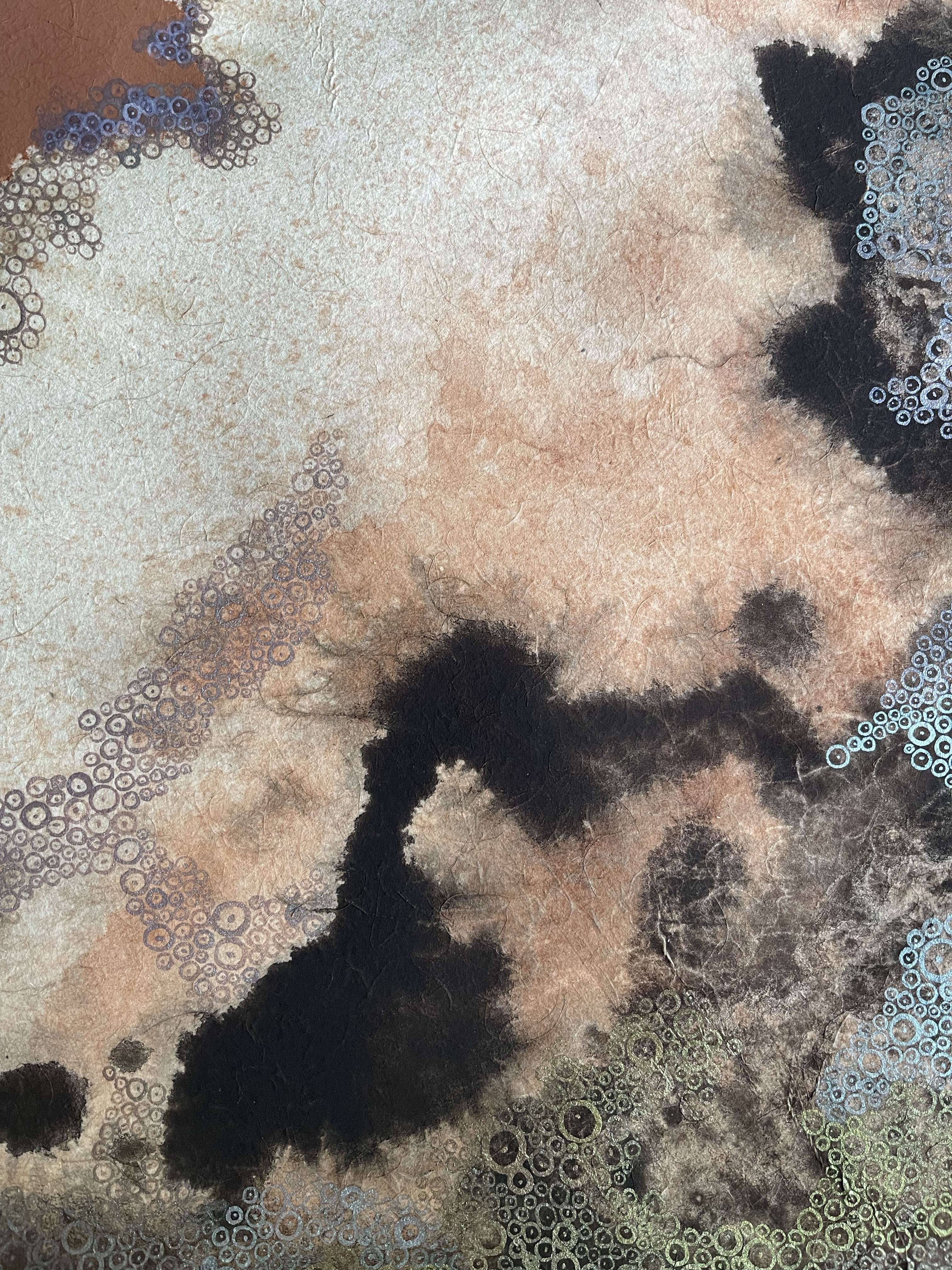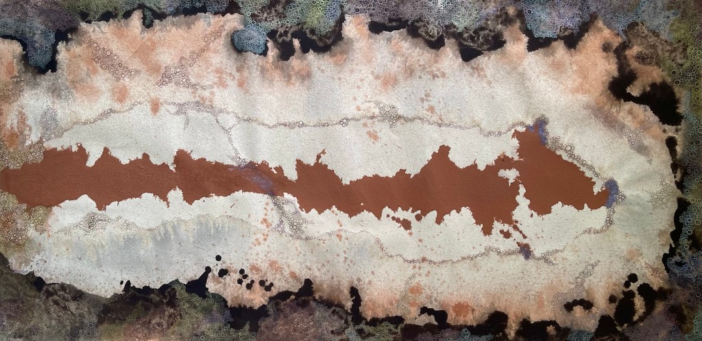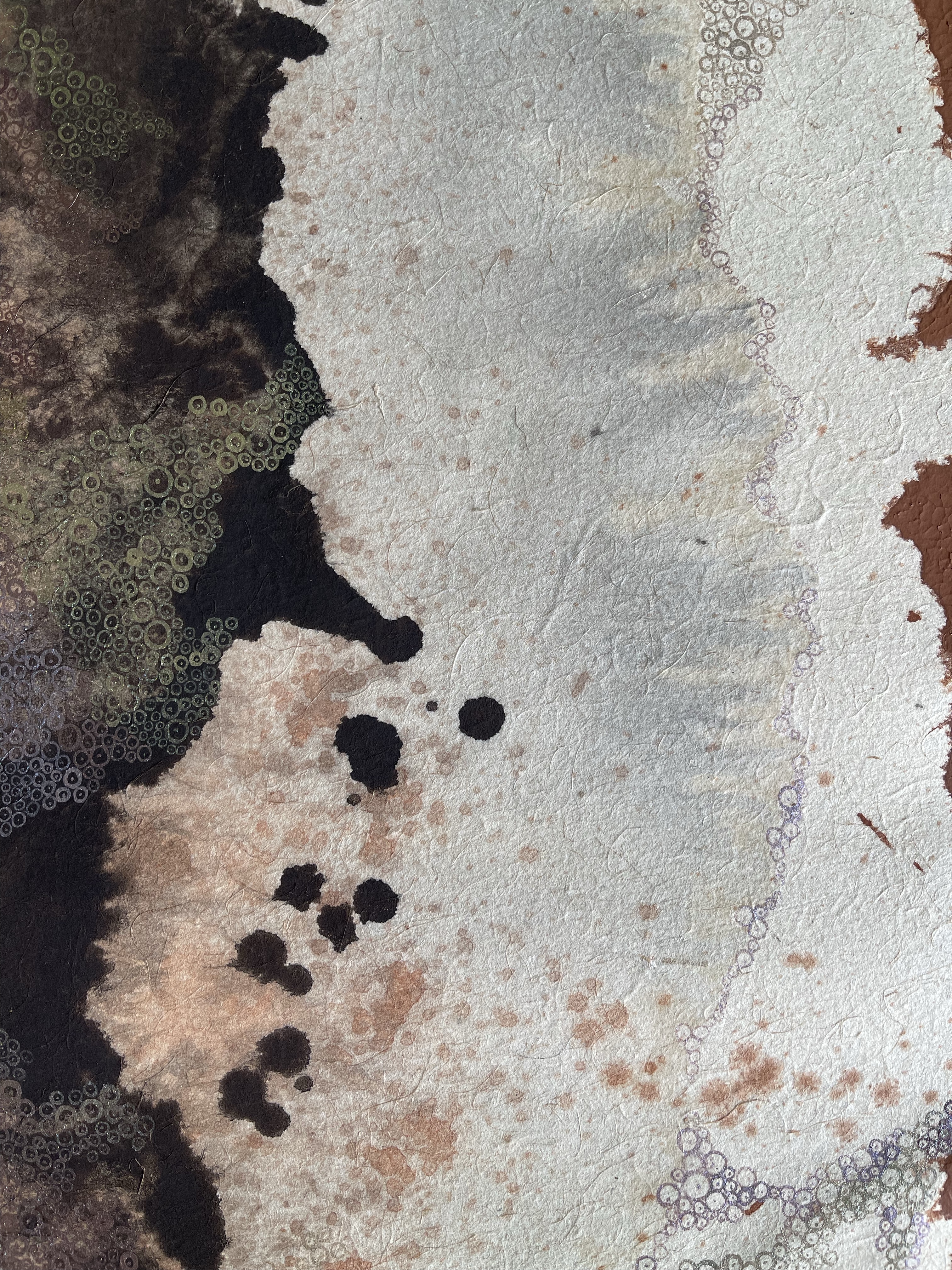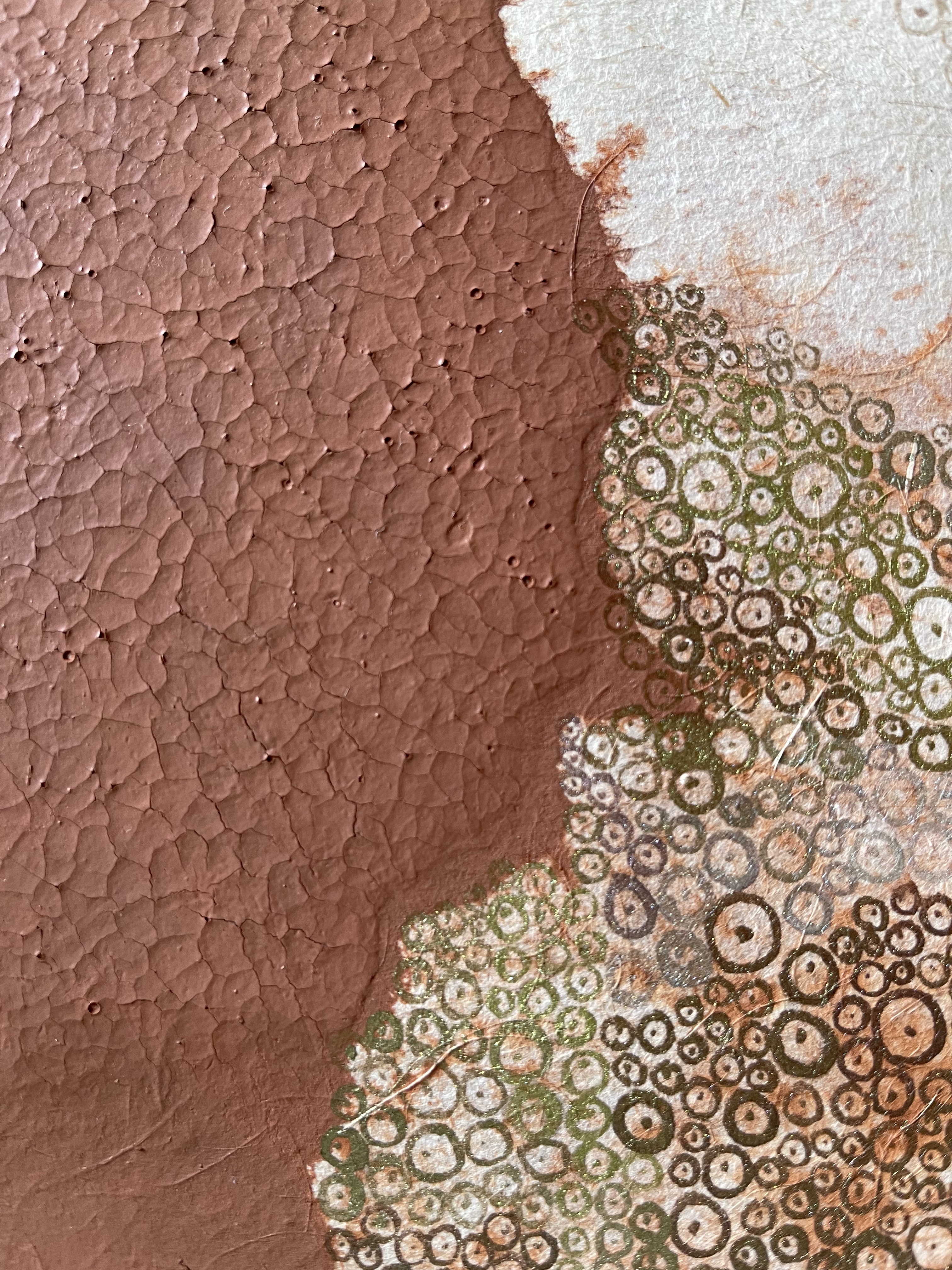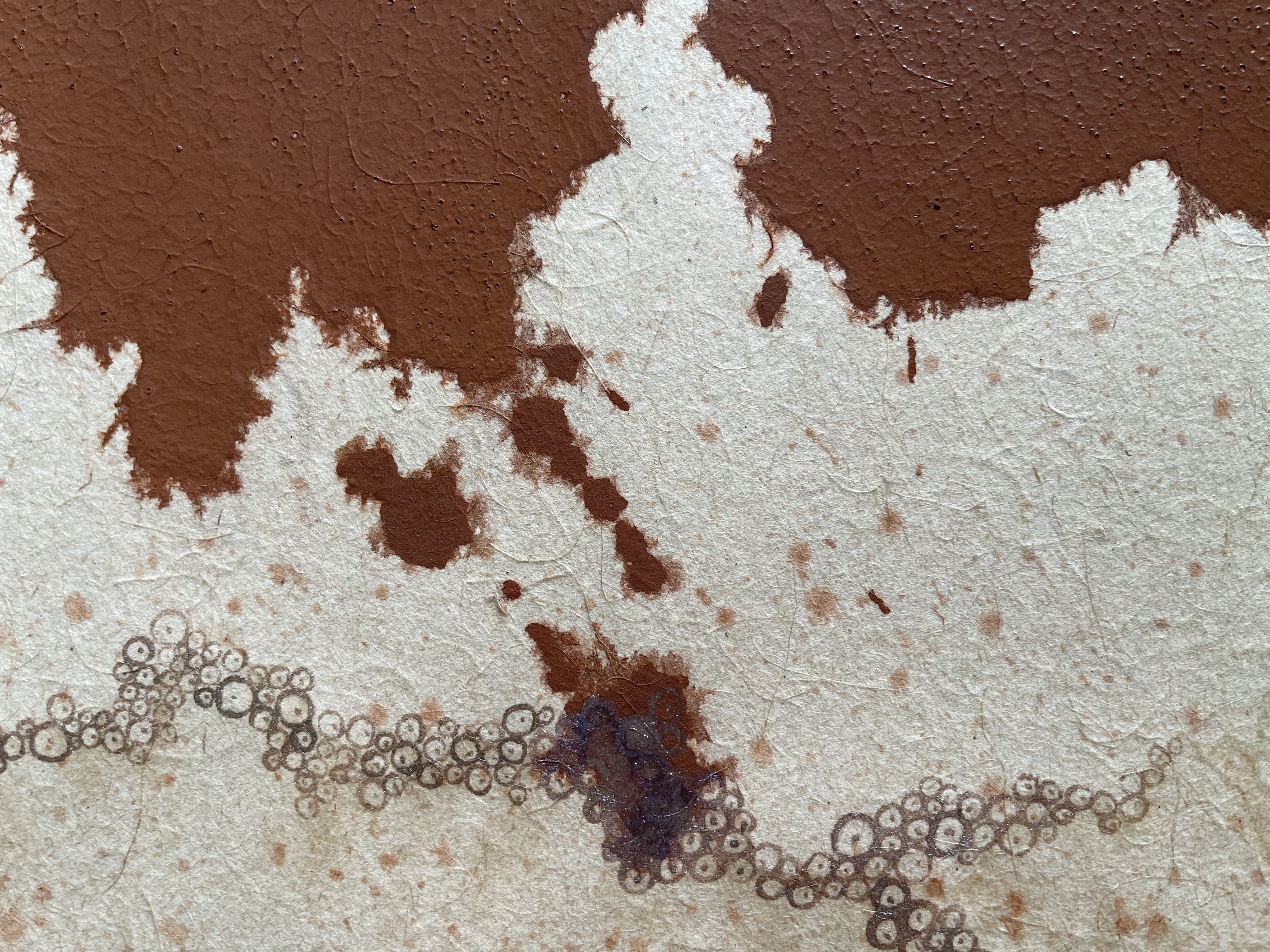 I wanted to creat something that illustrates the character of this paint. Bricks are made of burnt clay. Silica, Aluminium compounds and the coloring agent Iron Oxide and Magnesia are decomposing under certain conditions. In our case we helped by smashing them with a hammer. This loose powder can be used as a pigment. To make a paint out of it we used a gum, a natural binder. The painting shows my imagination how the color is behaving on a micro level.