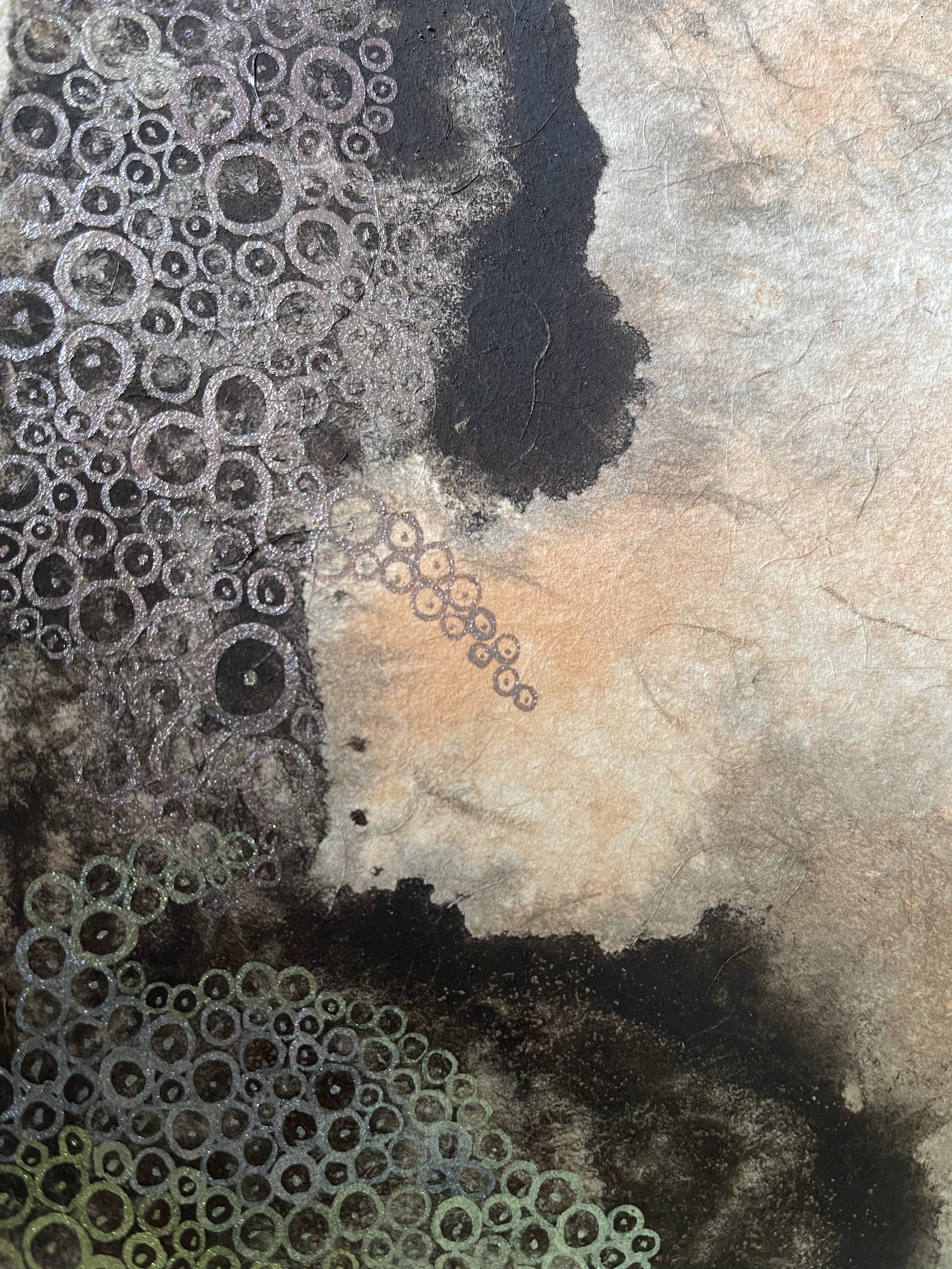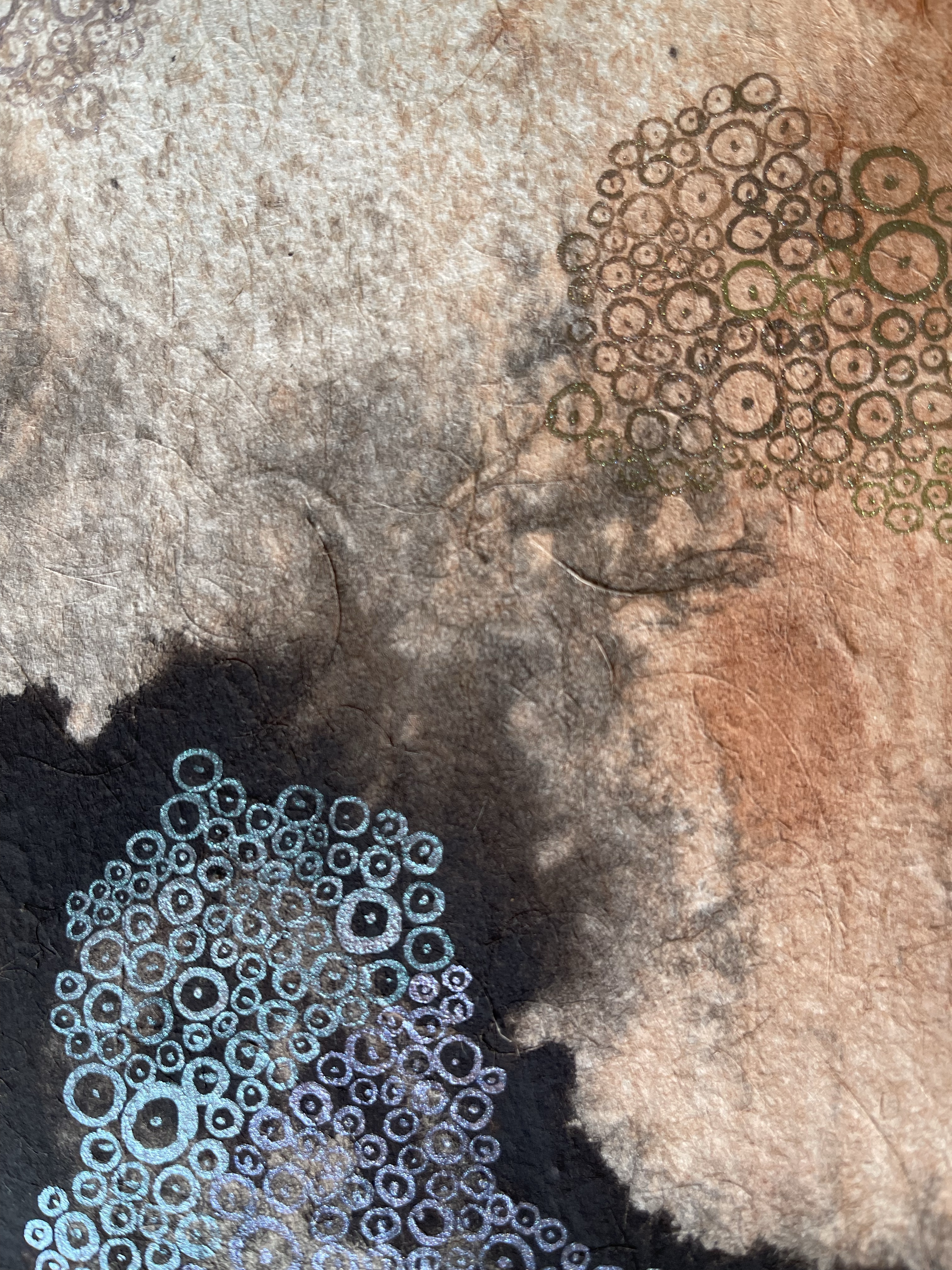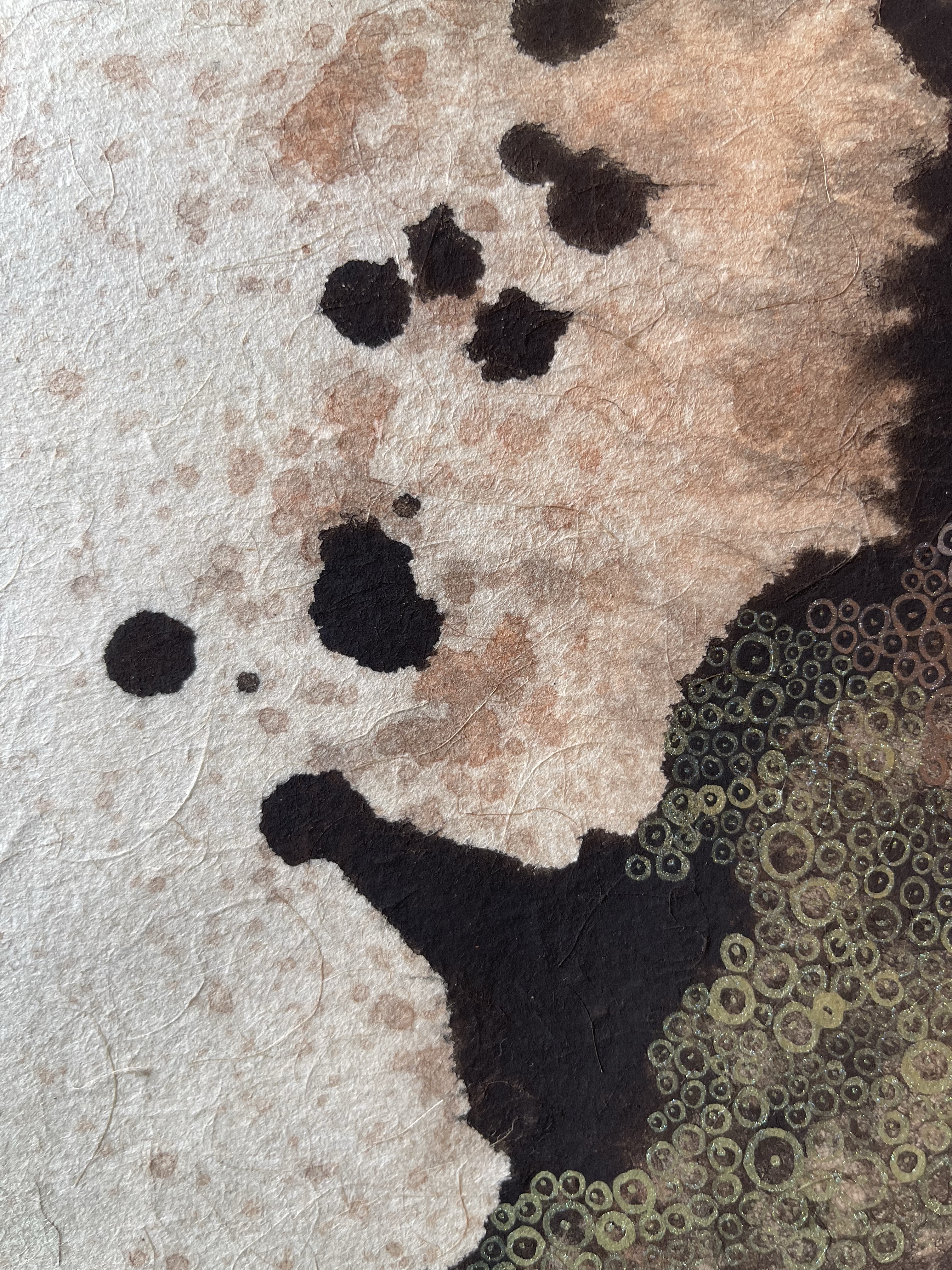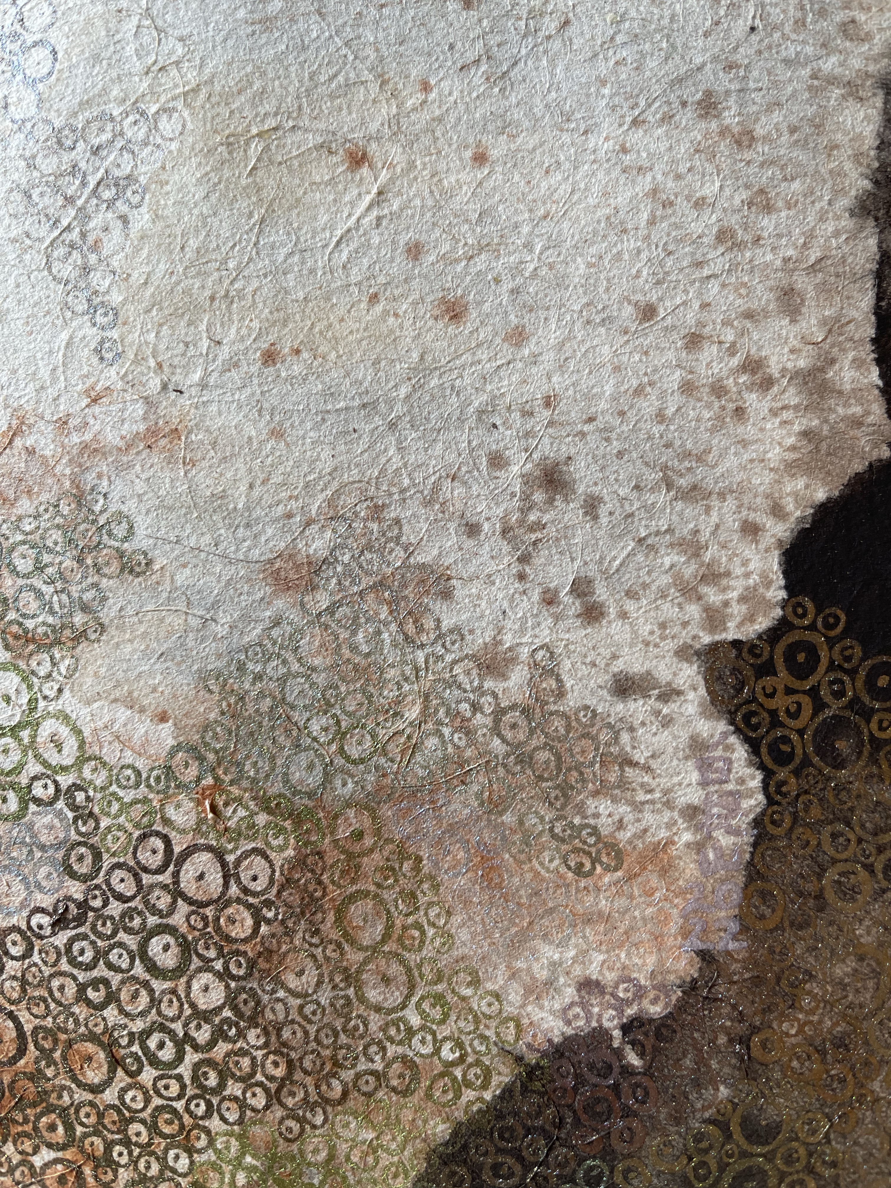 I wanted to creat something that illustrates the character of this paint. Bricks are made of burnt clay. Silica, Aluminium compounds and the coloring agent Iron Oxide and Magnesia are decomposing under certain conditions. In our case we helped by smashing them with a hammer. This loose powder can be used as a pigment. To make a paint out of it we used a gum, a natural binder. The painting shows my imagination how the color is behaving on a micro level.