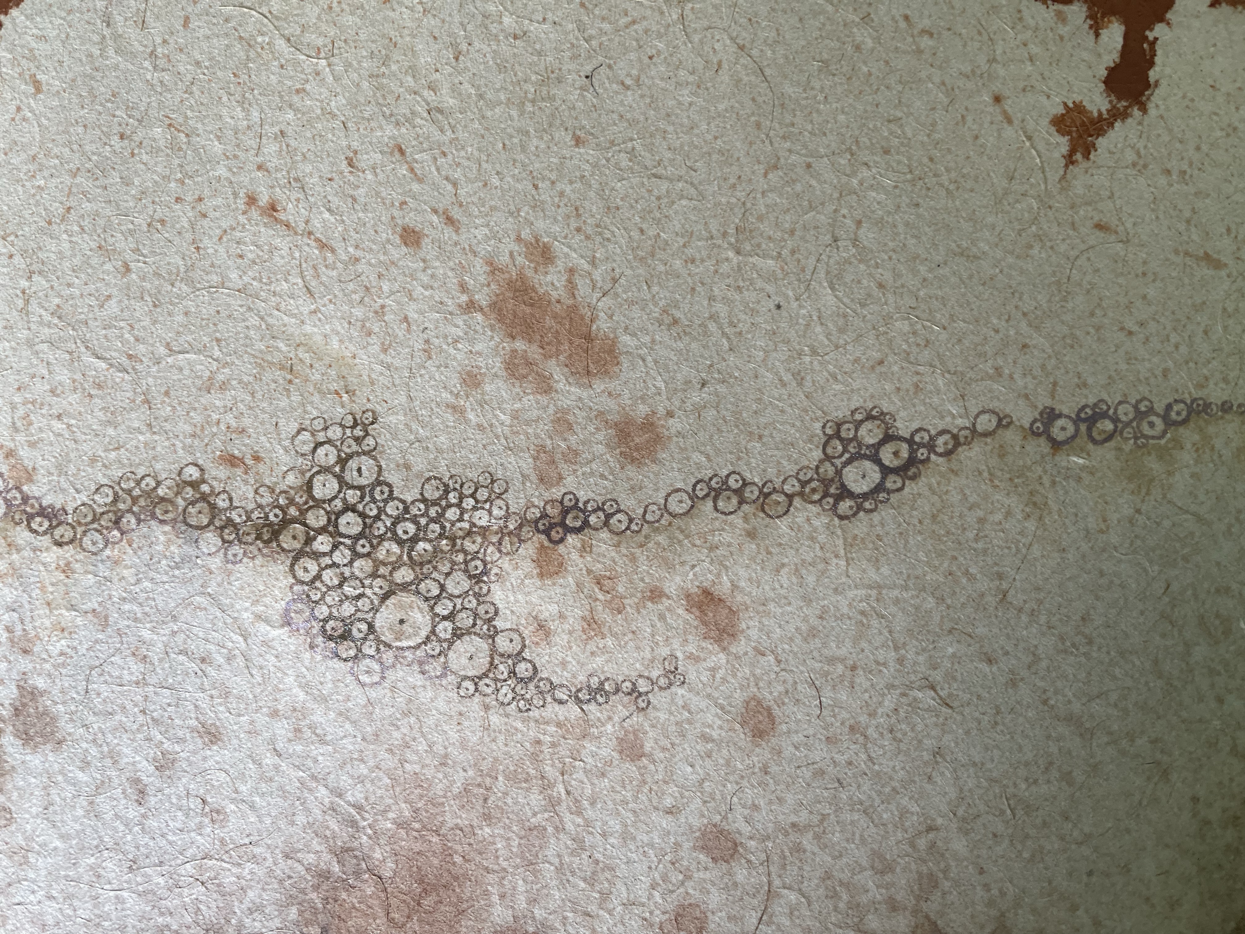 Back at home we went on a field, away from where we could annoy somebody with noise and smashed the bricks with a hammer into powder. Every family member was quite exhausted after this first step of paint-making, so the following step happened only weeks later. In the following steps my daughter sieved the powder with always finer strainers until we mixed the pigment with water and filtered it through a tee filter. I mixed gum arabic as binder to the pigment-water paste and our DYI red ochre color was ready to go. This kind of color is used along since the early Homo sapiens, as long as 40 000 years ago. Archaeology revealed cave paintings, early grinders and even prehistoric binders could have been proven with extremely sophisticated analysis. How it feels to paint with a paint made of this gifts from earth and made with your own hand my daughter experienced that day. I prepared two sheets of mountain hemp paper over night and asked her to pour it on.