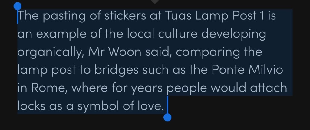 Manish said, that this street lamp is the only place in Singapore where you are allowed to paste stickers on. When I was googling the post lamp I was reading this paragraph of an article in CNA: