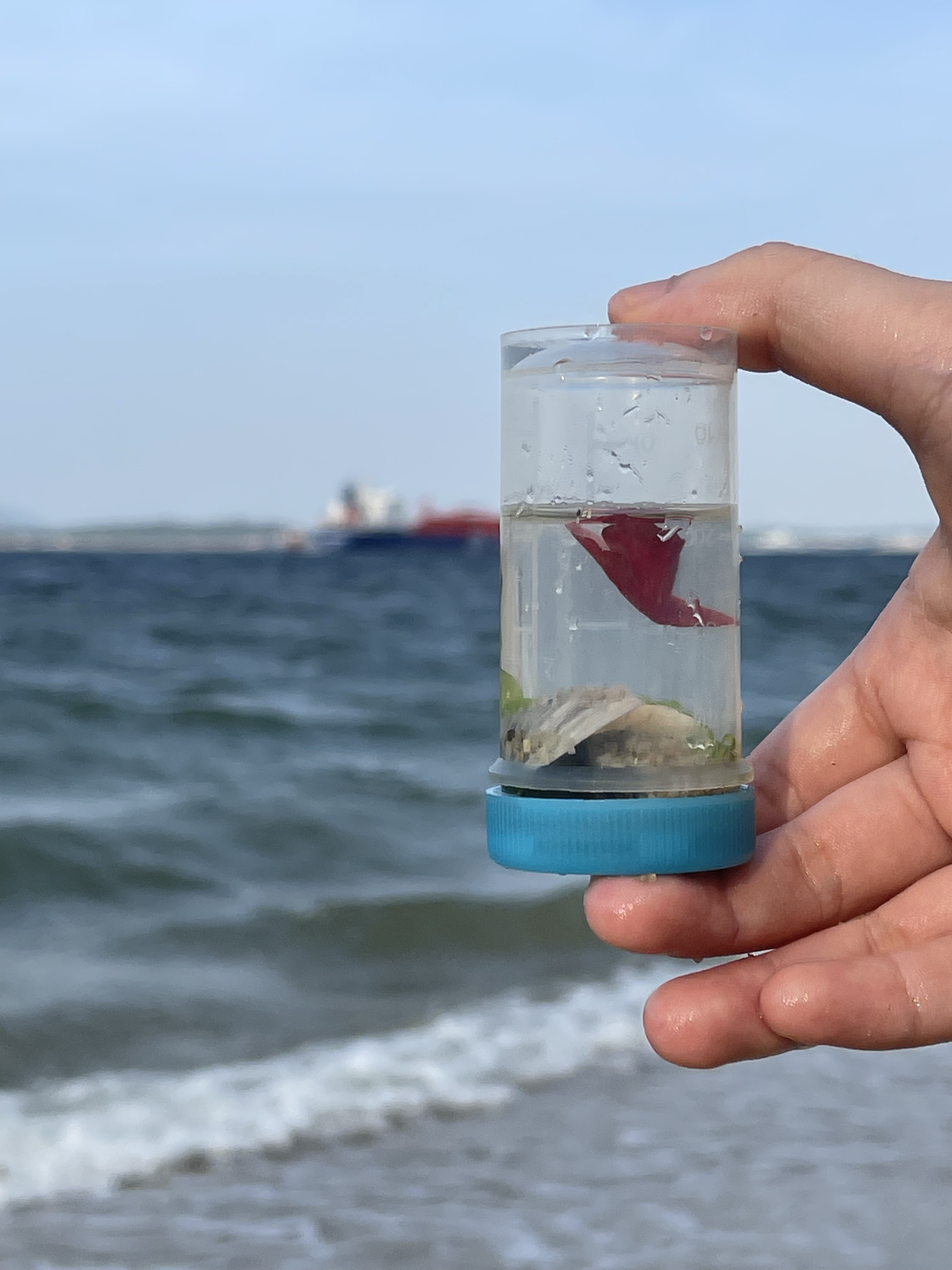 As I tried to get situated, it was nice to have my first directive: to collect a physical sample. Bettina gave me a pouch full of materials, from which I selected a clear vial. I liked exploring and feeling what was around me. Seeing all the different elements in my environment, I looked to keep a sense of togetherness in my sample, hoping to include a mixture of textures, elements, and colors. I created a mini terrarium of ocean water, seaweed, flower petals, shells, and sand. Thinking about the different density and space these elements took up, I named it “suspension.”