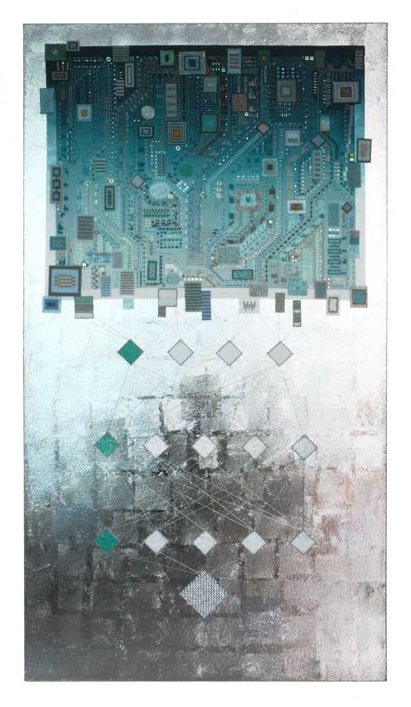 (glass beads, embroidery, leaf metal, fluorescent acrylic on canvas)