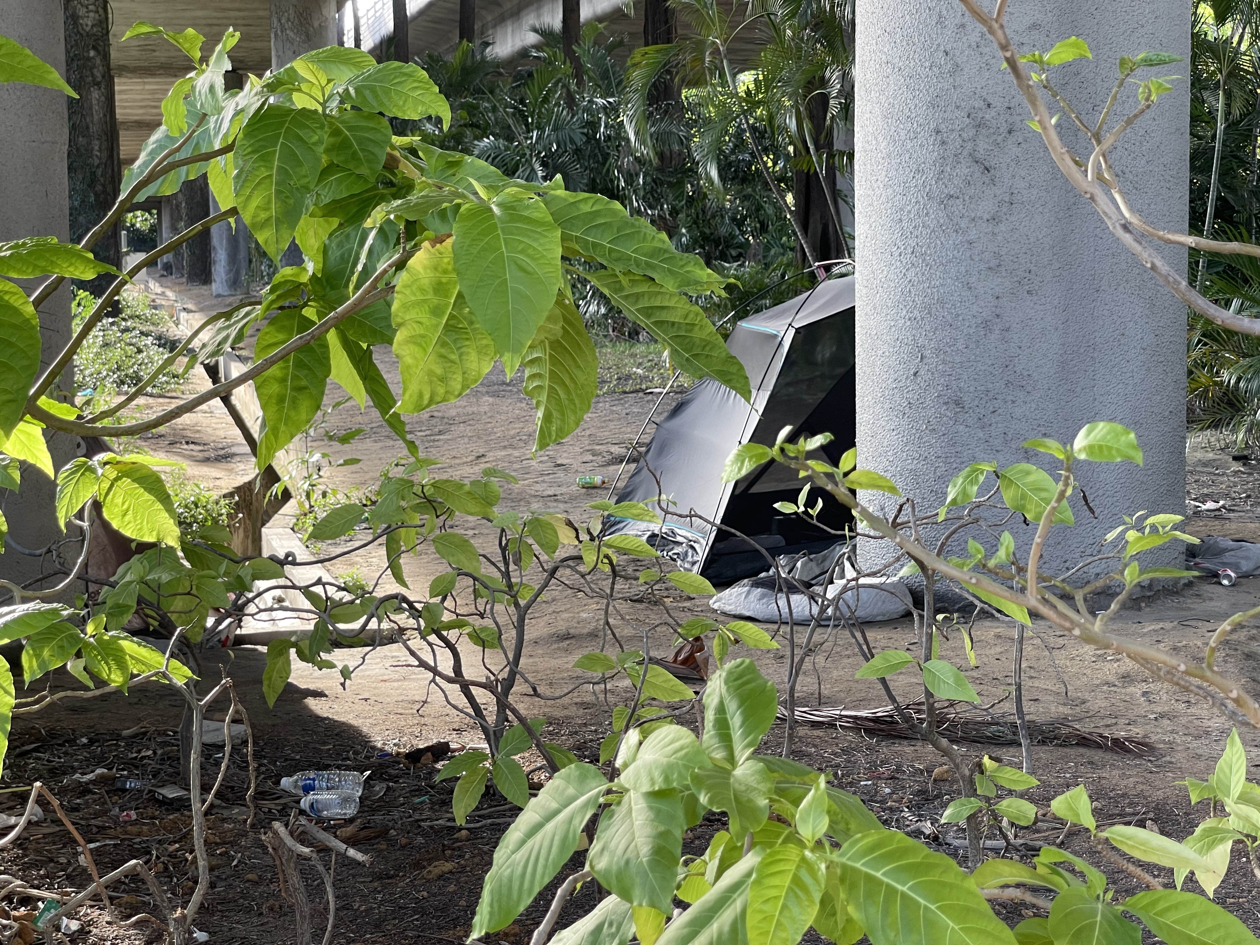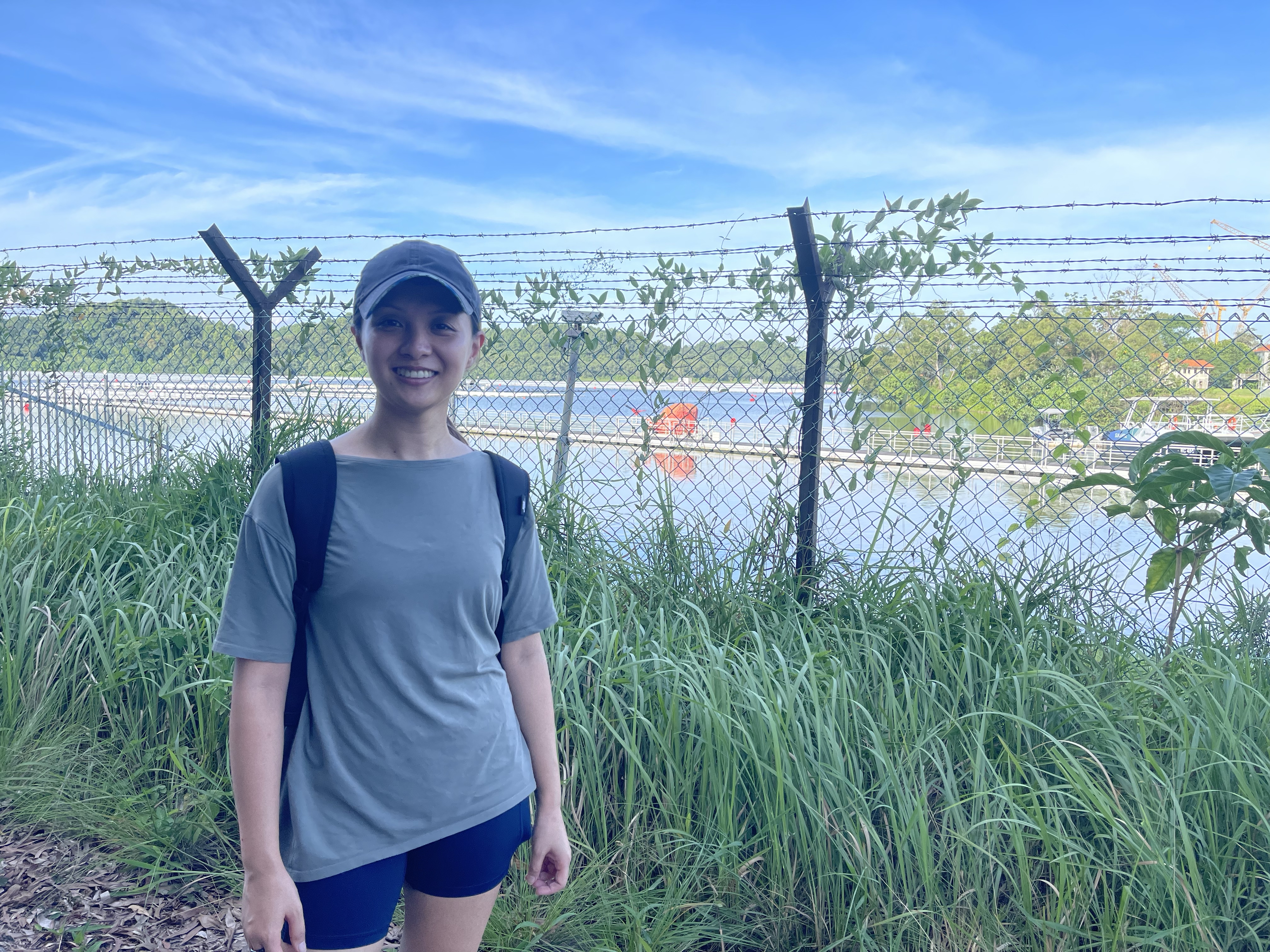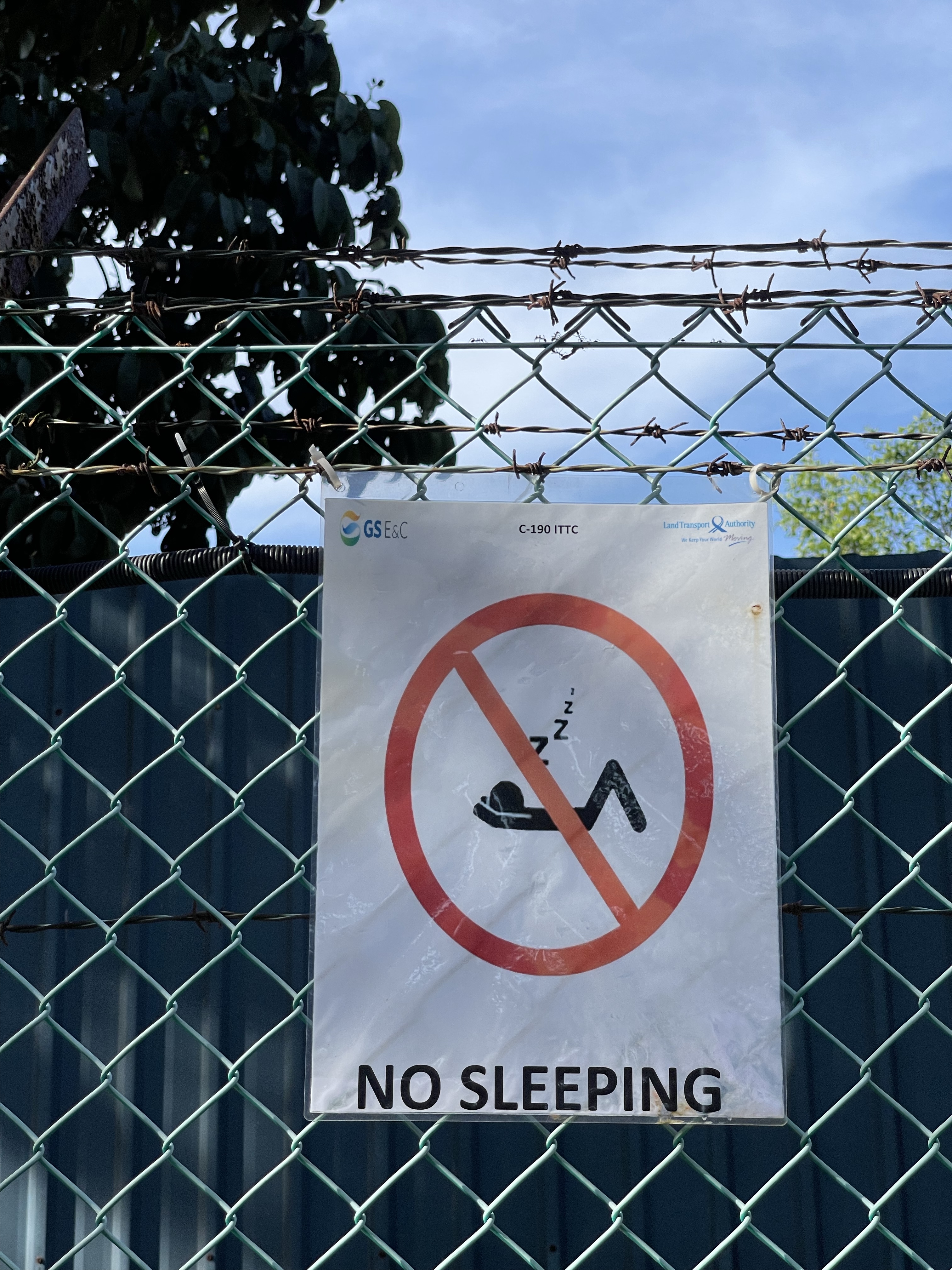 From the meeting point we wanted to approach coordinate #11, located in the middle of the western wetlands. We were joking around to be glad to have a crocodile and snake approved Australian with us and walked along the road. We crossed a street at the underpass of the Tuas Checkpoint, one of the 2 checkpoints to Malaysia, when I saw a lonely tent next to a pillar. A very unfamiliar picture in Singapore. We passed some abandoned houses with strange and frightening signs on the fence when the street was ending at a gate to a restricted area on a dam with a floating solar farm. Somehow we were all secretly happy that our hike ended at this point on this extra hot afternoon.