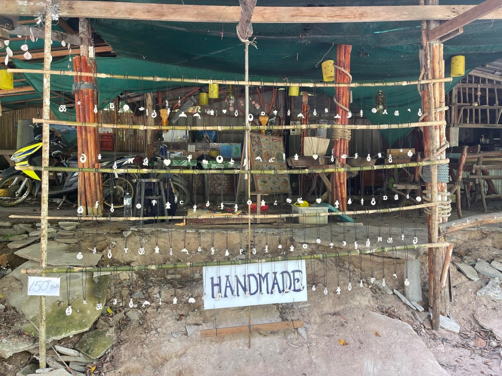 A Corona-Pandamic abandoned restaurant with a bamboo-construction street-sided was offering necklaces made of carved bones. Signs “HANDMADE” and “150 Bhat” were placed to the display. Behind there was a little workspace on the floor, a motor bike and all the stuff from the given up restaurant. NOI was sitting there, working on a necklace. He is a 67 year old Thai, born in Chiang Mai – the traditional art and craft center in Thailand. He came to Koh Tao 20 years ago, first to escape the everlasting rain season on the west-coast, where he was working before. Then he met his wife and they had a daughter and stayed in Koh Tao.