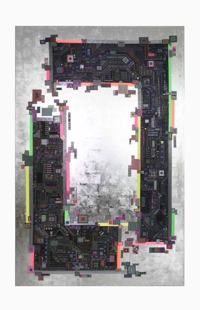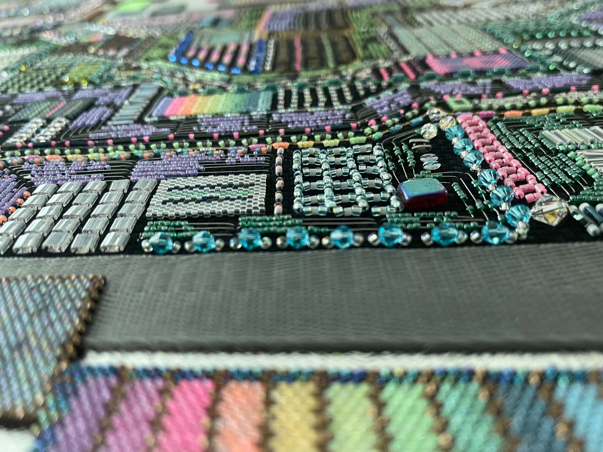 (glass beads, embroidery, leaf metal, fluorescent acrylic paint on canvas)