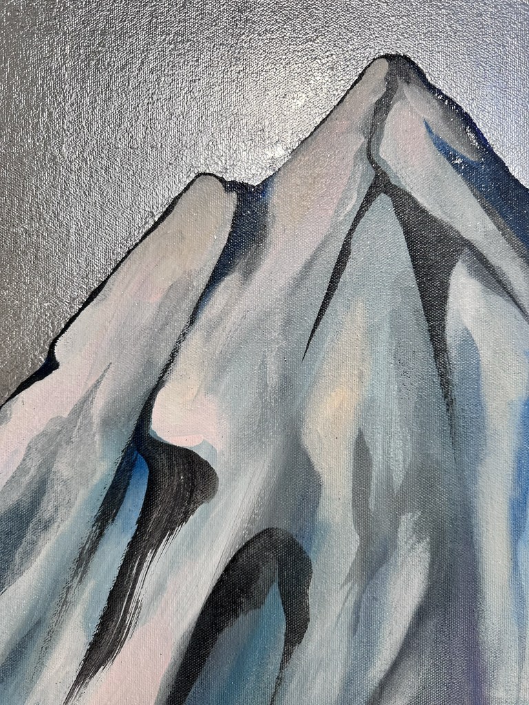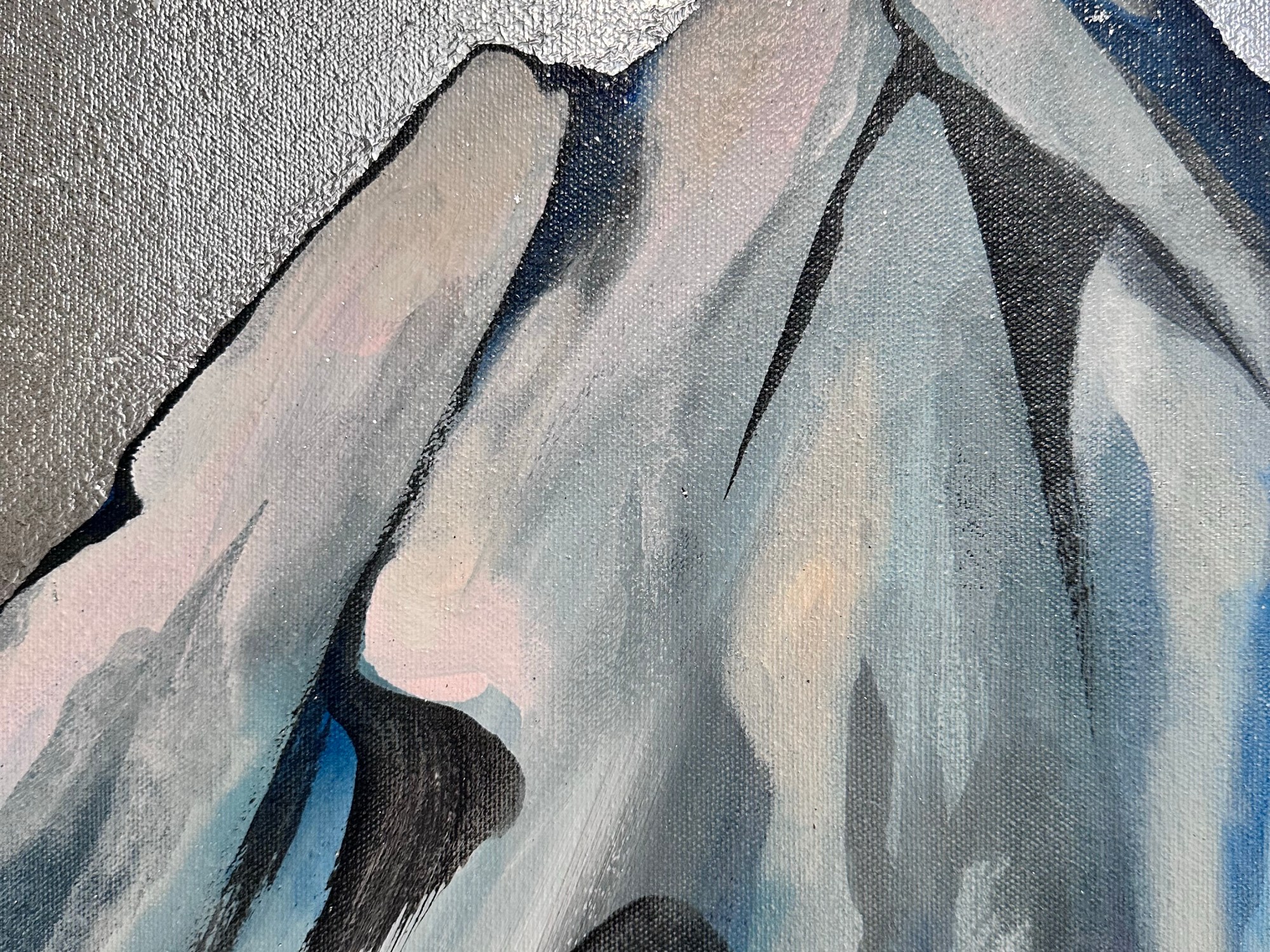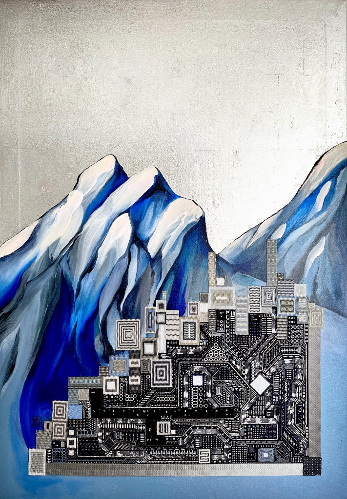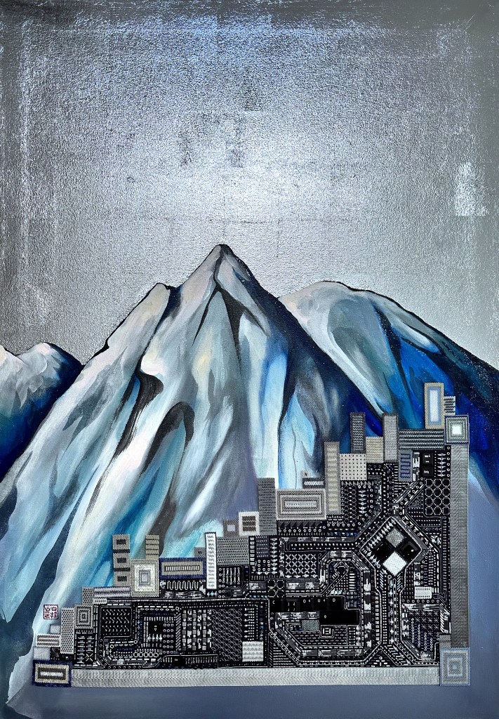 山 [systemrelevant] and 山 [cloud] are 2 artworks interplaying with nature and technology. The grandeur of the towering, icy-blue mountains, painted with fluid brush strokes, contrasts dramatically with the intricate, geometric patterns of the “electronic embroidery” below.