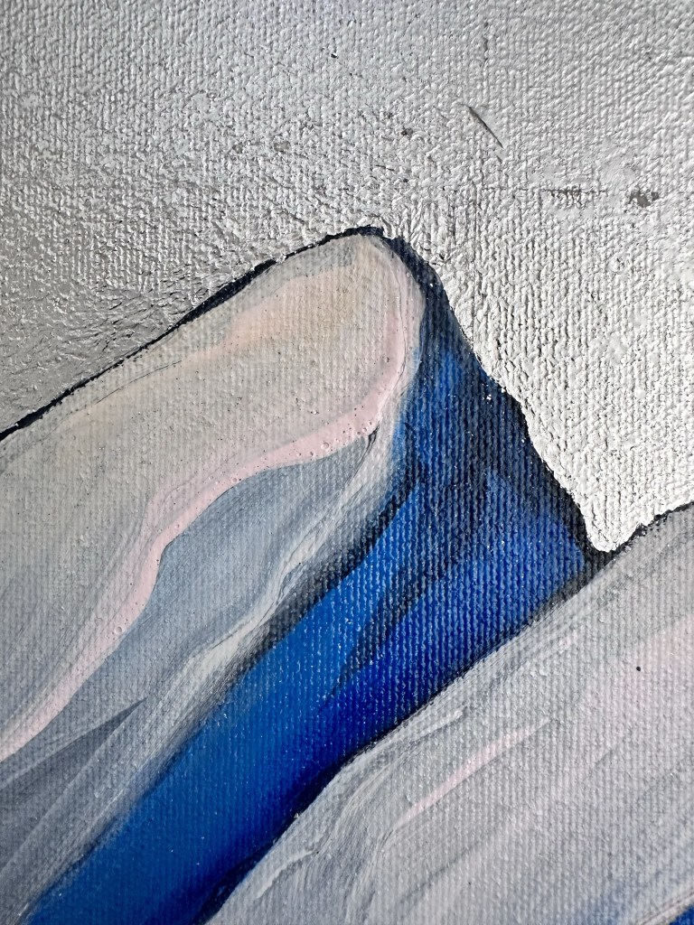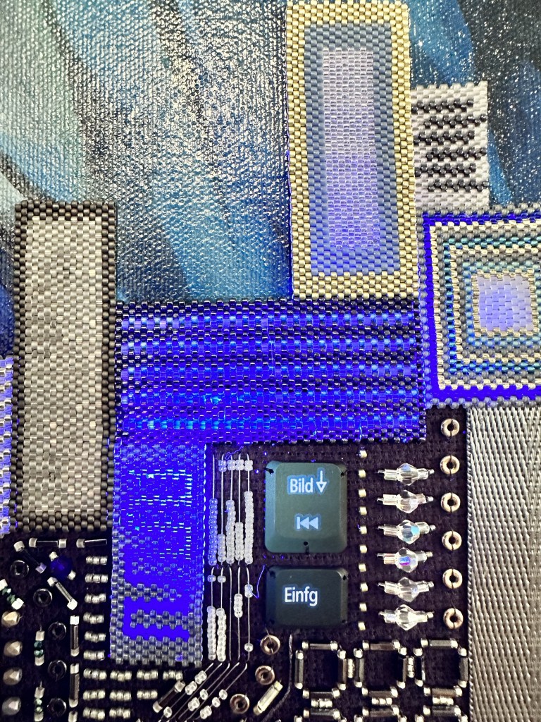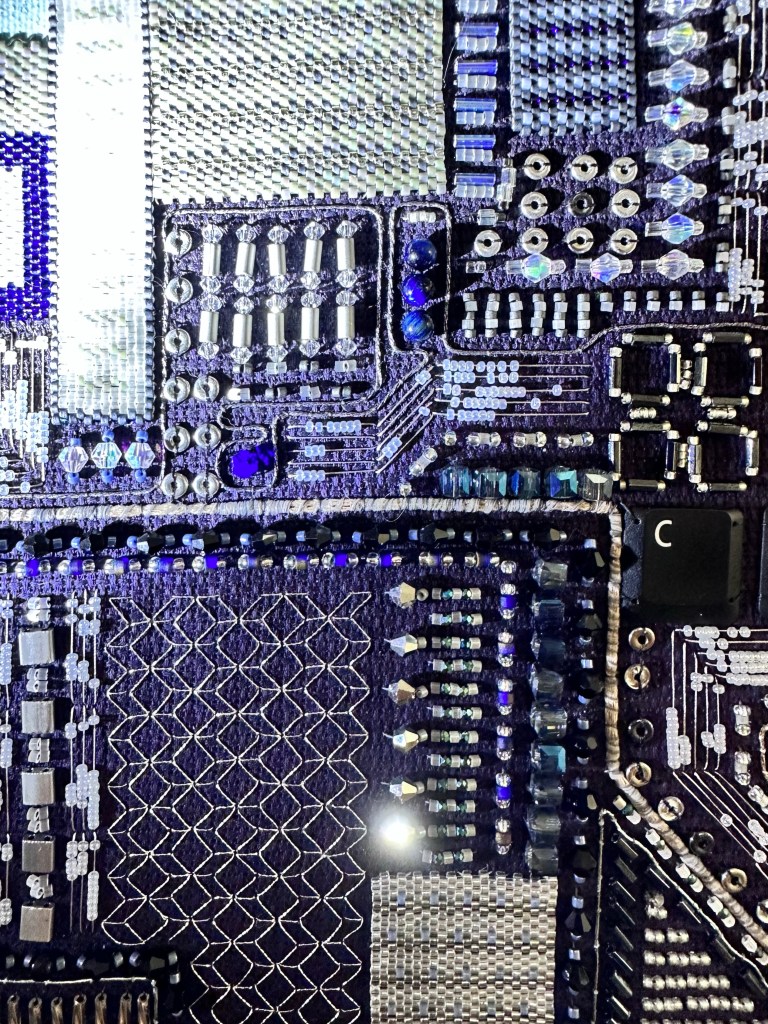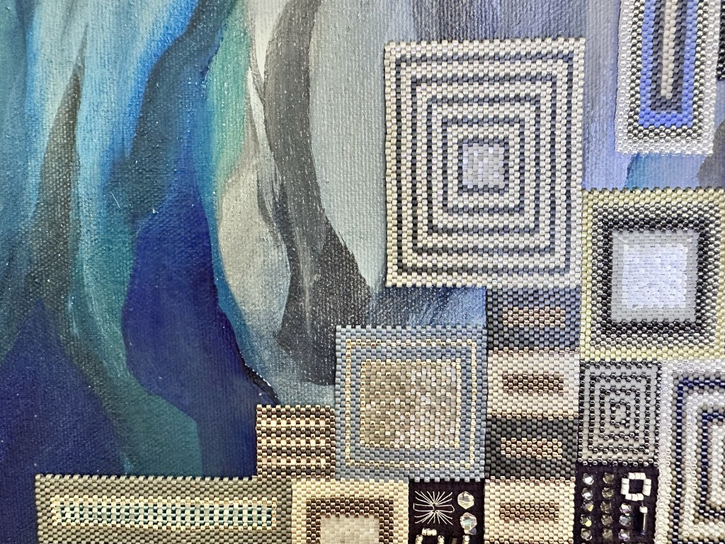 山 [systemrelevant] and 山 [cloud] are 2 artworks interplaying with nature and technology. The grandeur of the towering, icy-blue mountains, painted with fluid brush strokes, contrasts dramatically with the intricate, geometric patterns of the “electronic embroidery” below.
