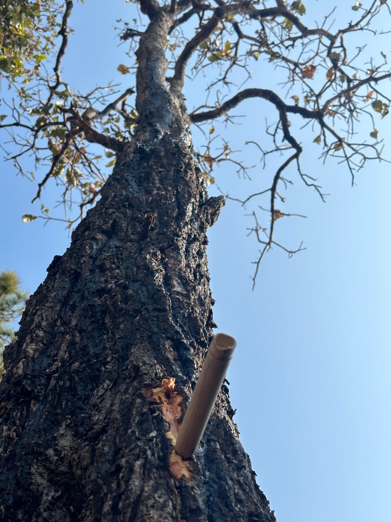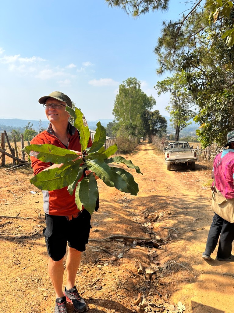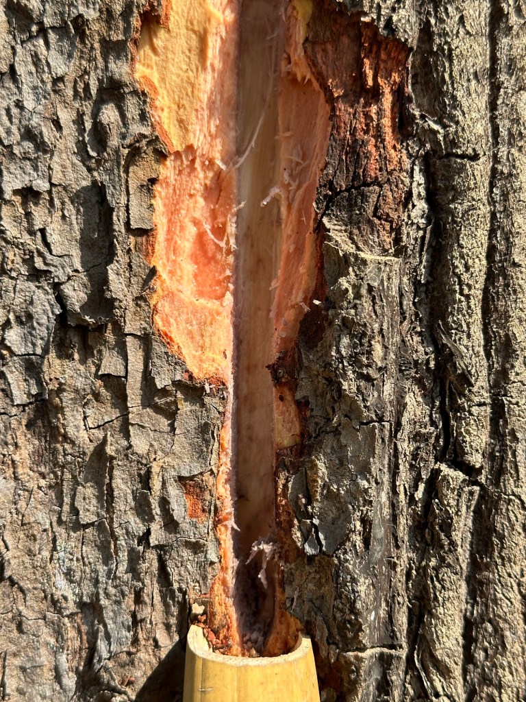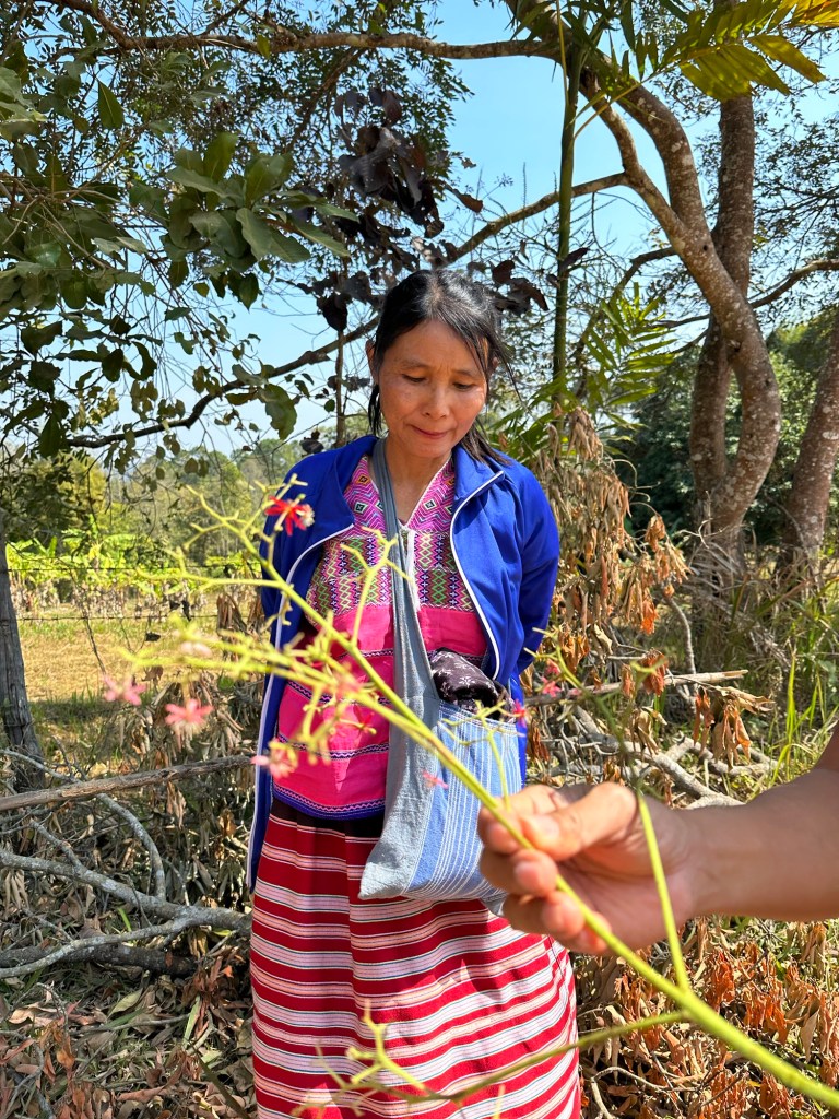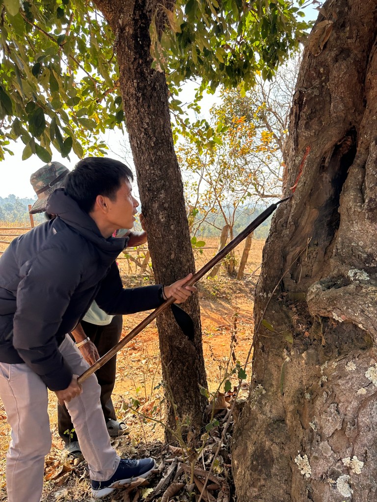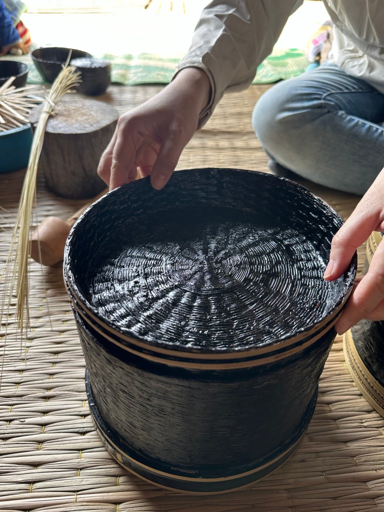 My adventure began with a visit to Phumrapee Kongrit, a revered Thai artist and professor at Chiang Mai University. He’s not only a maestro of traditional Thai lacquer techniques but also a guardian of the Toxicodendron vernicifluum trees – the living wellsprings of natural lacquer. A trip to Omkoi with Phumrapee and fellow conservators opened my eyes to the Kerens people’s sustainable harvesting practices. They care for the trees, using lacquer for waterproofing woven bamboo dishes, as medicine, and in crafting jewelry such as bracelets. Witnessing the careful tapping of the trees’ sap, collected drop by precious drop in bamboo vessels, was an encounter with the pure essence of nature.