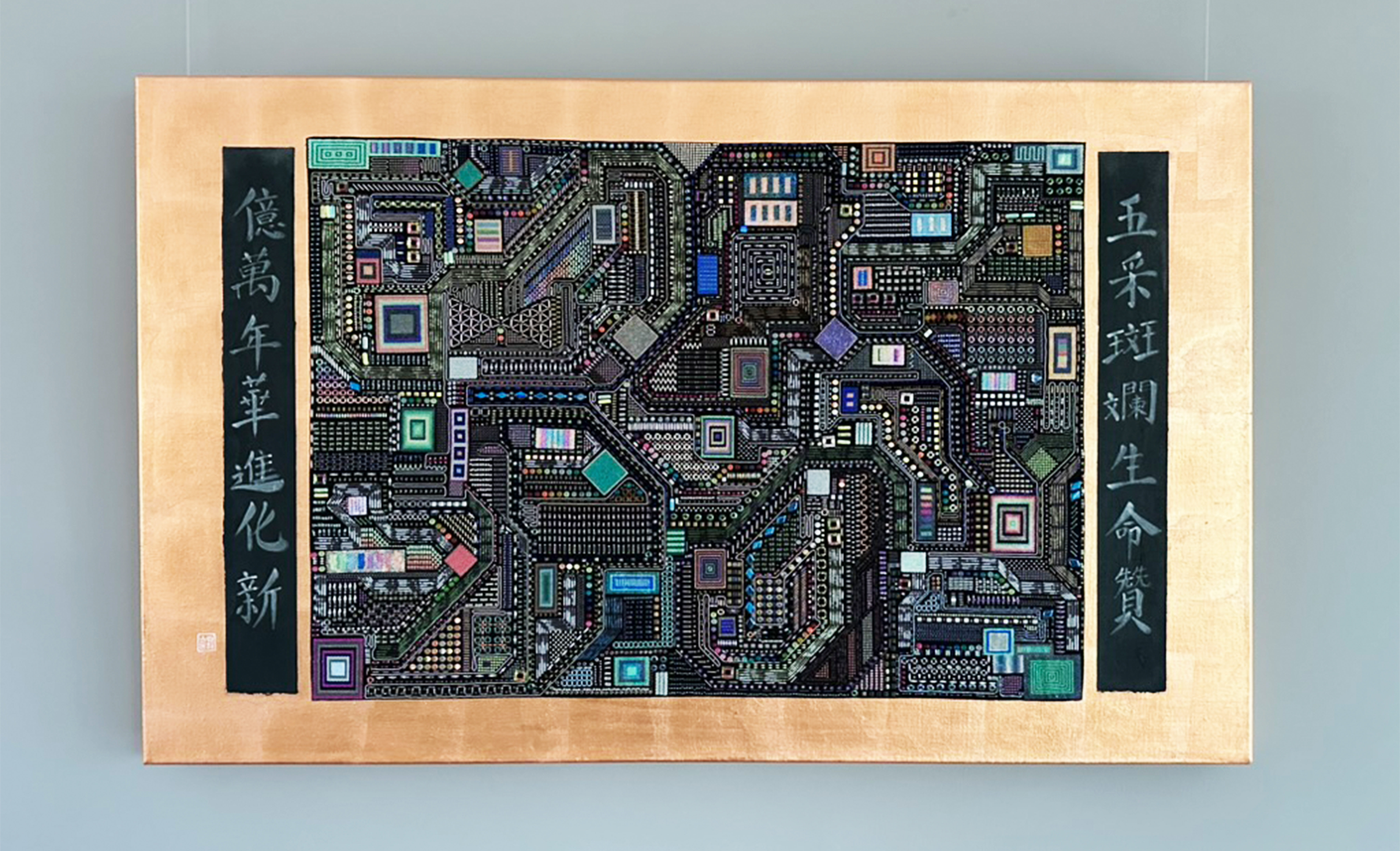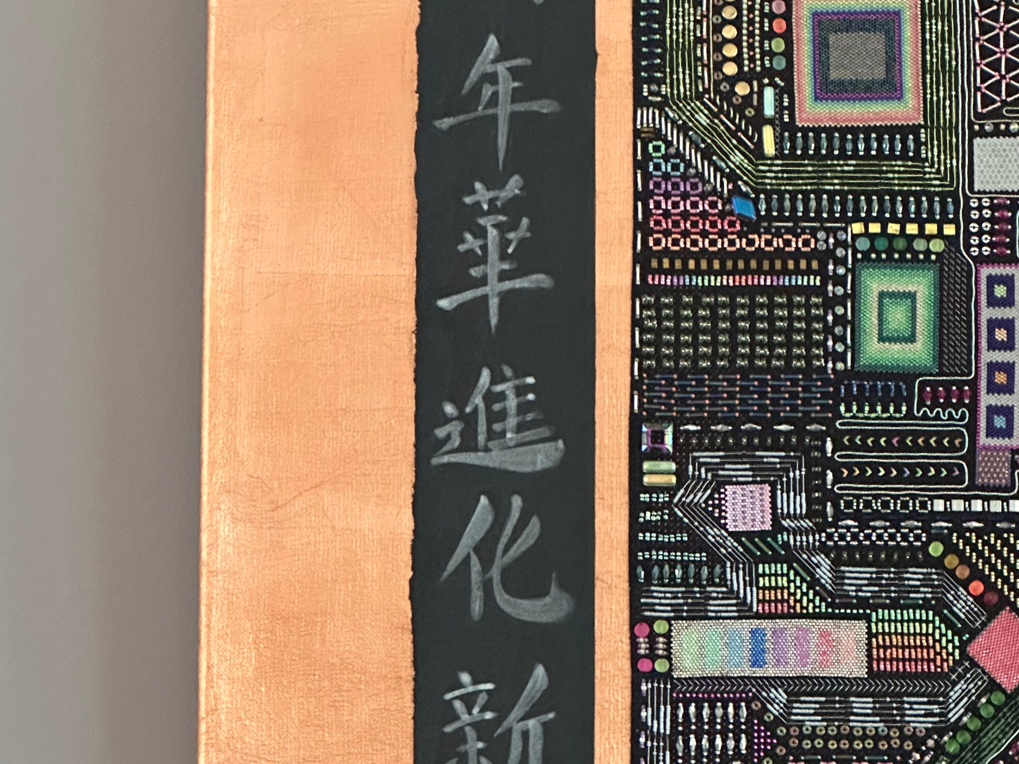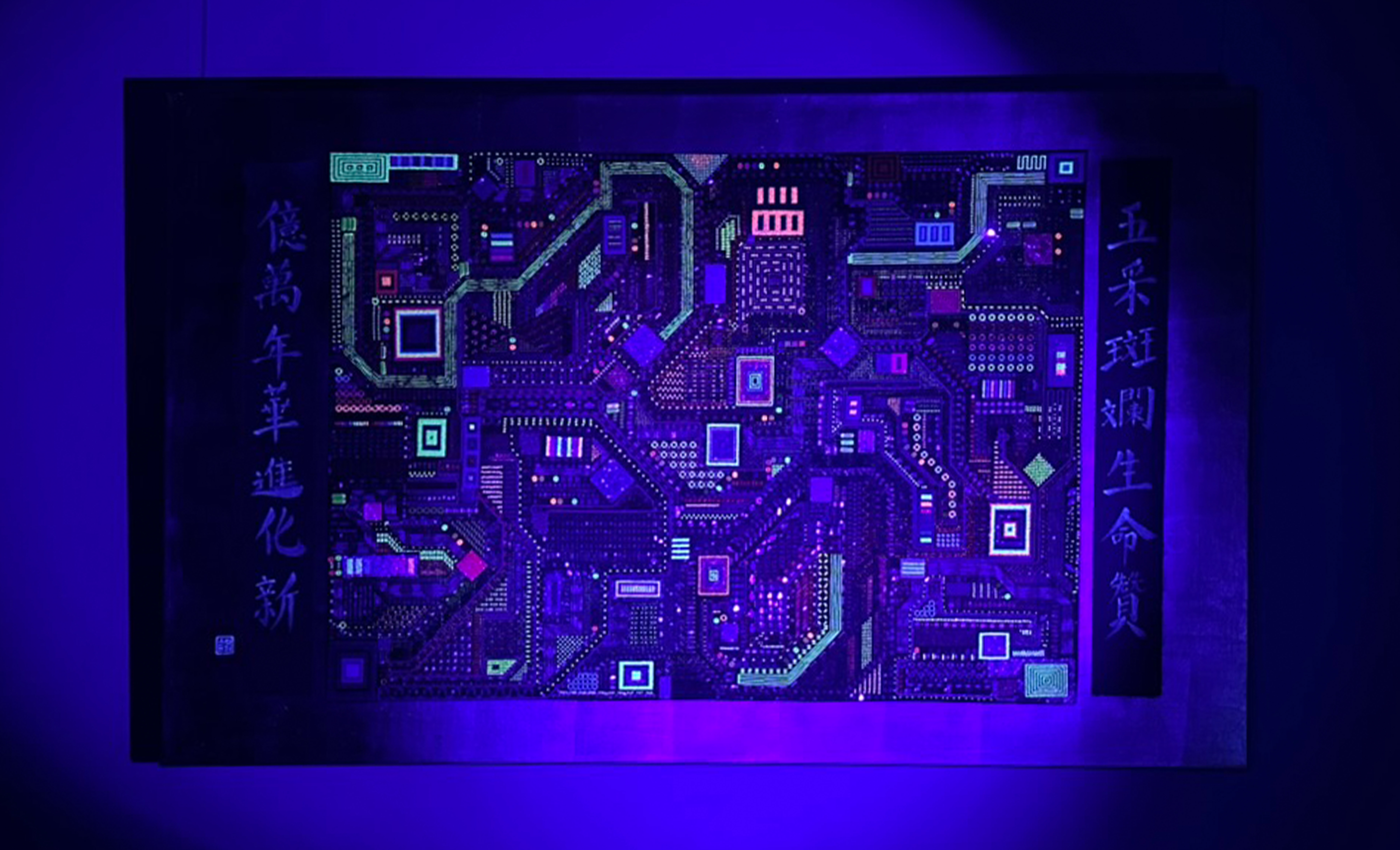 Under black light, the embroidery reveals another dimension, with fluorescent colors bringing a hidden pattern to life. The illuminated grid embodies the concept of constant evolution and reinvention, as the duilian suggests.
