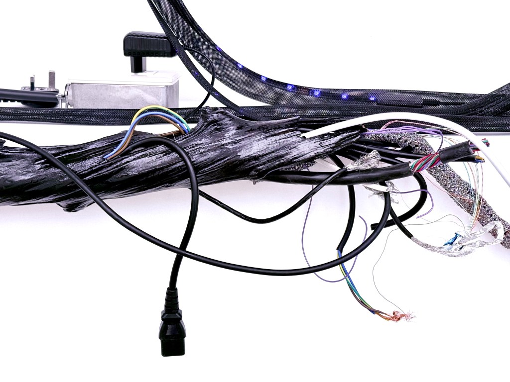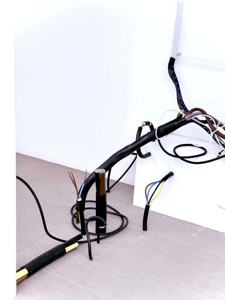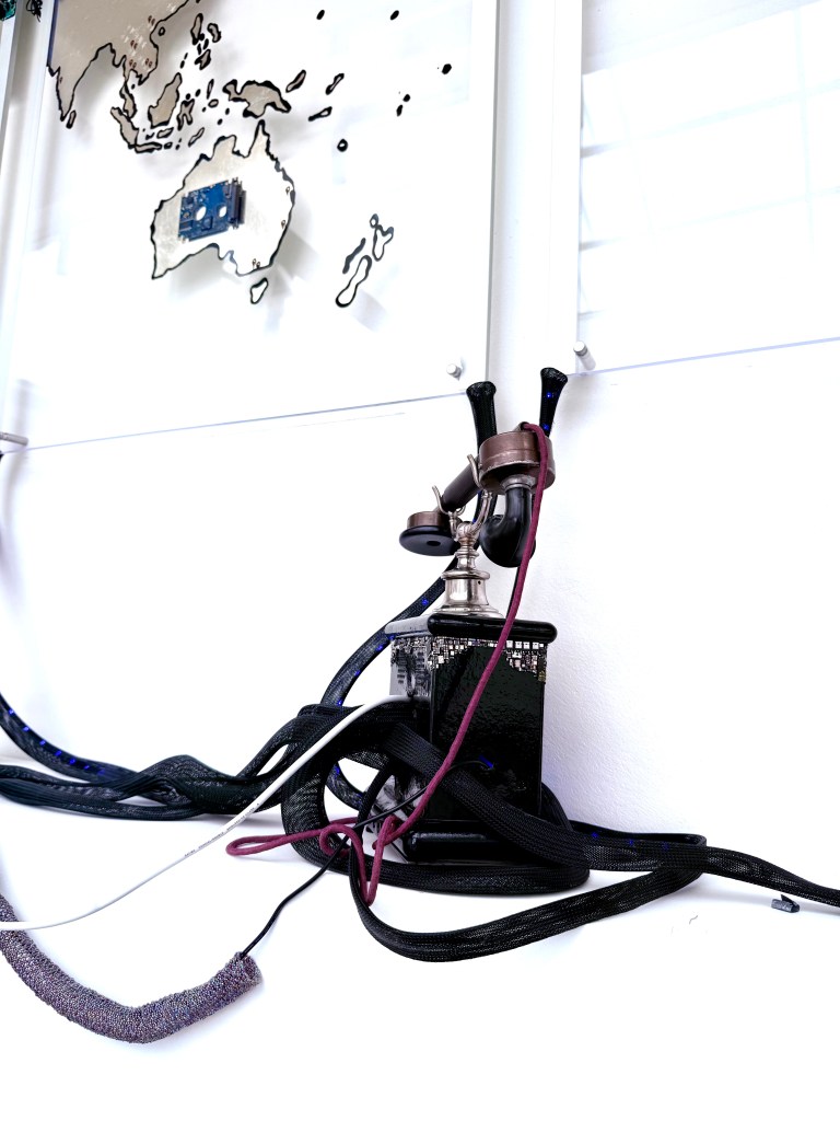 Cables, both functional and symbolic, snake across the installation like roots or arteries, emphasizing the interconnectedness of natural and technological systems. Some cables are severed or reconnected, symbolizing the fragility and resilience of these networks. The cables converge into black tubes housed within an antique telephone casing, merging past and present modes of communication. This juxtaposition reflects how technological advancements are built upon historical foundations, while also reminding us of the complexities and vulnerabilities of global networks.