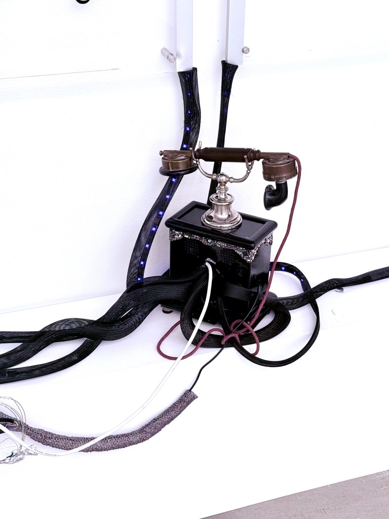 Various cables run through the installation, including telephone wires, high-power current cables, and other industrial materials. These cables connect to an antique telephone casing from the early 20th century, which houses the LED control system. This fusion of old and new technologies underscores the theme of evolving communication and its impact on cultural networks.