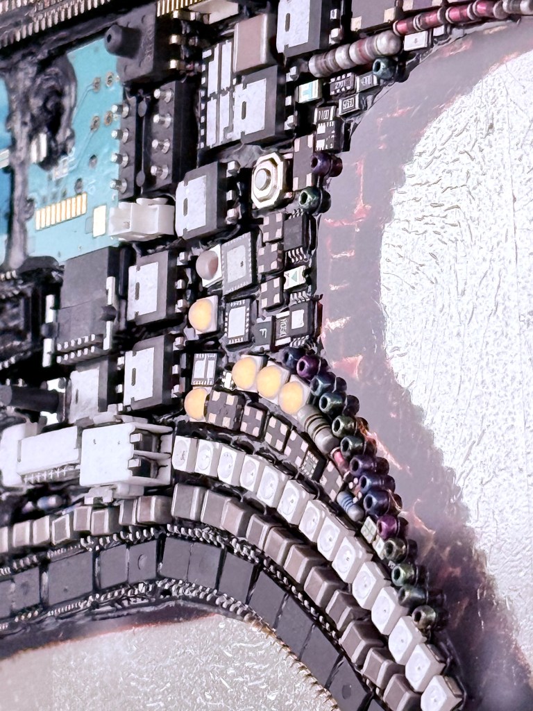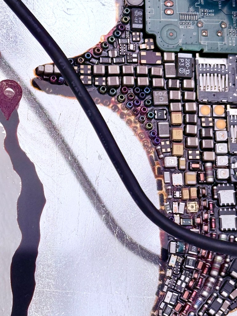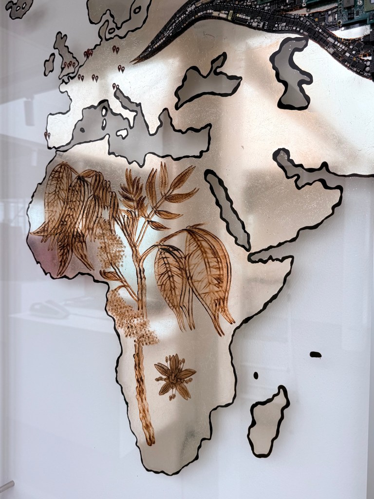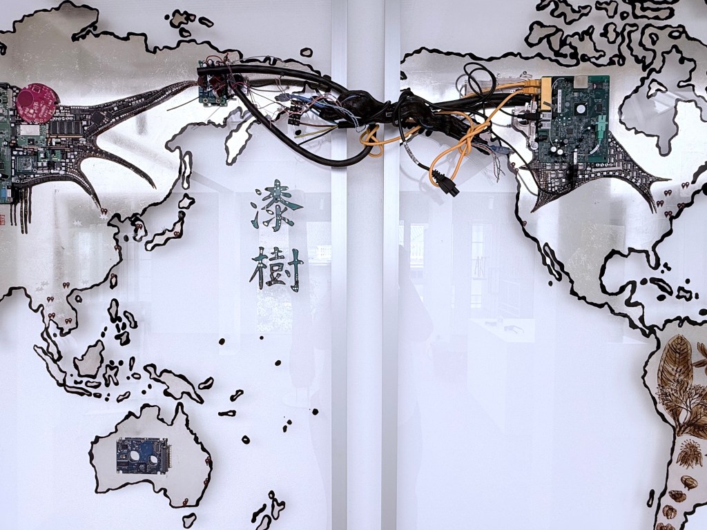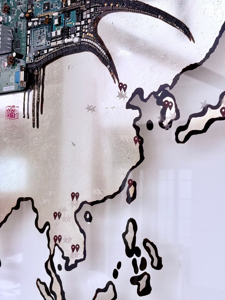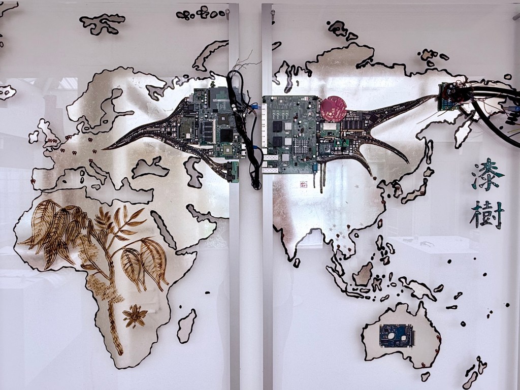 The installation consists of three interconnected panels made from light-diffusing acrylic glass. These panels, each measuring 130 cm by 80 cm, are coated with silver and champagne gold leaf inside the continents and painted with Thai tree lacquer (Rak) sourced from the Omkoi region in northern Thailand. On their surfaces, small, discarded computer parts—sourced from the Electronics Manufacturing Company Bluechips in Chiang Mai and dismantled components from an old Cisco router and MacBook—are embedded within the lacquer. These elements symbolize the intersection of craftsmanship and technological waste, transforming discarded materials into a commentary on interconnectedness.