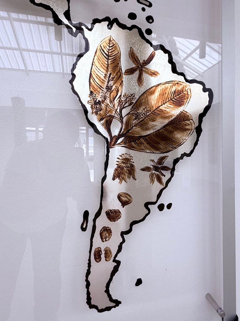 The continents themselves tell layered stories. Africa, for instance, is adorned with botanical illustrations of Toxicodendron succedaneum, a lacquer tree native to Asia, symbolizing the untapped potential of regions like Africa in global lacquer traditions. South America features Gluta usitata, bridging ecological and cultural connections across continents. These elements highlight the interwoven narratives of ecology, tradition, and human agency.