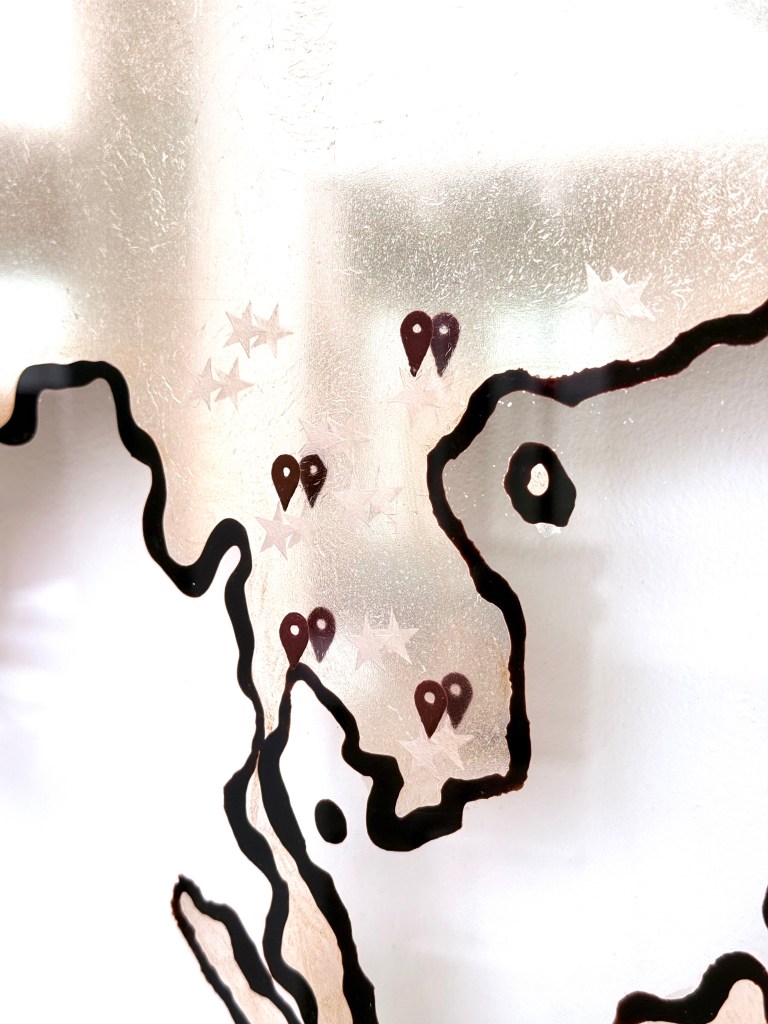 Engraved stars further adorn the panels, symbolizing historical lacquer hotspots, while lacquered pins highlight museums housing significant lacquer collections. A linked Google MyMap enhances the installation’s digital interactivity, displaying publicly accessible knowledge about lacquer traditions and artifacts. However, it also underscores the gaps in this information—a metaphor for the filtered and fragmented flow of knowledge in the digital age.