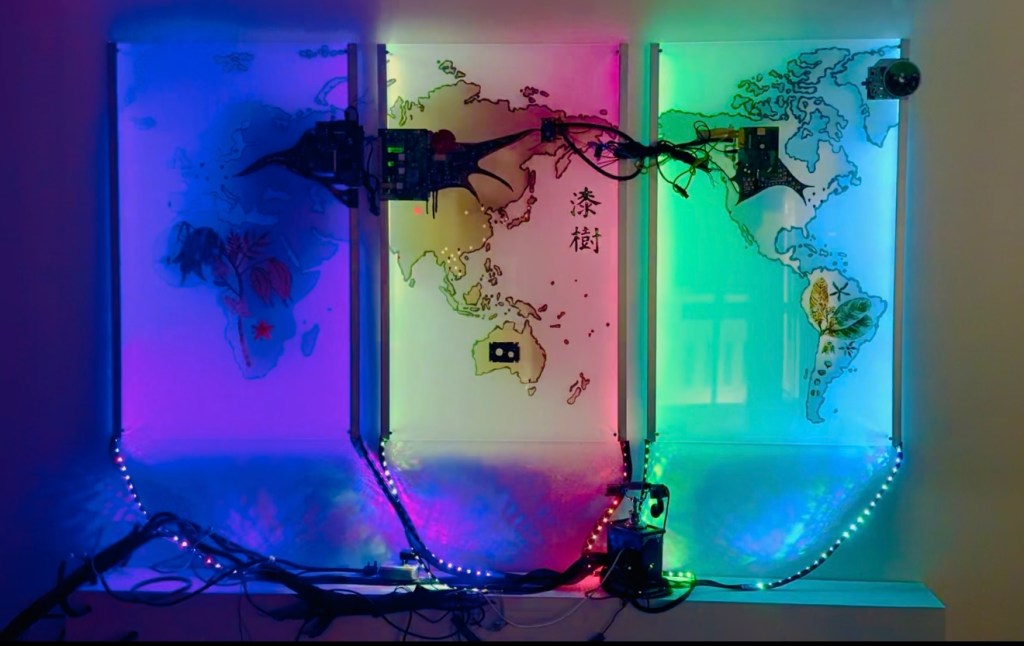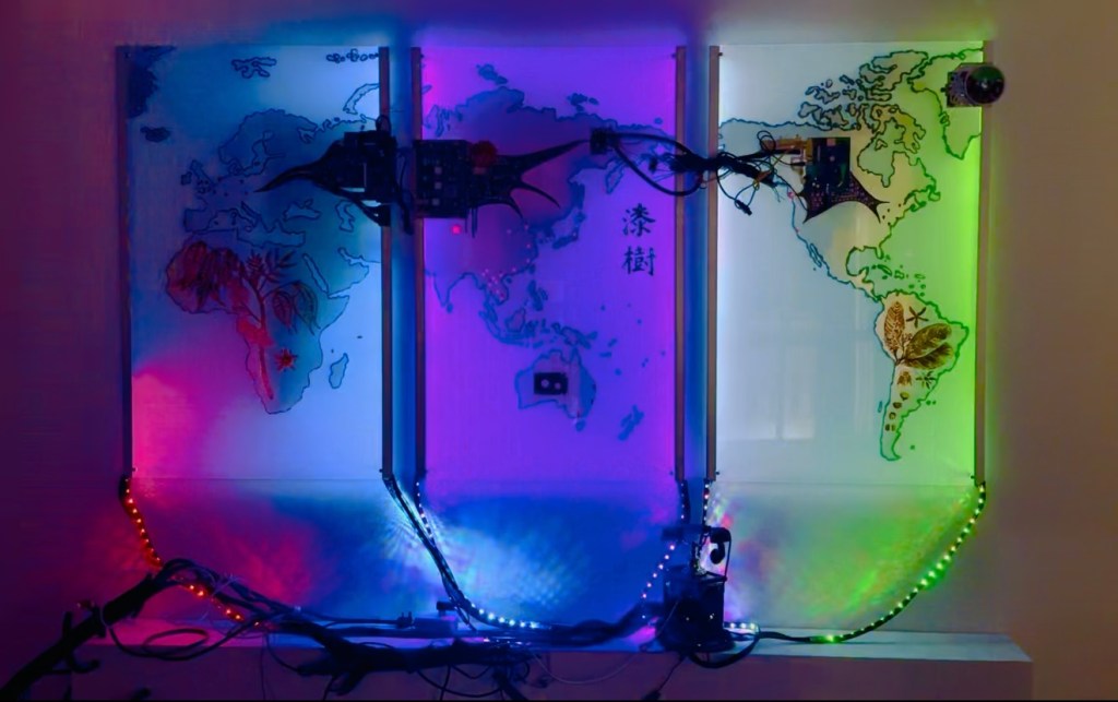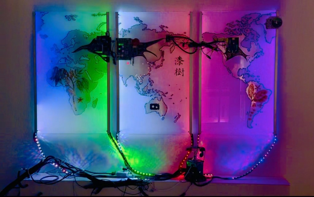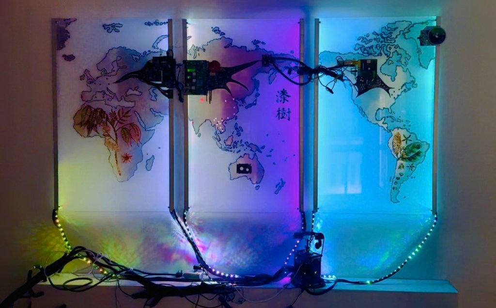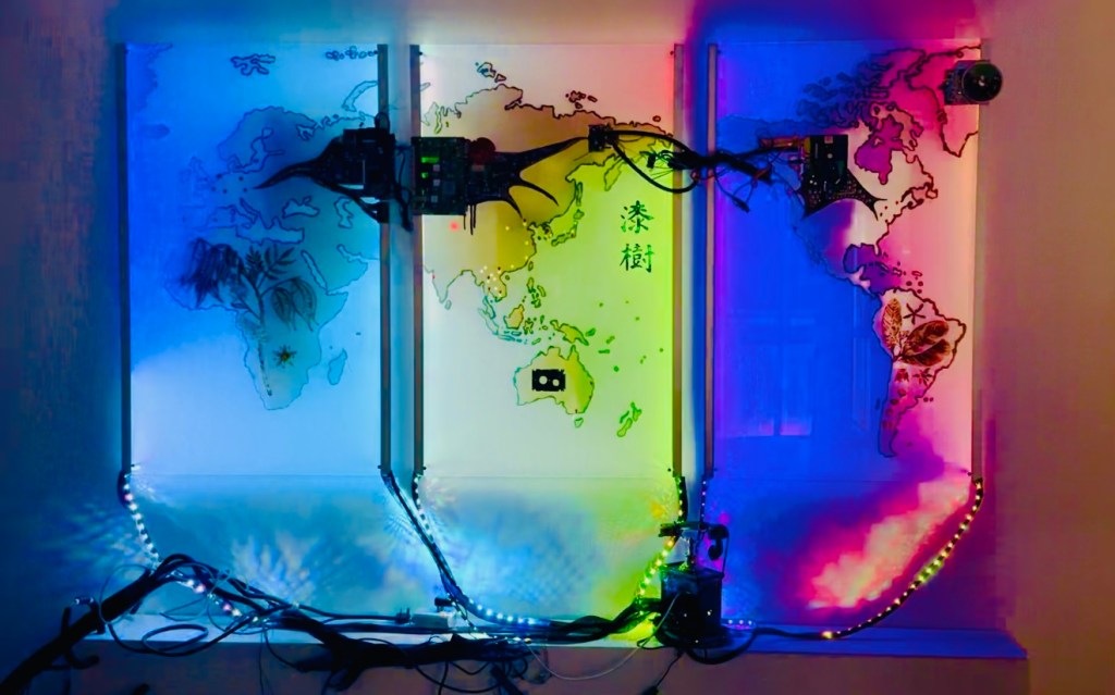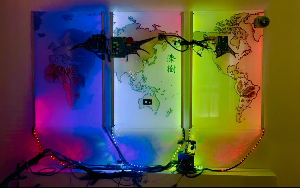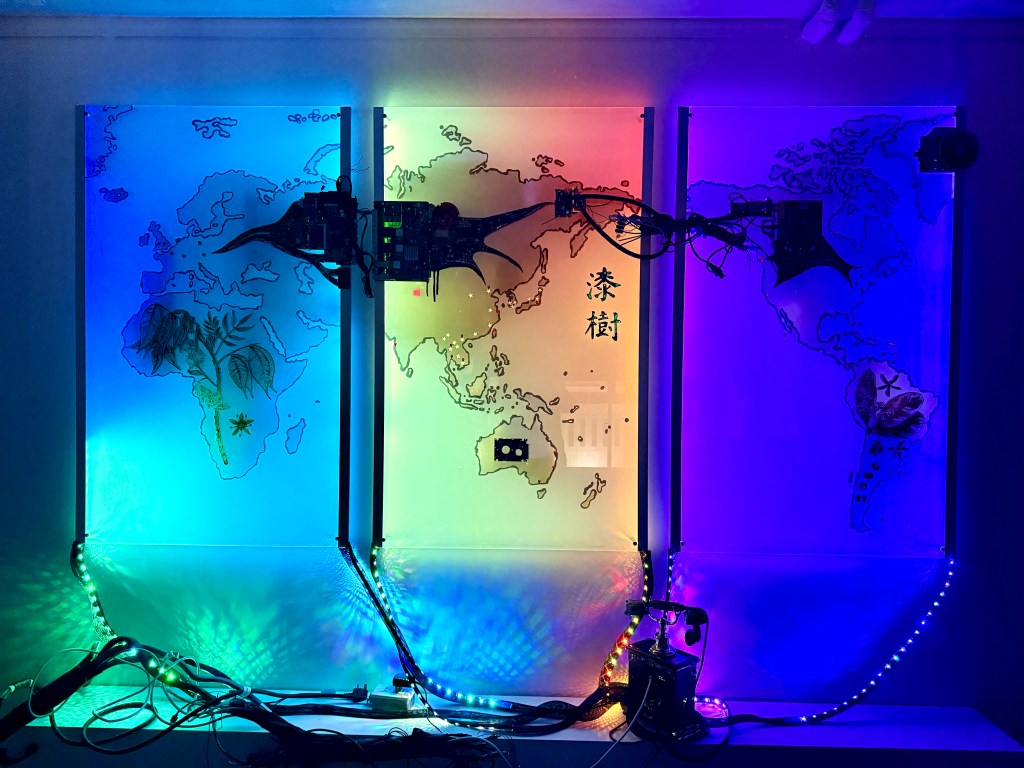 This installation is more than a visual experience; it is an invitation to engage. It asks viewers to consider the intricate threads that connect us—geographically, historically, and technologically. The artwork underscores the ecological importance of tree lacquer and its cultural dissemination, urging a reflection on sustainability, heritage, and the evolving role of technology in shaping our understanding of the world.
