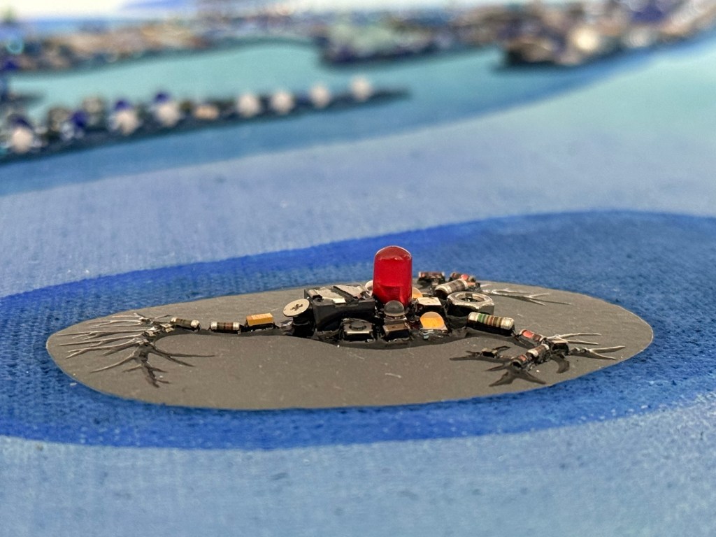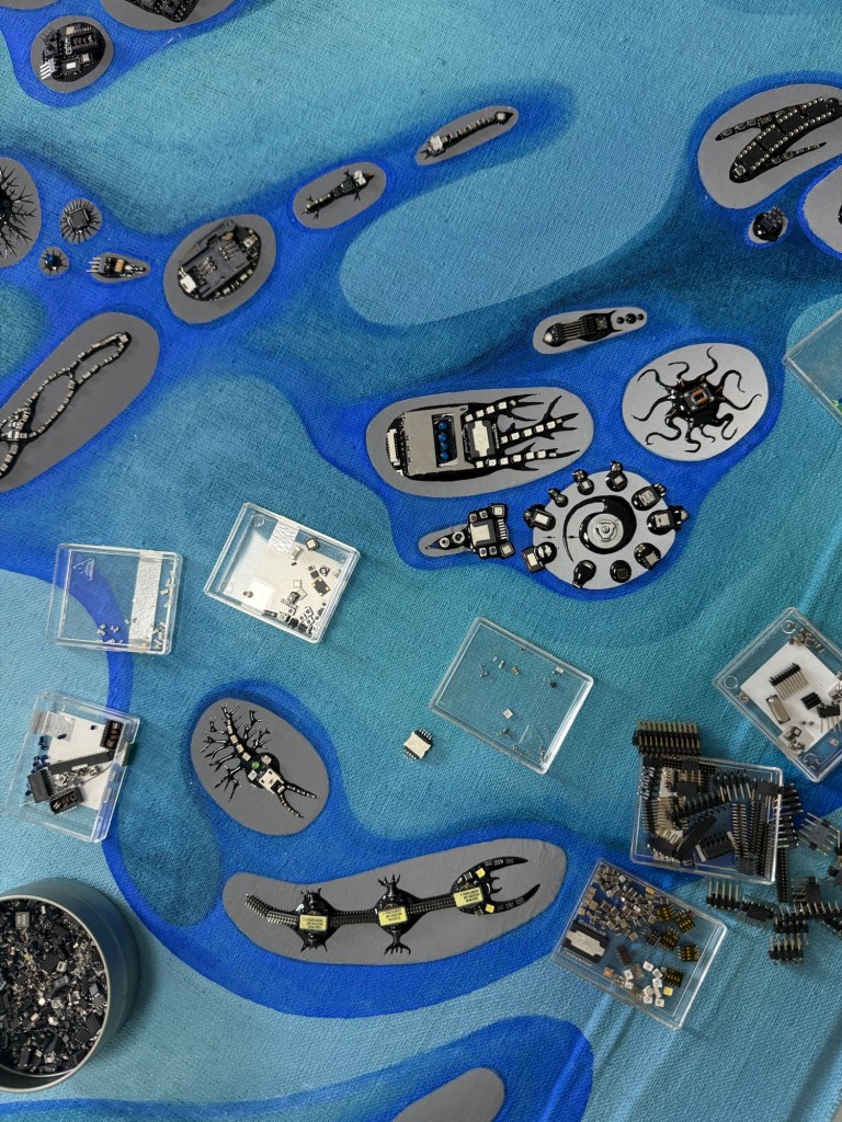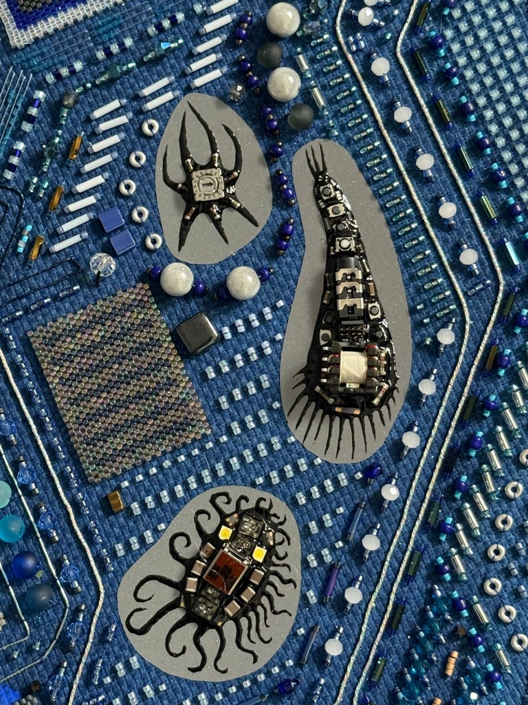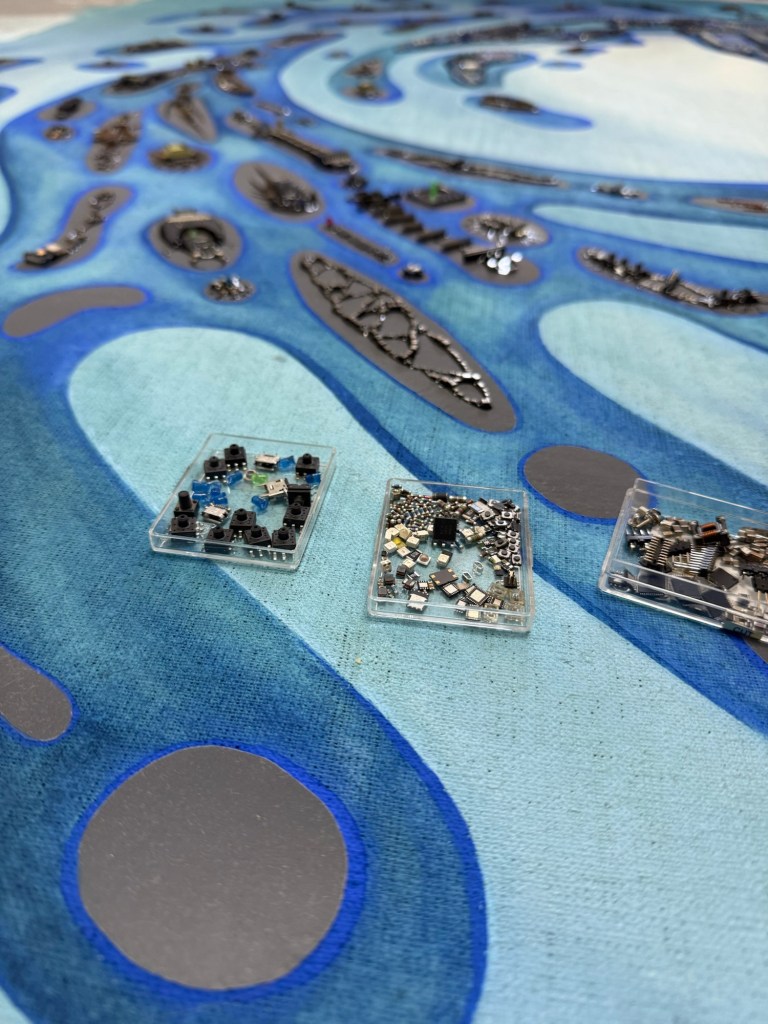 At its core lies a hand-embroidered nucleus, woven from blue beads with great care and patience. This central circle symbolizes primal trust—a deep, stable place from which change can unfold. From here, the forms spiral outward, becoming ever more dynamic. Within these shapes, recycled Bluechips hardware, encapsulated in Thai lacquer (rak) from Gluta usitata, morphs into microbe-like figures—each one a messenger of human evolution and ingenuity.