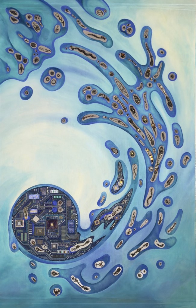 This nucleus also carries a personal resonance: it represents the work and legacy of Sabine and Thomas Zimpfer, who shaped and supported the development of the Bluechips Microhouse with dedication and vision. The artwork was created as a farewell gift—anhomage to their contribution. With the transition of Bluechips into the hands of Zollner Elektronik AG, a new chapter begins. The company now enters a larger dimension of evolution, grounded firmly in the foundation laid by the Zimpfer family. What once was the center nowradiates outward—like the spiral itself—into the future.