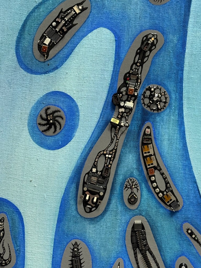 The tiny hybrid creatures throughout the piece remind us that the future is born from fragments of the past. They are markers of movement and metamorphosis, echoing nature’s own cycles of decay, renewal, and growth. The Thai lacquer not only preserves but heals; the embroidery weaves connections like DNA strands; the cleats and ropes suspend the work in tension and balance, much like life itself.